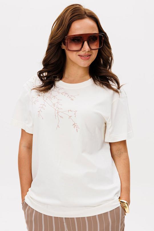 Блуза свободного силуэта выполнена из тонкого трикотажного полотна. Горловина круглая. Рукава одно шовные втачные. Украшением служит декоративная печать.