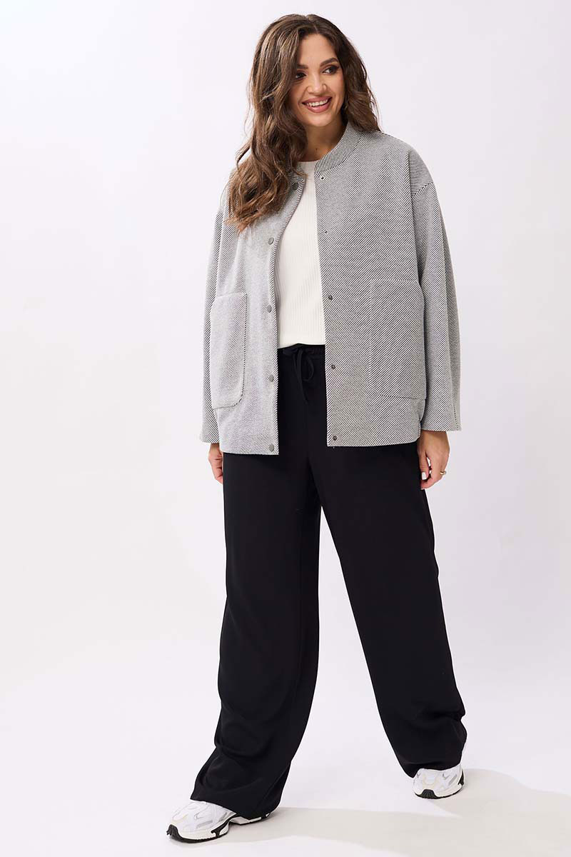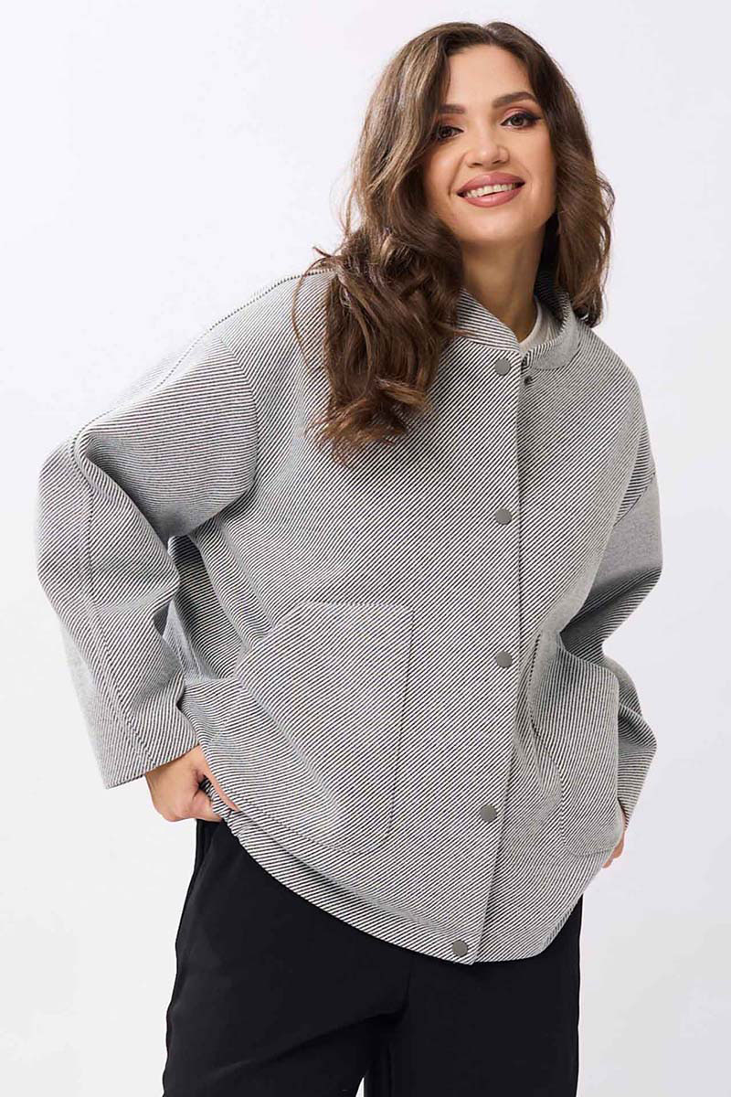 Женский жакет выполнен из мягкой, пальтовой ткани что придаёт изделию универсальность и комфорт. Воротник-стойка. Застёжка: на пробивные кнопки. Рукава со спущенной проймой втачной, двухшовный. В изделии предусмотрены накладные карманы на передней части. Эластичная резинка по нижнему краю жакета создаёт лёгкую сборку, что подчёркивает силуэт и обеспечивает дополнительное удобство. Жакет на подкладке.