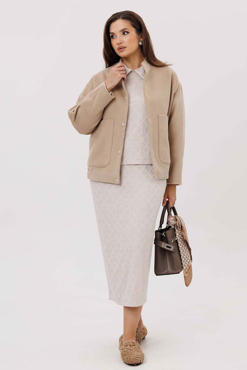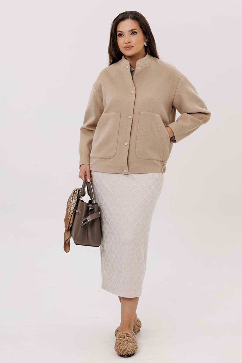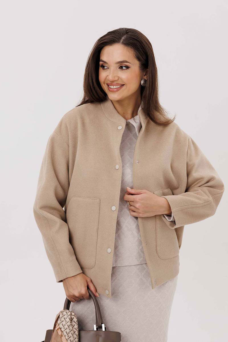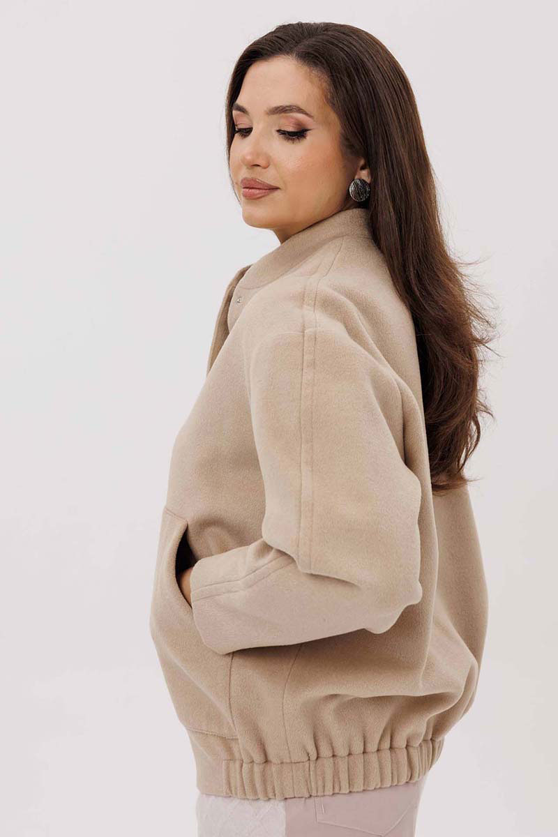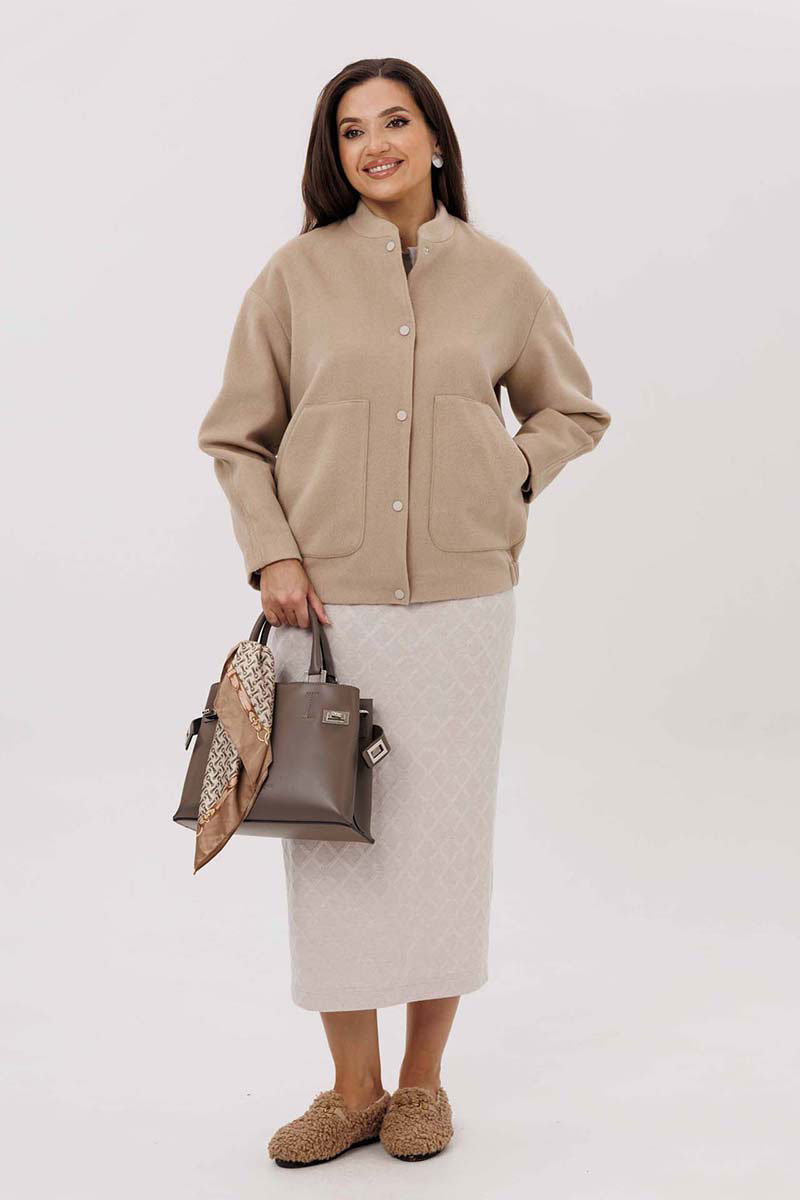 Женский жакет выполнен из мягкой, пальтовой ткани что придаёт изделию универсальность и комфорт. Воротник-стойка. Застёжка: на пробивные кнопки. Рукава со спущенной проймой втачной, двухшовный. В изделии предусмотрены накладные карманы на передней части. Эластичная резинка по нижнему краю жакета создаёт лёгкую сборку, что подчёркивает силуэт и обеспечивает дополнительное удобство. Жакет на подкладке.