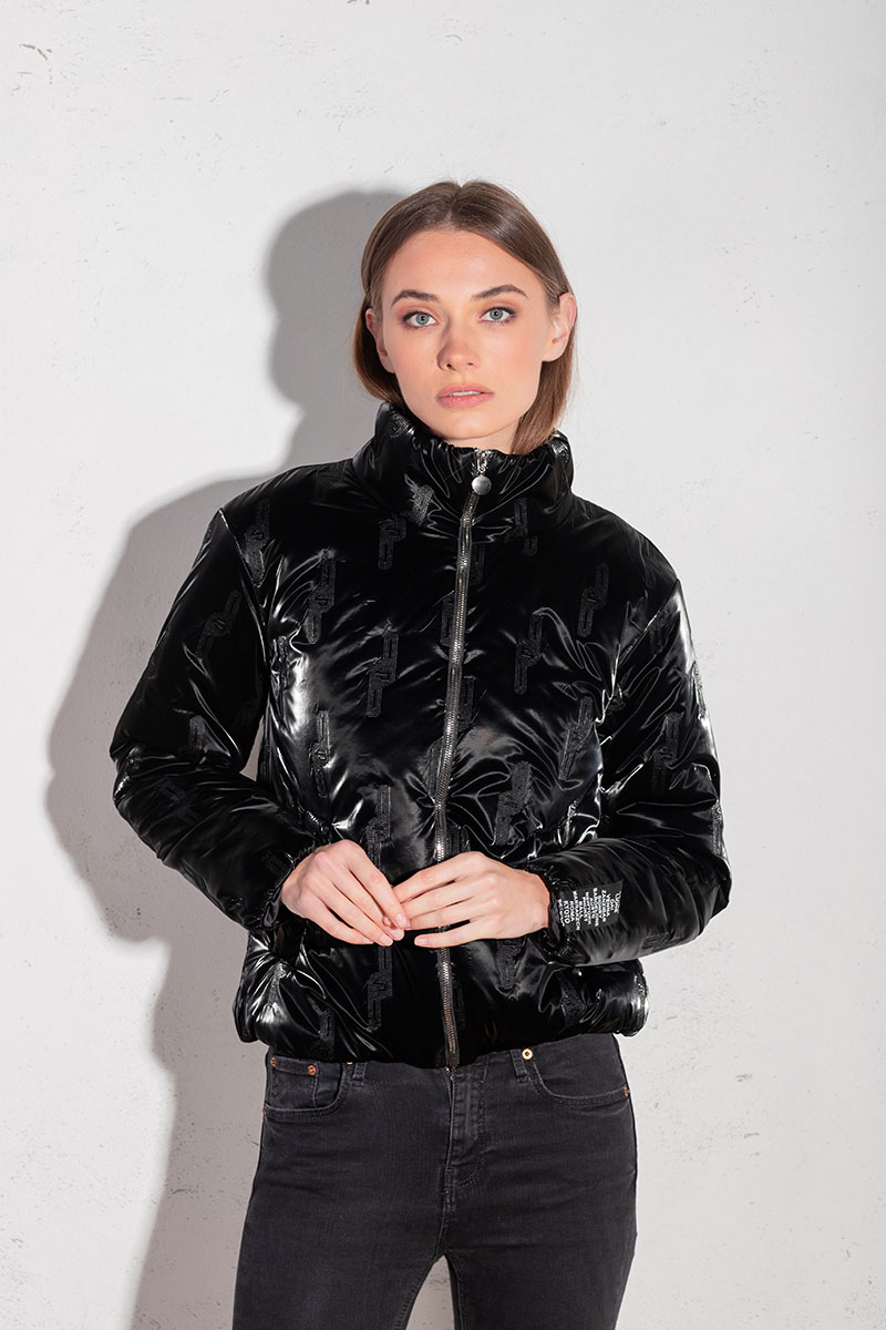 Куртка женская утеплённая осень-зима, укороченная, свободного силуэта, со спущенными плечами, выполнено из ткани лаке на утеплителе изософт. По переду прорезные карманы с листочкой и застёжка молния. Воротник стойка. Рукава одно шовные втачные. Низ куртки и низ рукавов собран на эластичную тесьму резинку. Подкладка простёгана с утеплителем.