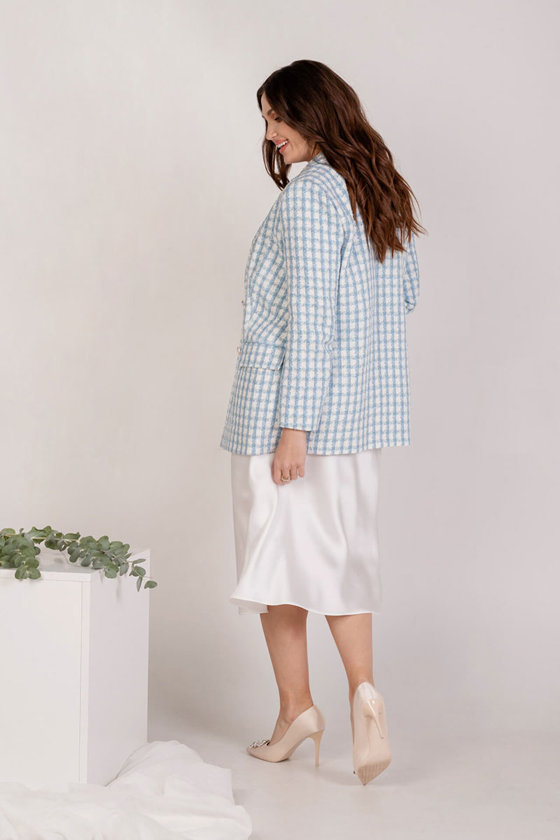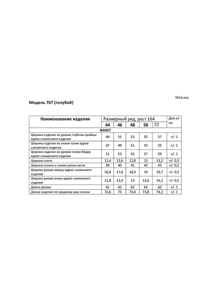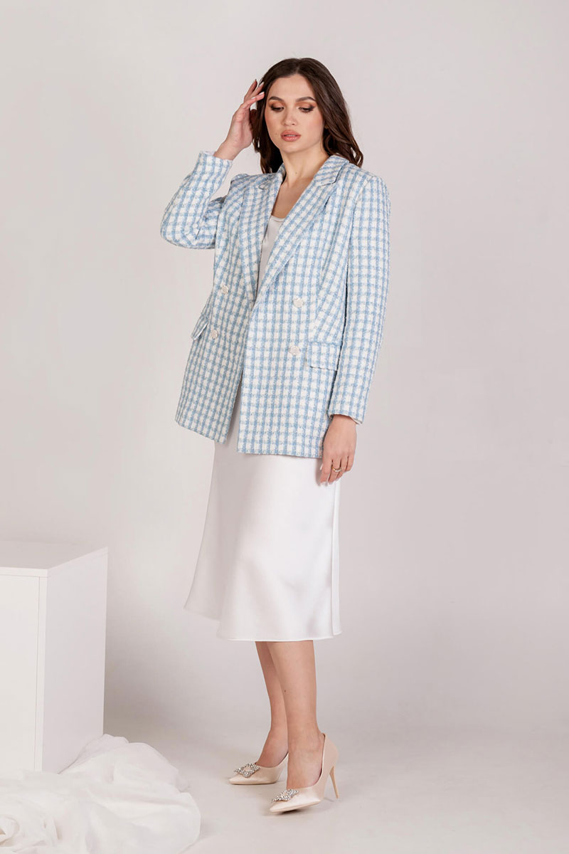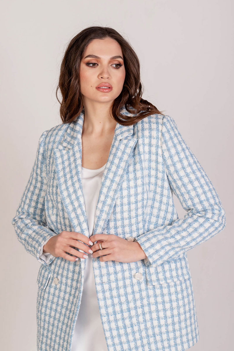 Жакет двубортный, полуприлегающего силуэта, удлинённый, с центральной застёжкой на четыре прорезные петли и пуговицы, выполнен из костюмной ткани. Перёд жакета с талевыми вытачками и прорезными карманами и клапанами. Воротник отложной с лацканами классической формы. Спинка со средним швом. Рукава втачные двух шовные. Жакет на подкладке.