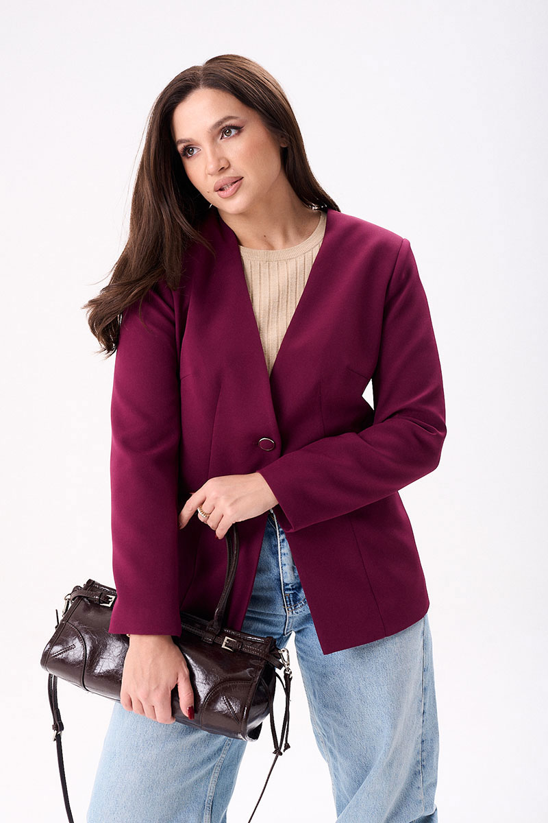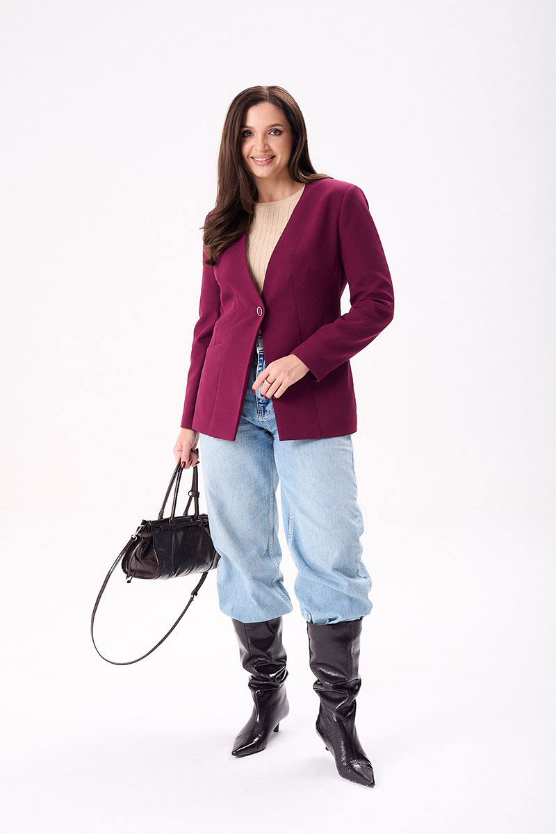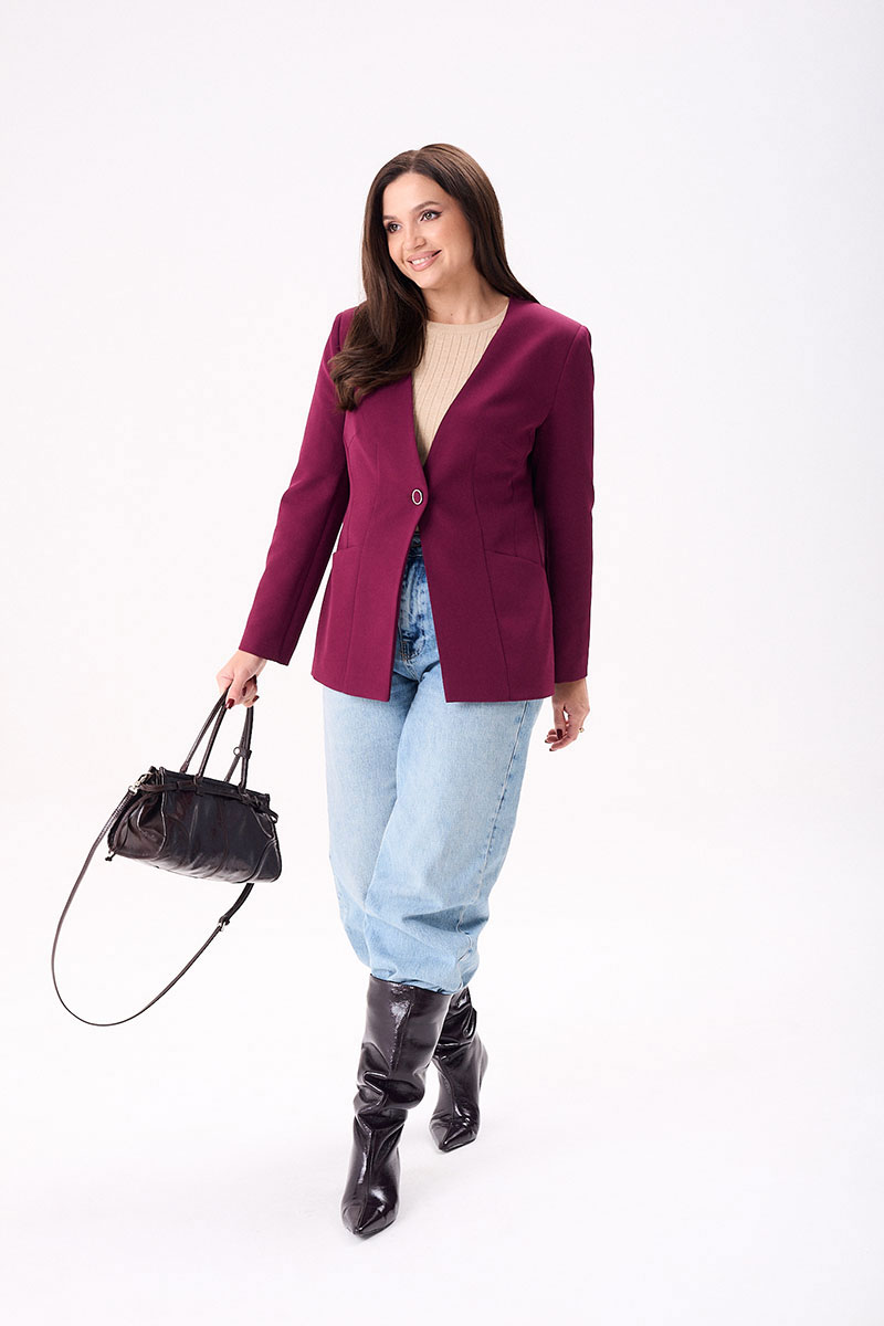 Жакет женский полуприлегающего силуэта на подкладке, застёгивается на одну петлю и пуговицу. По переду нагрудные и талевые вытачки, боковой подрез и втачные карманы, а по спинке центральный шов и рельефы. Рукава двухшовные втачные.
