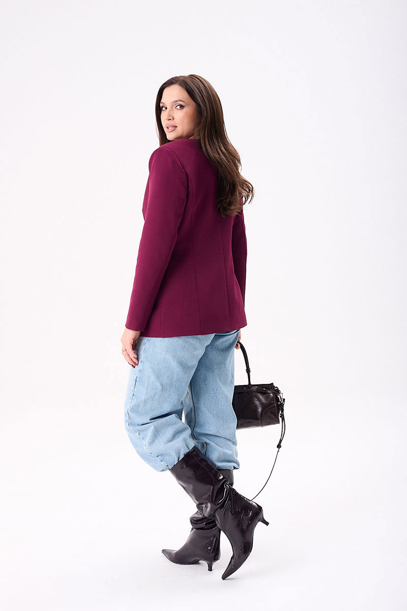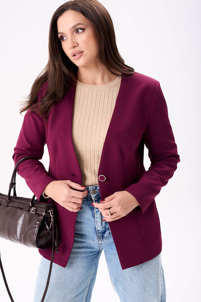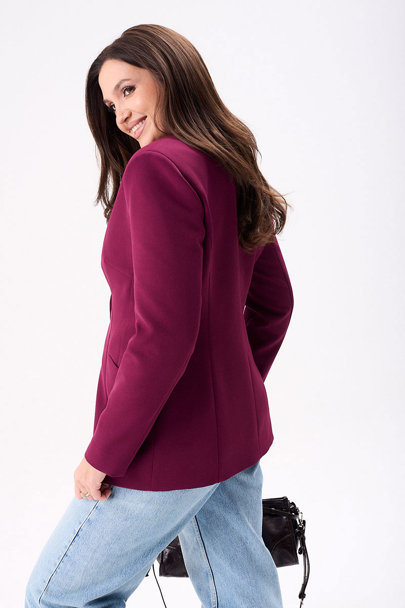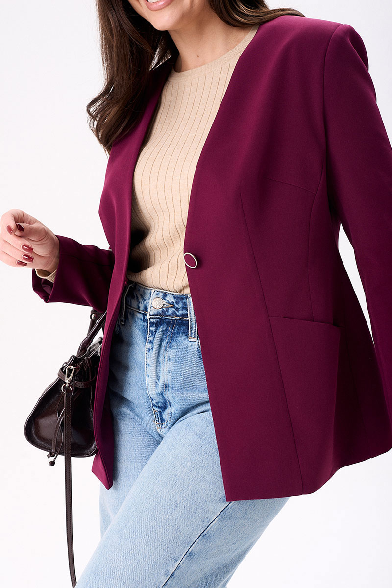 Жакет женский полуприлегающего силуэта на подкладке, застёгивается на одну петлю и пуговицу. По переду нагрудные и талевые вытачки, боковой подрез и втачные карманы, а по спинке центральный шов и рельефы. Рукава двухшовные втачные.
