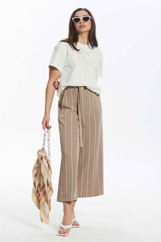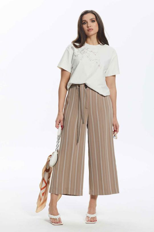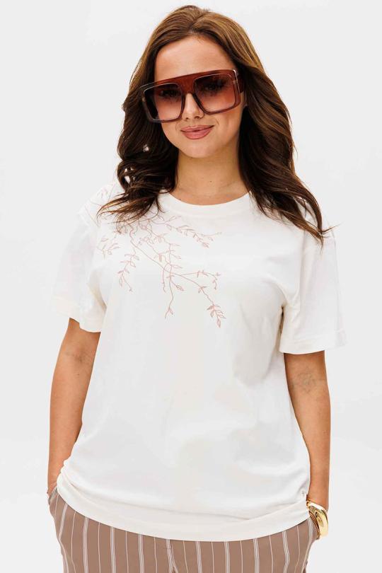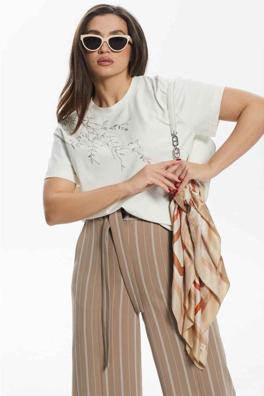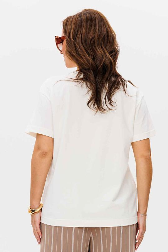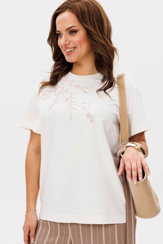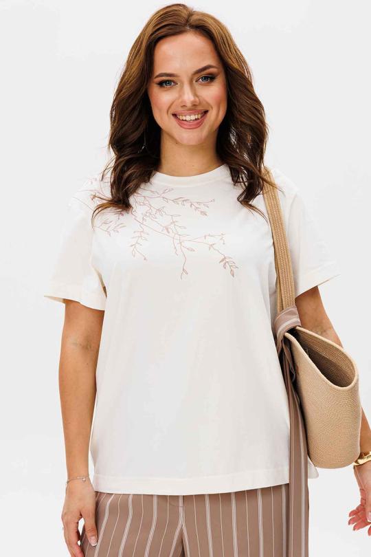 Блуза свободного силуэта выполнена из тонкого трикотажного полотна. Горловина круглая. Рукава одно шовные втачные. Украшением служит декоративная печать.