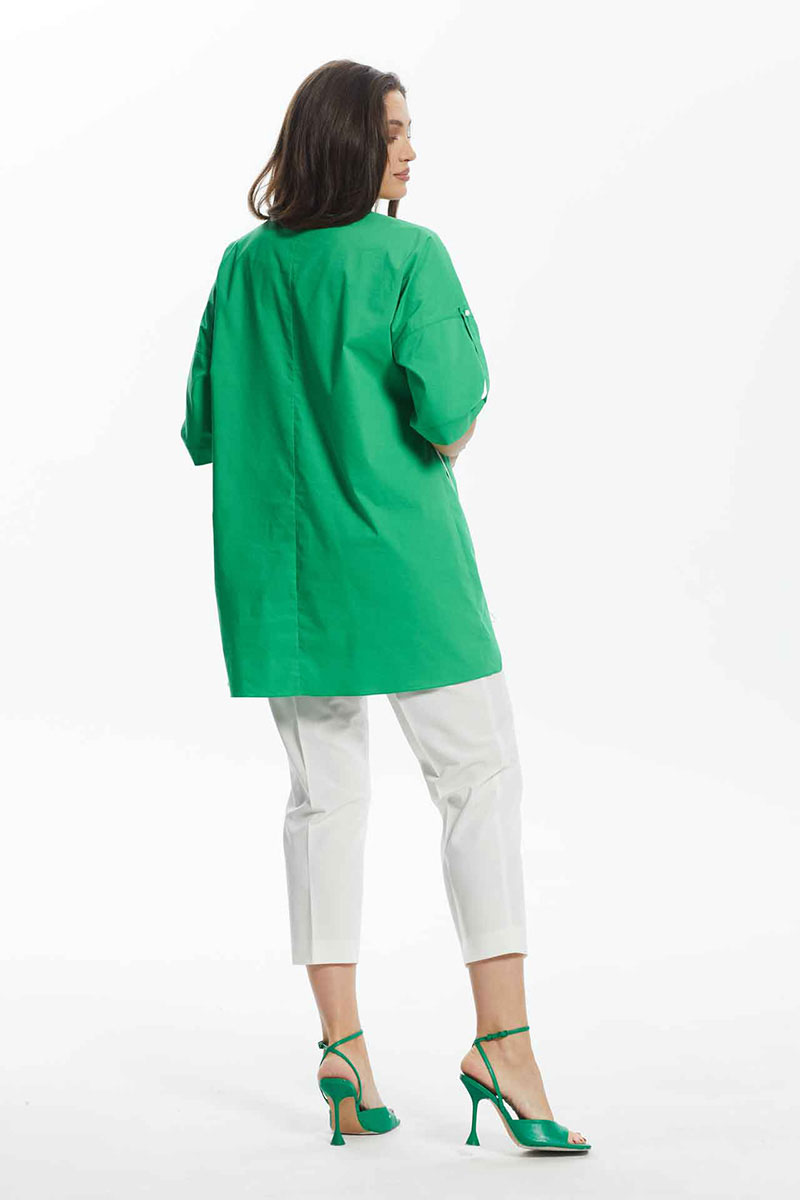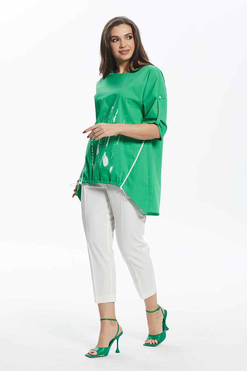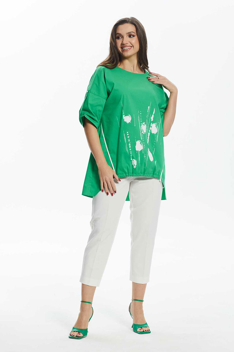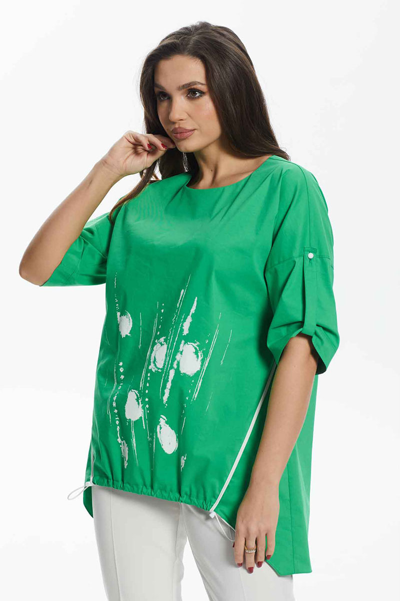 Блуза свободного силуэта со спущенными плечами, с разноуровневым низом. По переду декоративная печать. Полочка переда стягивается и фиксируется. По спинке центральный шов. Горловина круглая. Рукава одношовные втачные.
