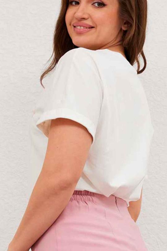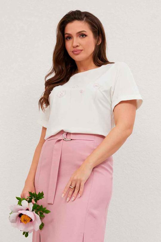 Блуза со спущенными плечами свободного облегания. В боковых швах небольшие разрезы. Украшением блузы служит декоративная печать.