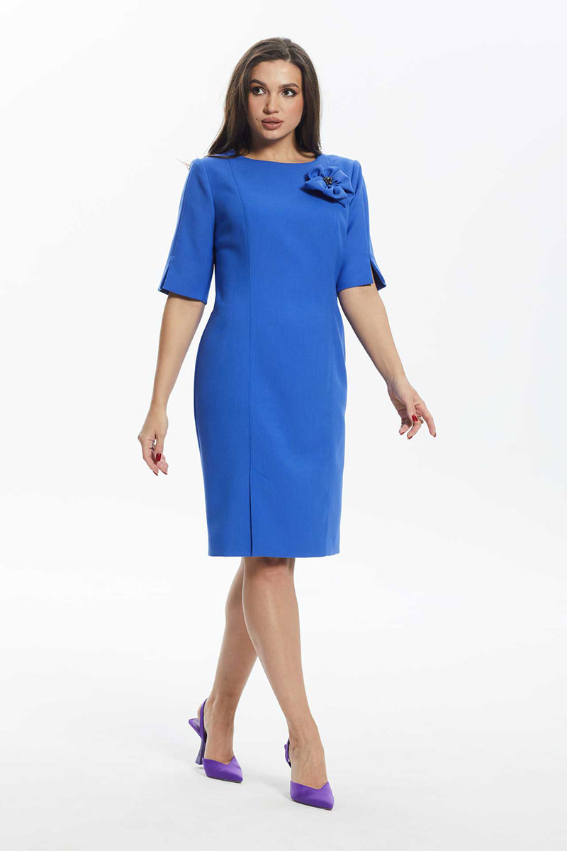 Платье женское полуприлегающего силуэта выполнено из плательной ткани. По переду рельефы от плеча до низа, один заканчивается шлицей с разрезом. По спинке талевые вытачки и застёжка потайная тесьма молния в центральном шве спинки. Рукава двух шовные втачные с разрезами. Горловина круглая. Платье без подкладки. Украшением служит декоративная брошь ручной работы.