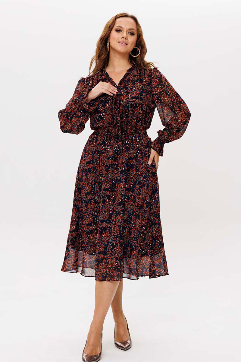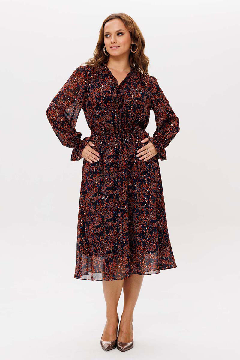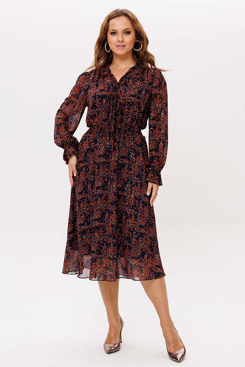 Платье женское свободного силуэта, отрезное по линии талии, расклешённое к низу, выполнено из ткани шифон. По линии талии сборка на резинку «венгерку». Горловина v-образная с небольших рюшей по переду до линии талии на завязках. Рукава одношовные втачные, по низу сборка на резинку «венгерку». Платье на тонкой трикотажной подкладке.