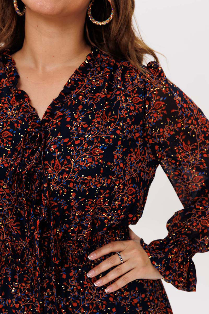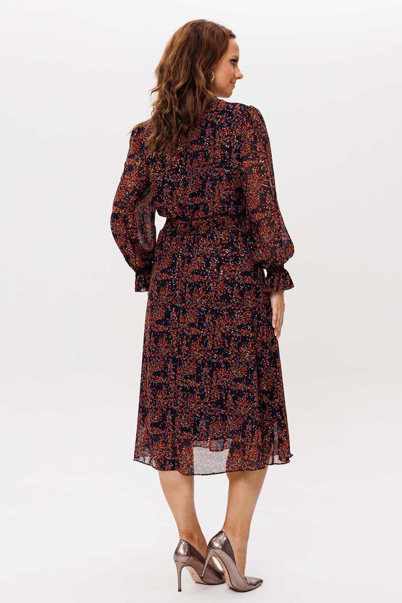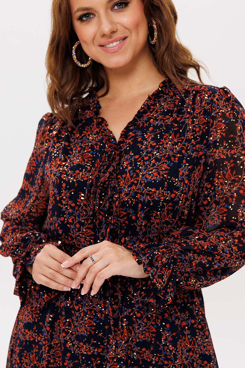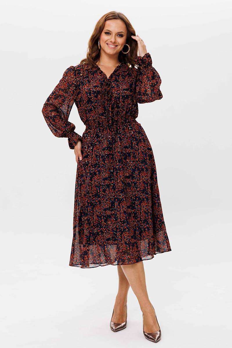 Платье женское свободного силуэта, отрезное по линии талии, расклешённое к низу, выполнено из ткани шифон. По линии талии сборка на резинку «венгерку». Горловина v-образная с небольших рюшей по переду до линии талии на завязках. Рукава одношовные втачные, по низу сборка на резинку «венгерку». Платье на тонкой трикотажной подкладке.