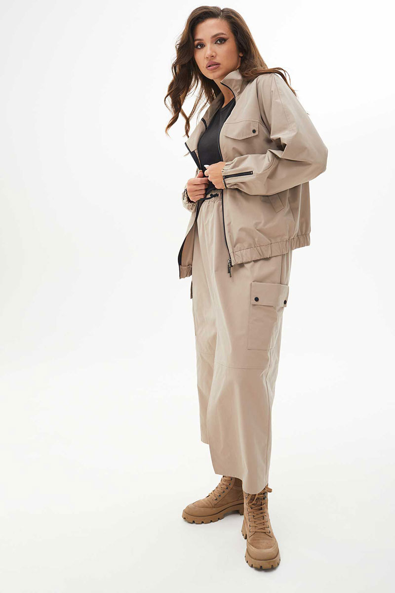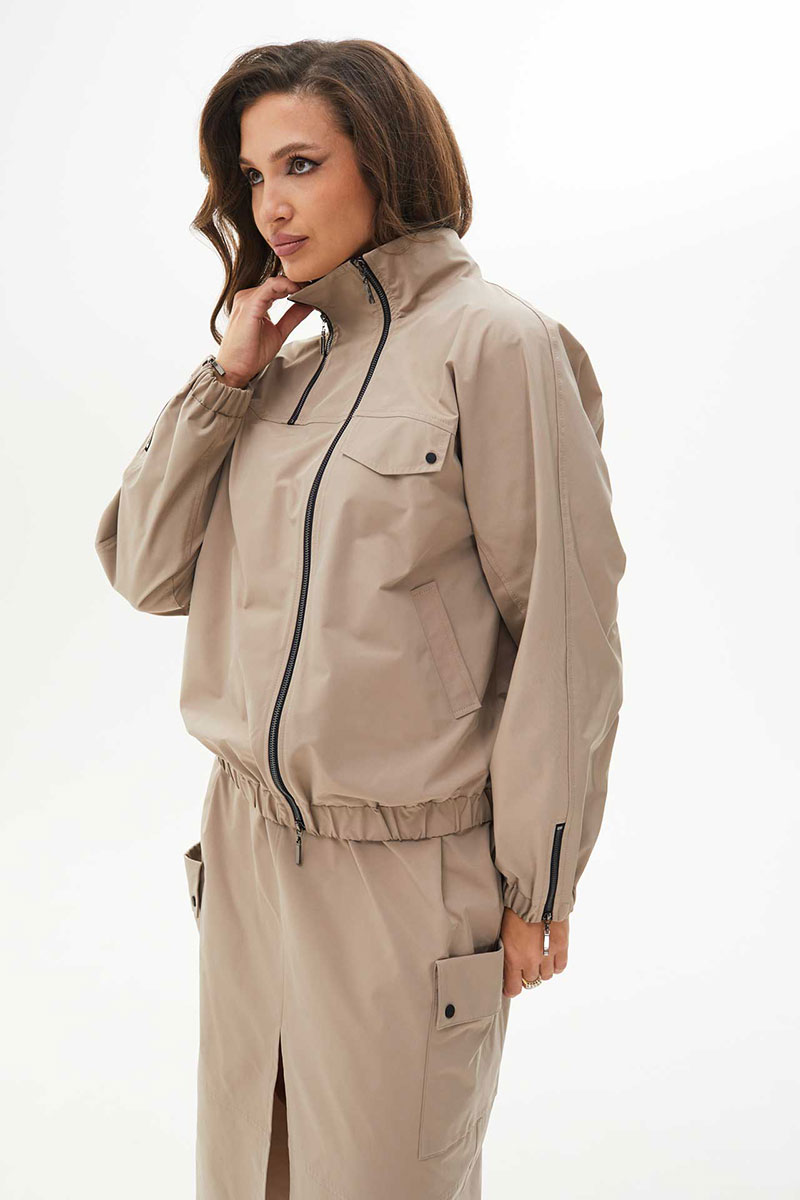 Жакет свободный с цельнокроеными рукавами, без подкладки, по низу притачная планка, в которую продета резинка. По переду горизонтальный подрез, прорезные карманы с листочкой, клапан с кнопкой, молния и застёжка на тесьму молния. Воротник стойка. По низу рукава резинка и застёжка небольшая молния.