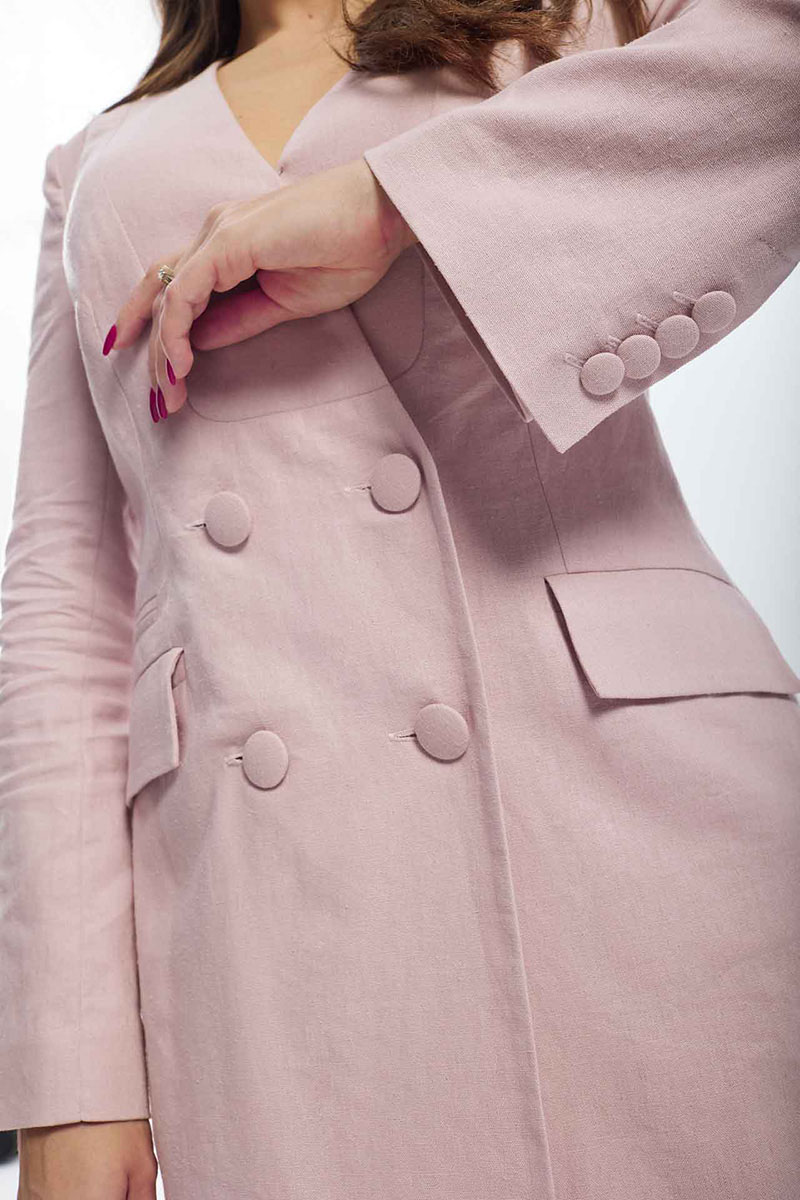 Платье женское полуприлегающего силуэта выполнено из льняной ткани. По переду фигурный подрез, талевые вытачки, функциональные карманы с клапанами, двубортная застёжка на четыре прорезные петли и пуговицы. По спинке талевые вытачки и центральный шов, заканчивающийся шлицей с разрезом. Рукава двух шовные втачные. Горловина v-образная. Платье на тонкой хлопковой подкладке.