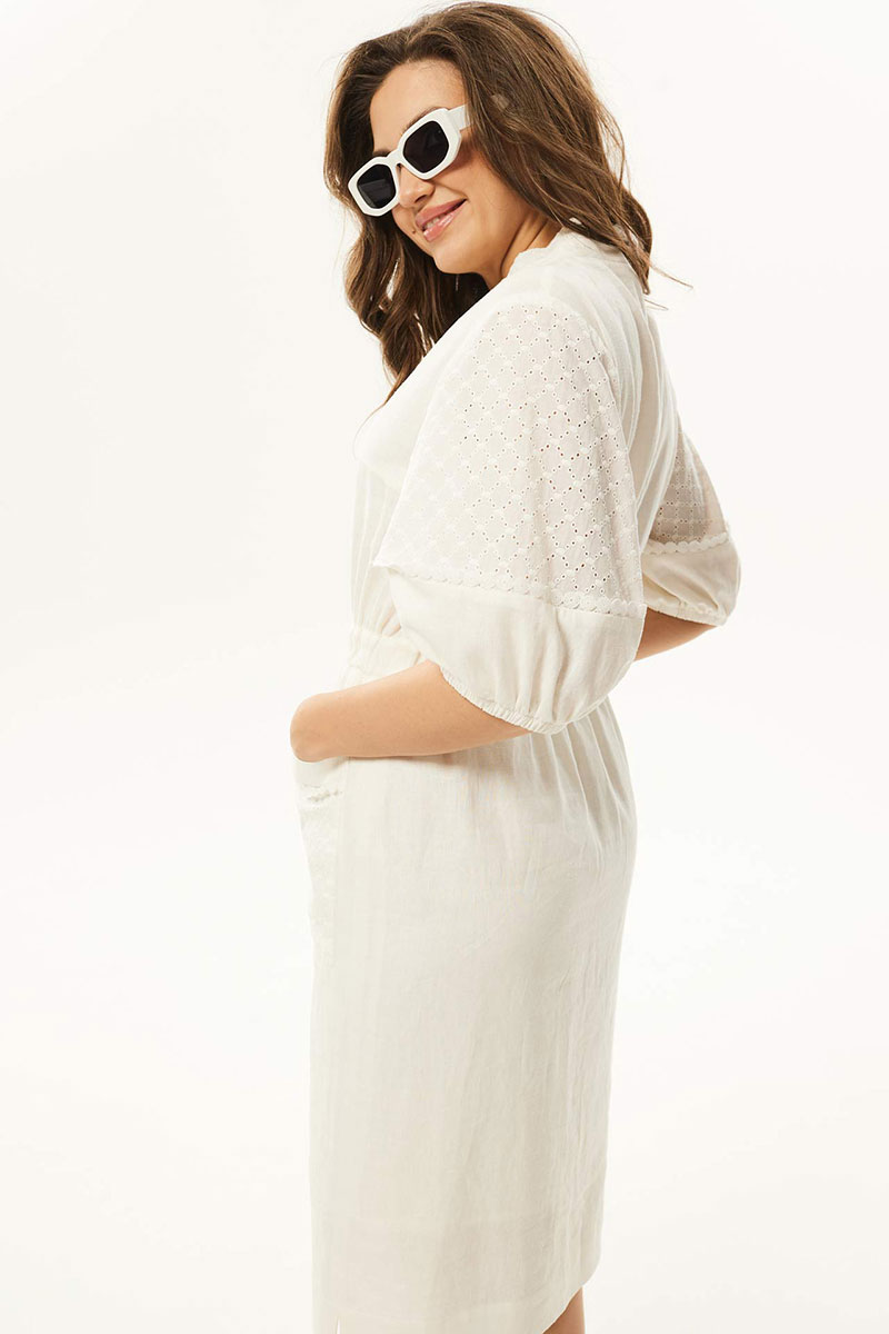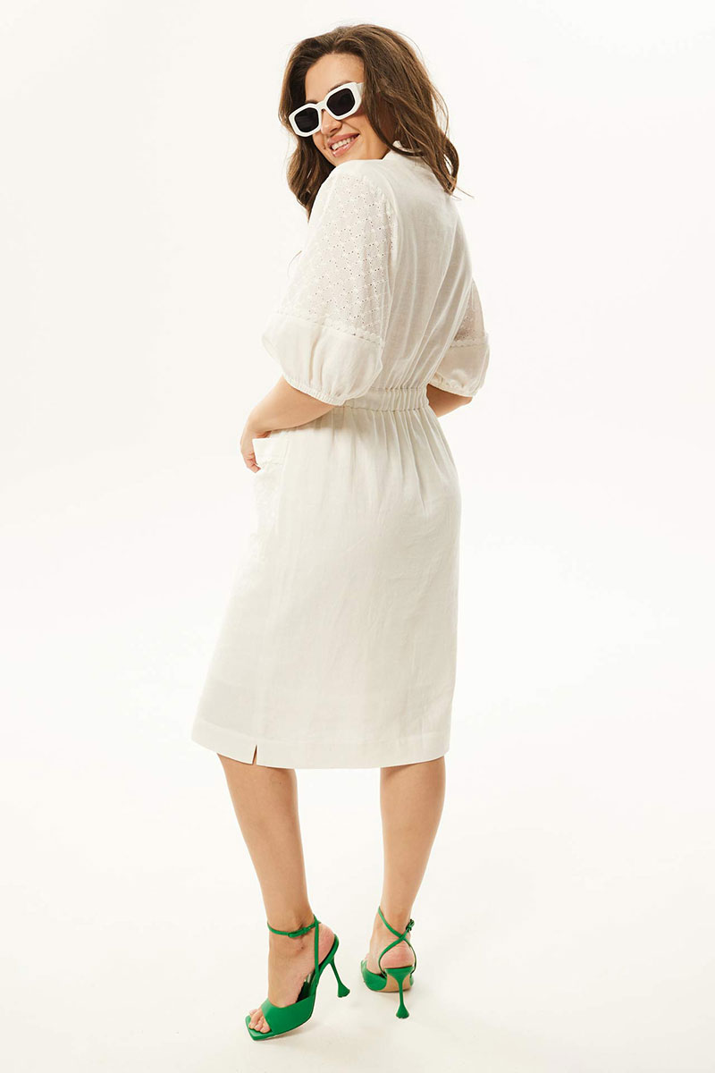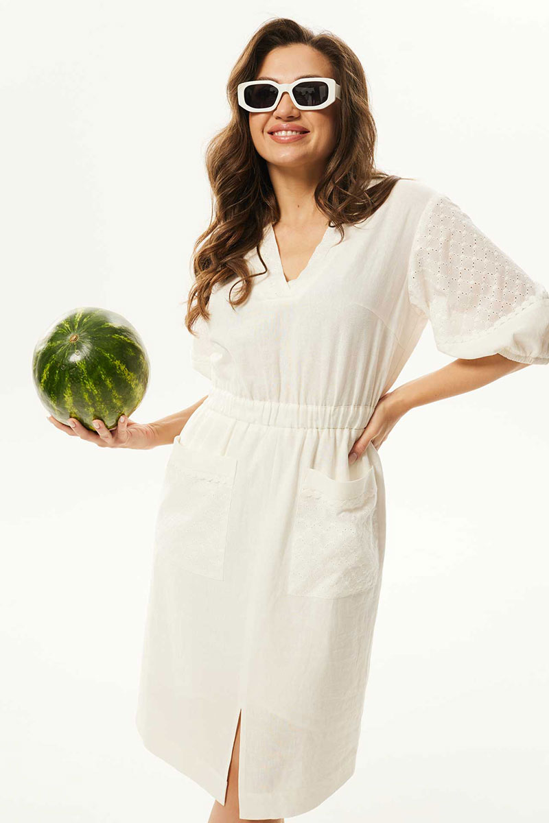 Платье женское отрезное по линии талии, полуприлегающего силуэта, комбинированное из двух различных по фактуре тканей. По переду приточная планка, нагрудные вытачки и накладные карманы. По линии талии широкая резинка. Горловина v-образная. Рукава одношовные втачные, по низу мягкая сборка на тонкую тесьму резинка. Платье на тонкой хлопковой подкладке. Платье задекорировано кружевом.