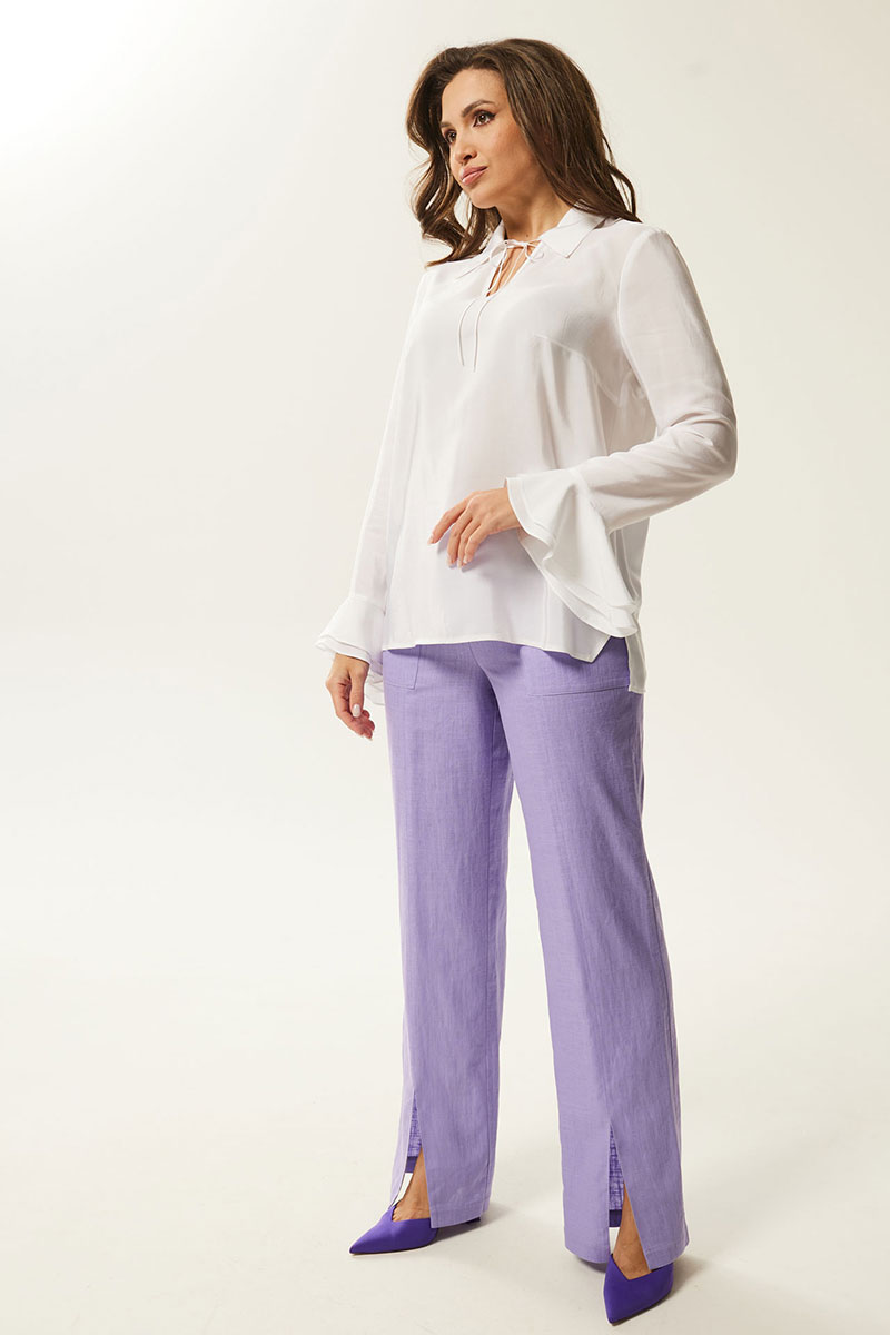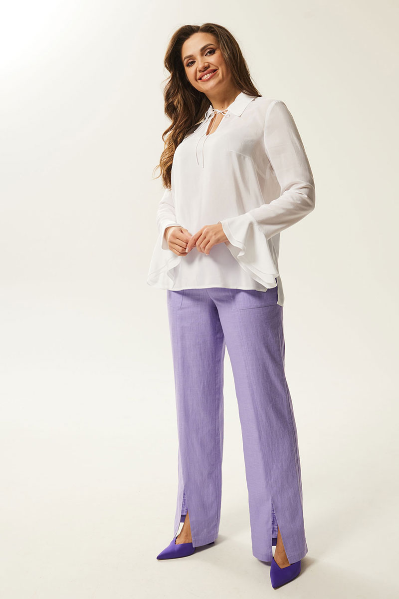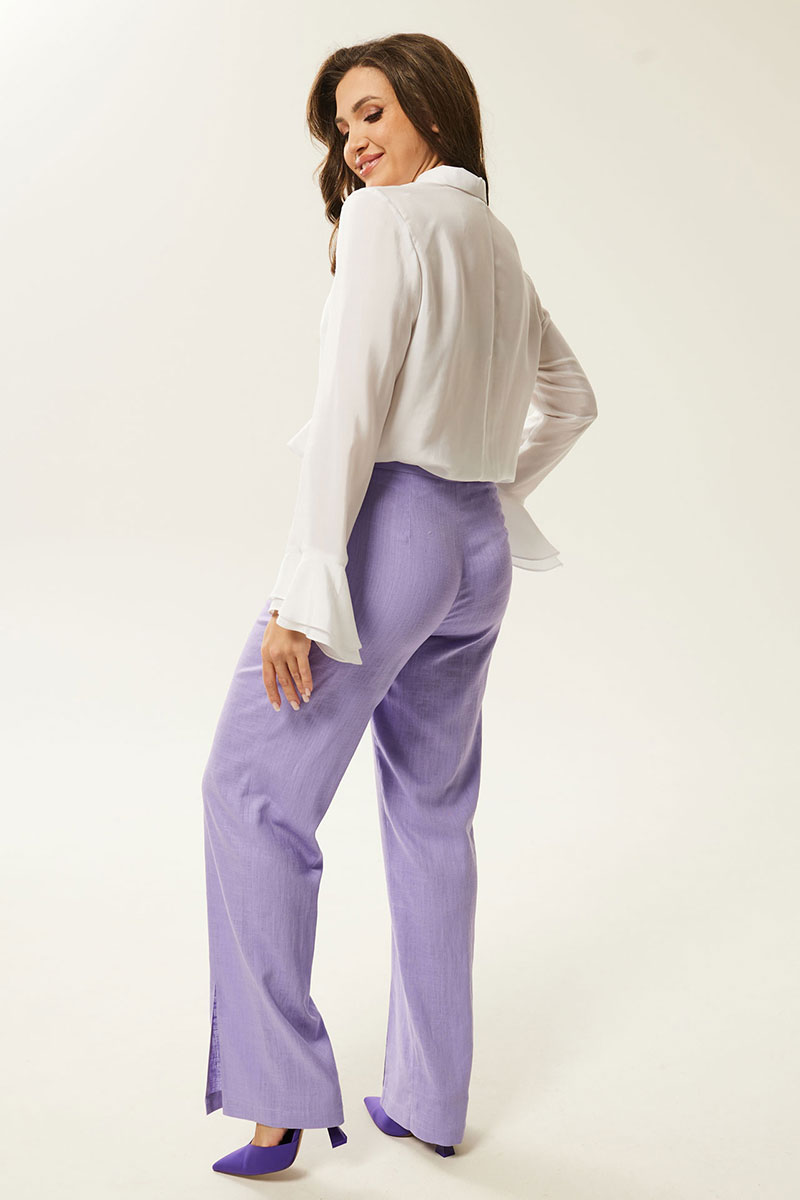 Брюки женские свободного силуэта с высокой посадкой, максимальным расширением от бедра (палаццо), на притачном поясе на резинке по спинке, с накладными карманами. Застёжка потайная молния в боковом шве. По центру передних половинок брюк швы, которые заканчиваются разрезом.
