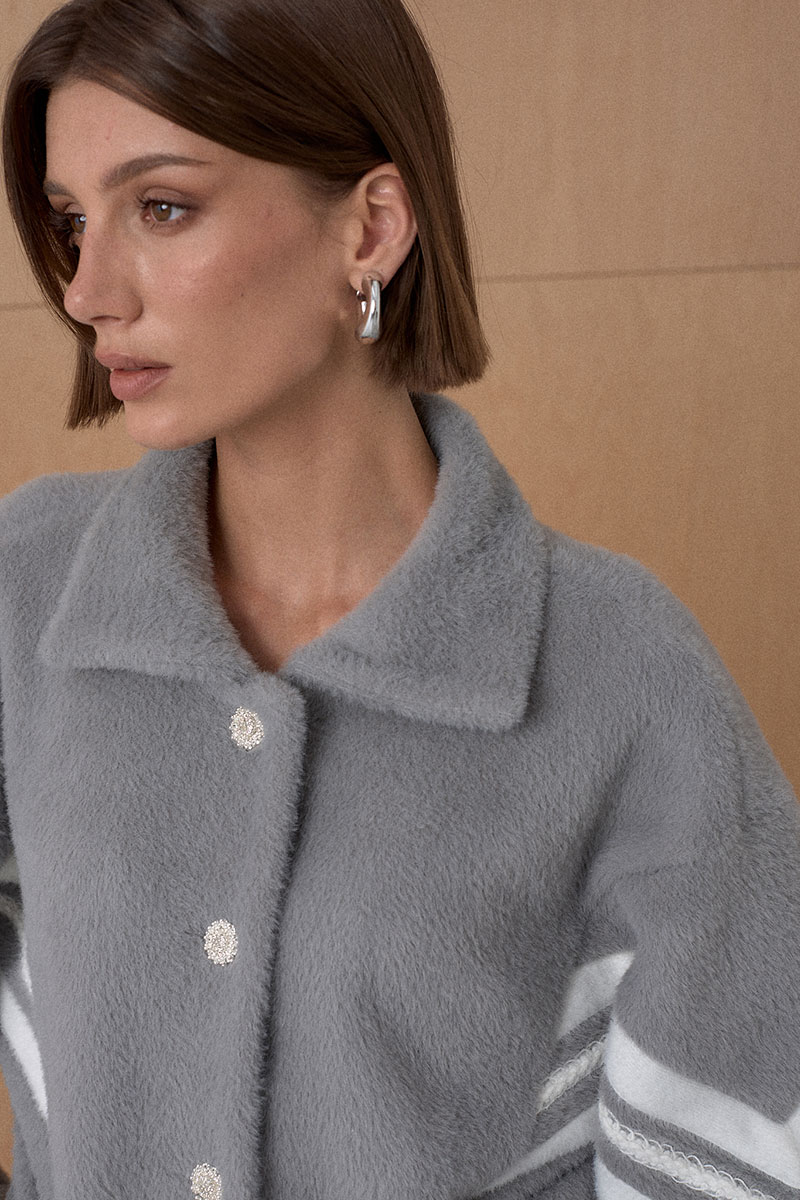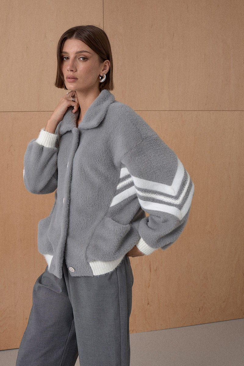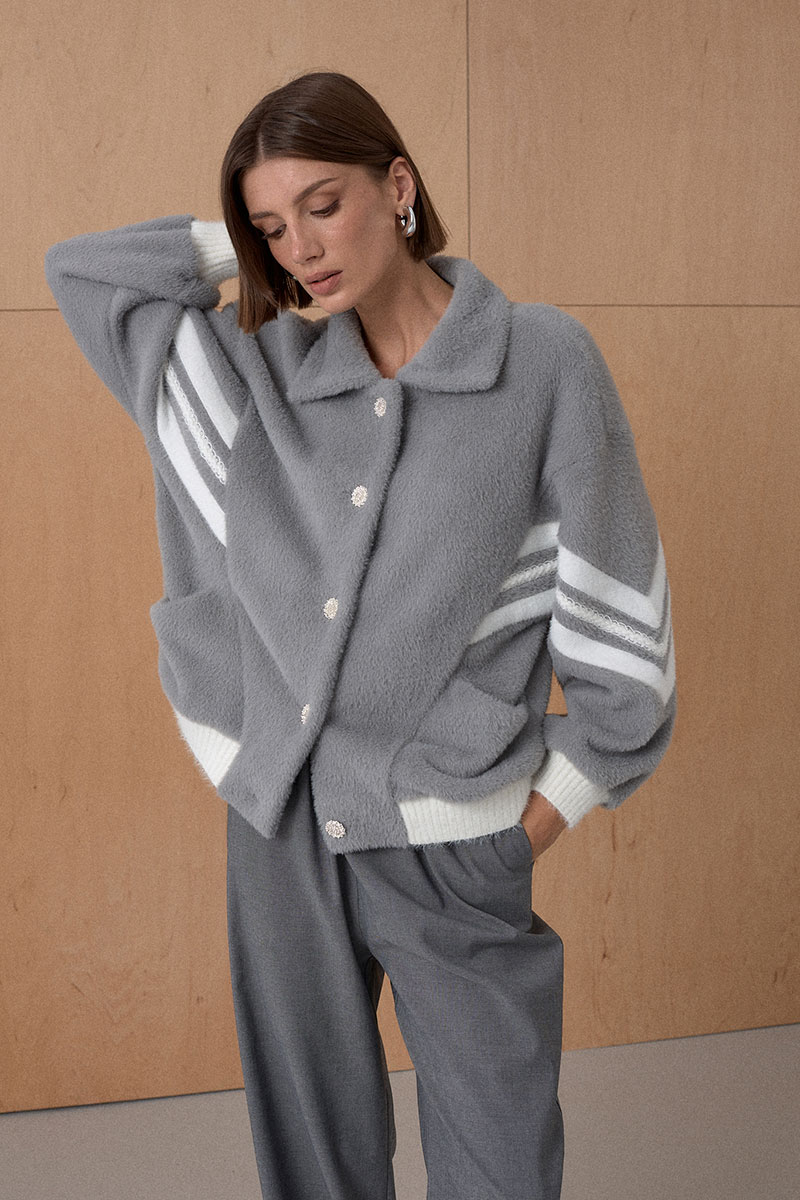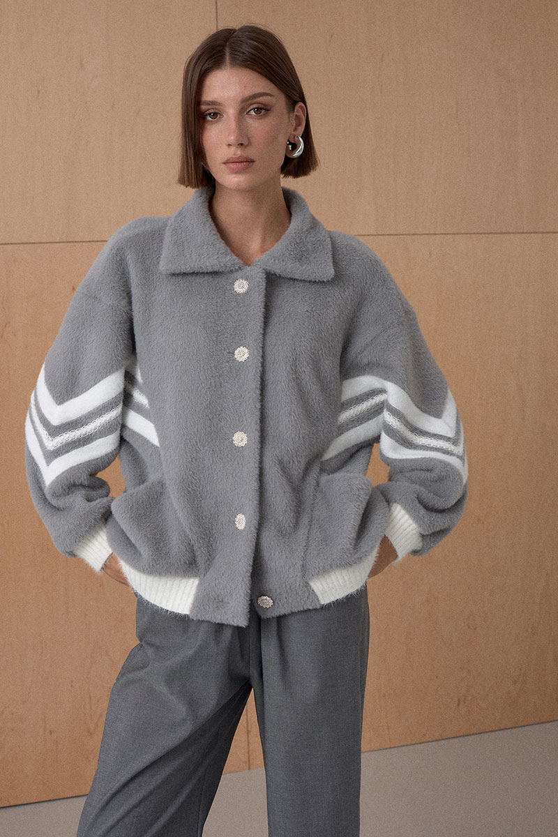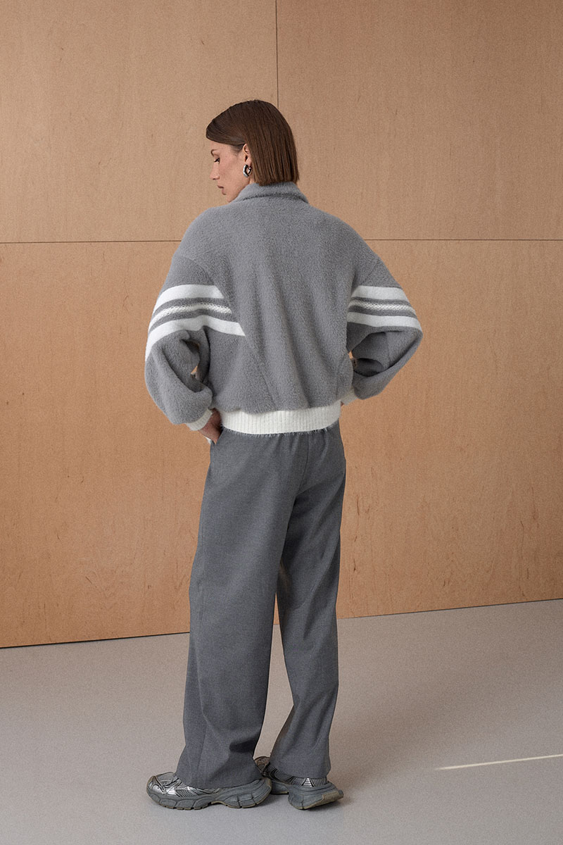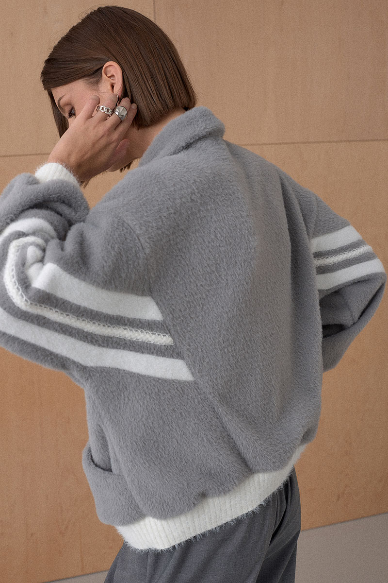Джемпер из мягкого фактурного трикотажного полотна. Джемпер в силуэте олимпийки. Застежка на премиальные итальянские пуговицы. На рукавах декоративные ленты в виде лампасов.