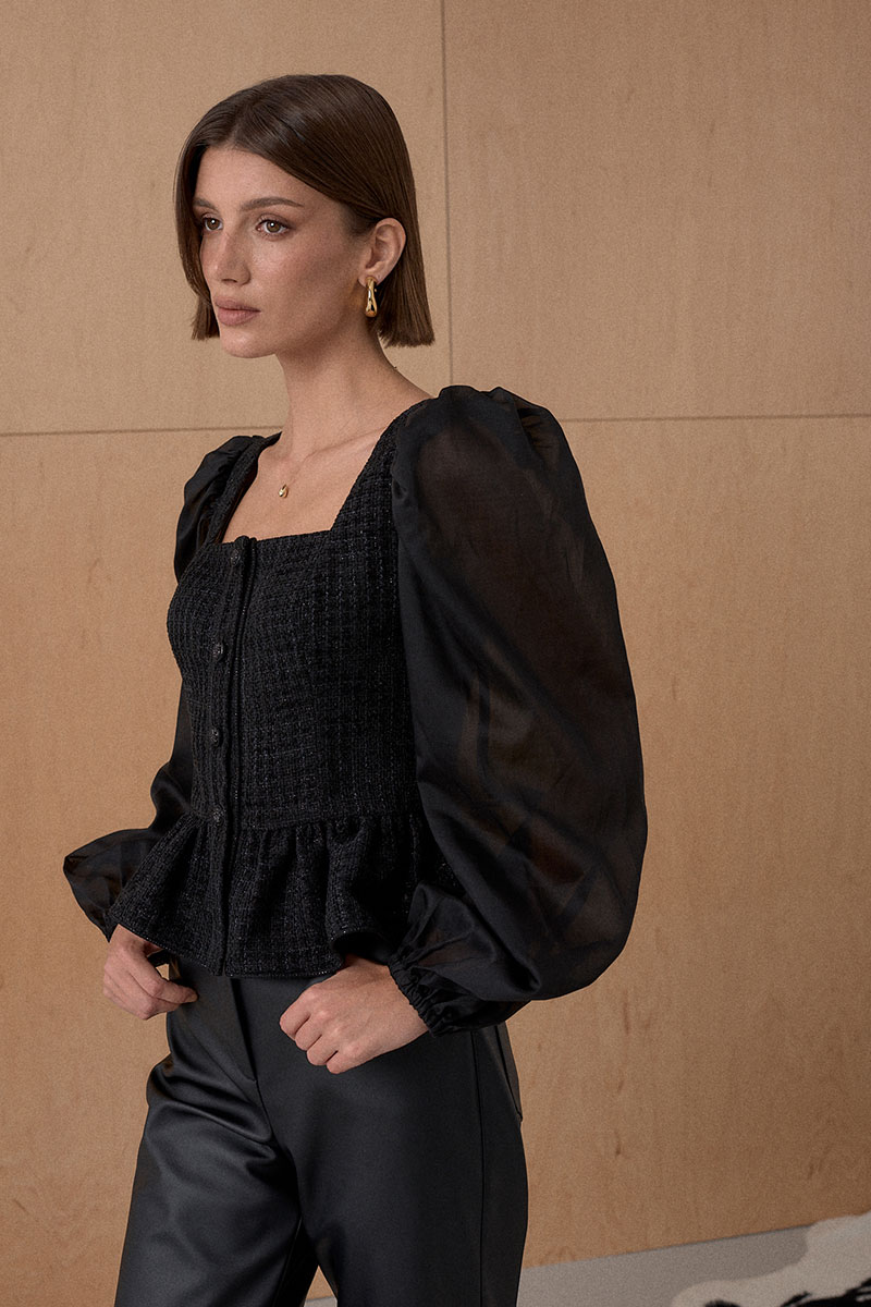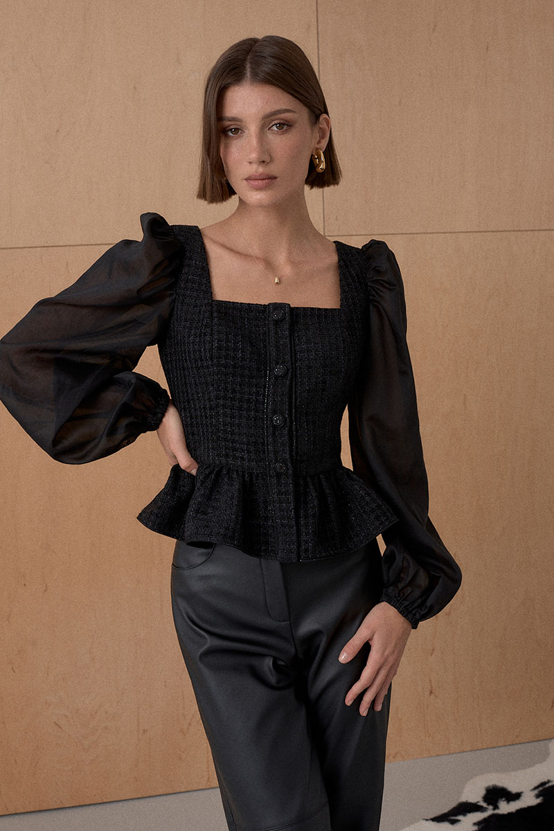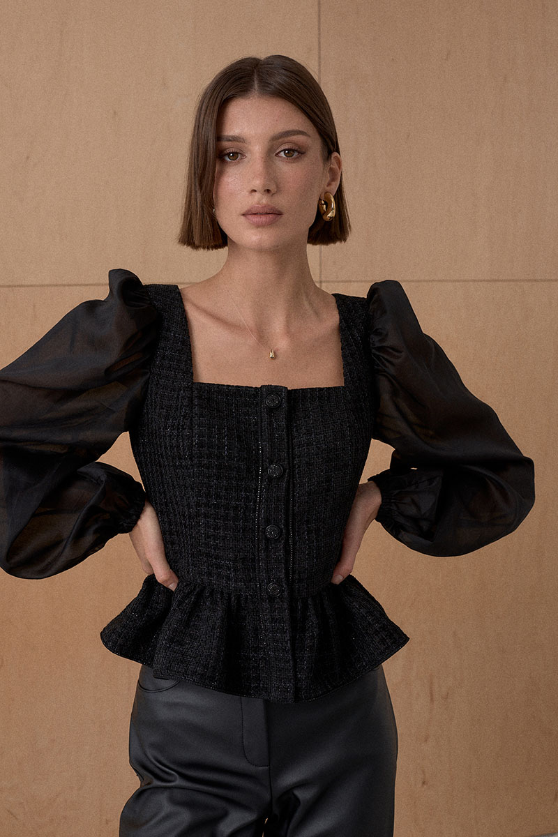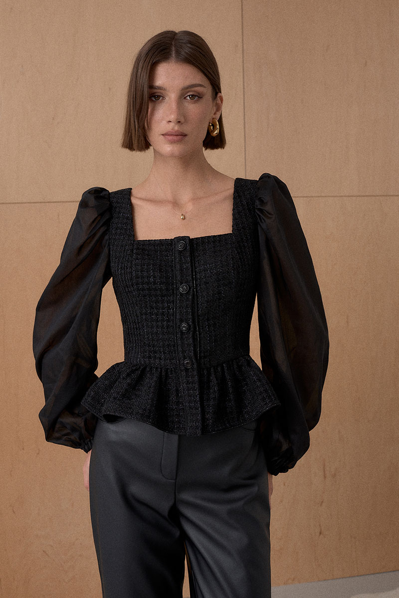 Топ из благородного жаккарда. Декорирован мерцающей тесьмой. Рукав выполнен из полупрозрачной вискозной ткани.