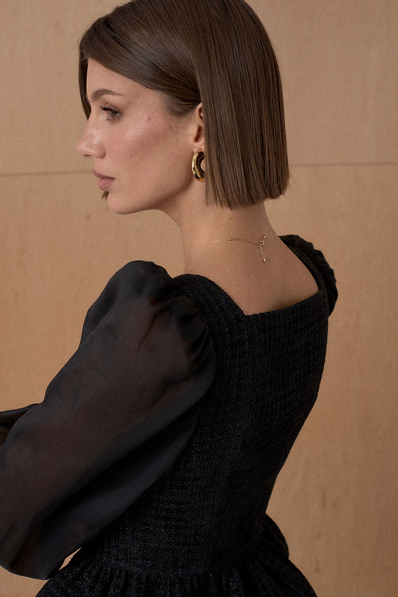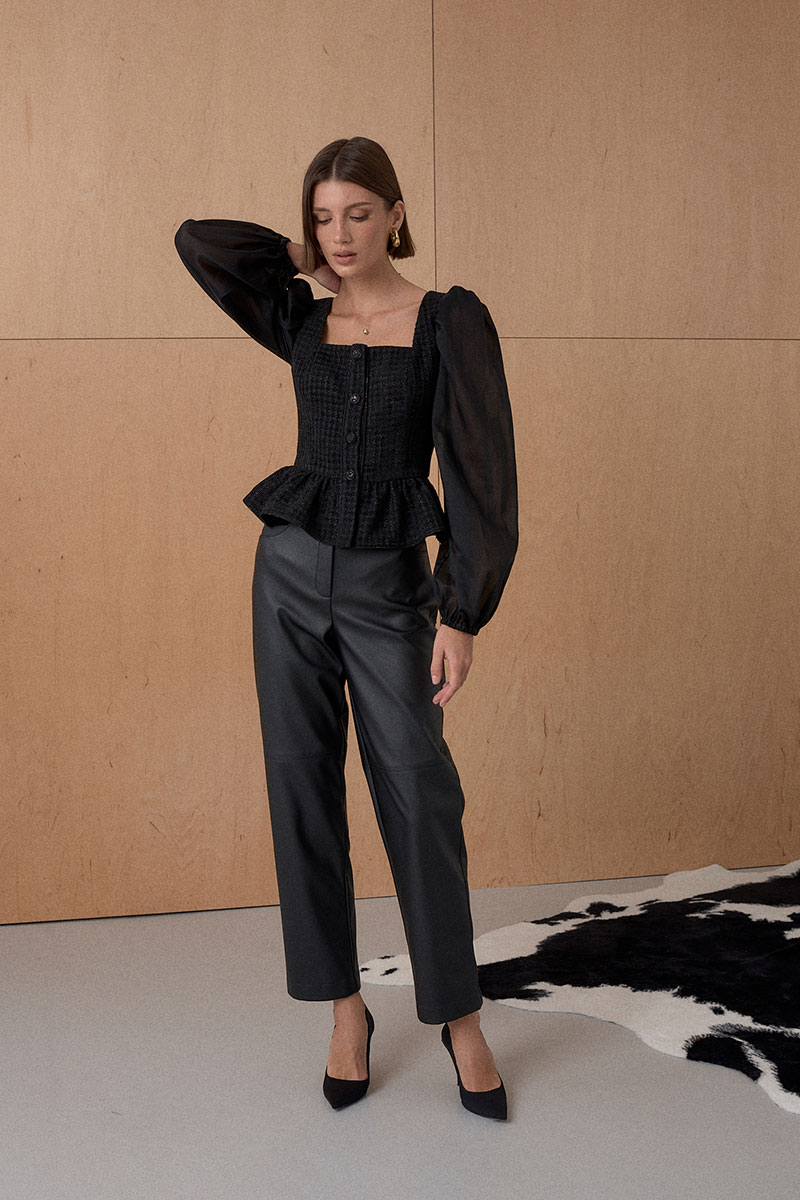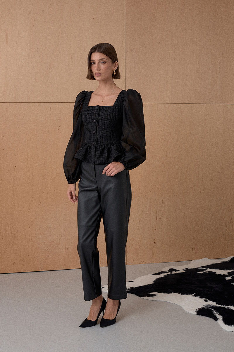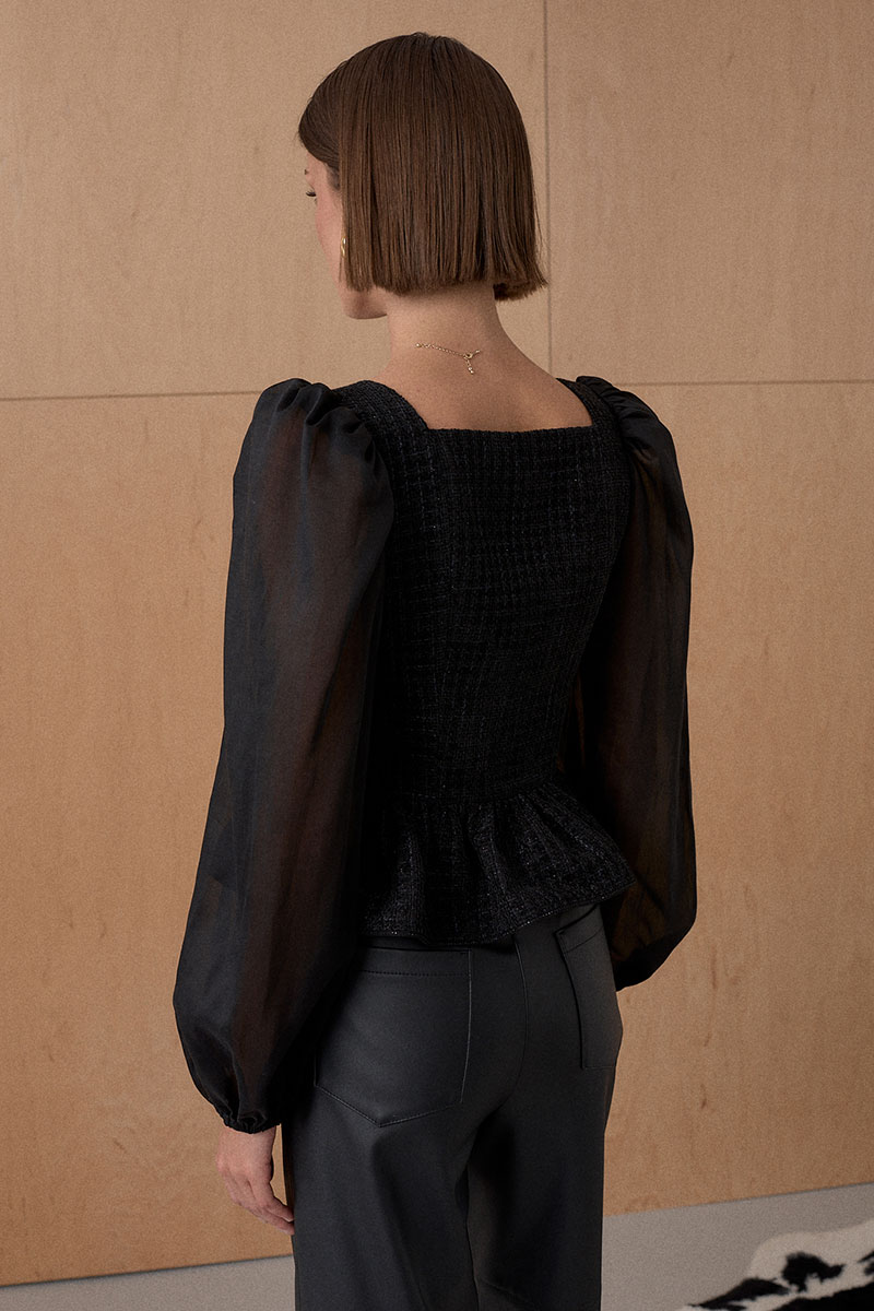 Топ из благородного жаккарда. Декорирован мерцающей тесьмой. Рукав выполнен из полупрозрачной вискозной ткани.