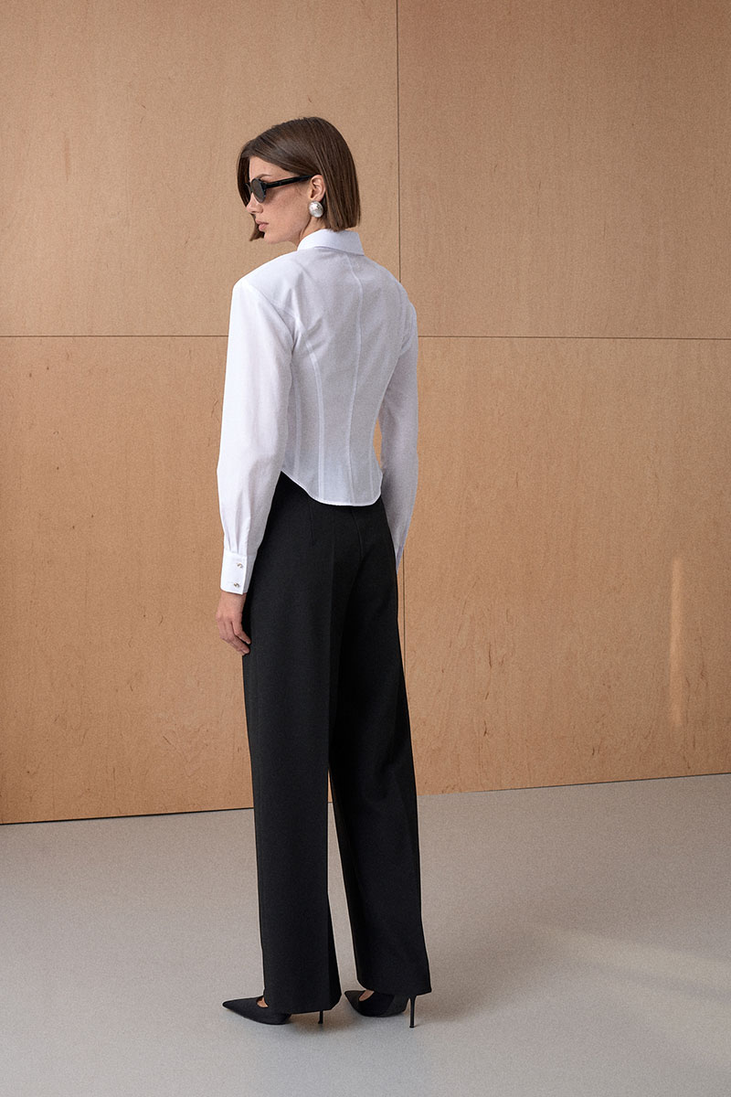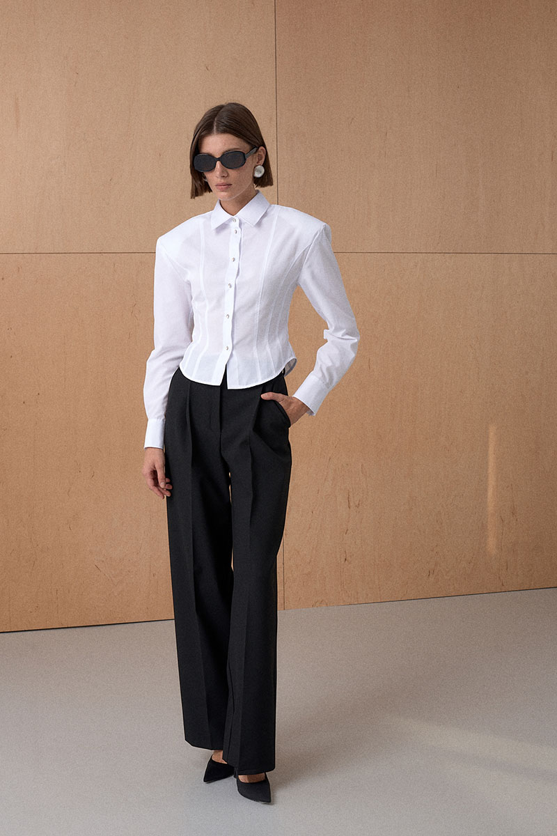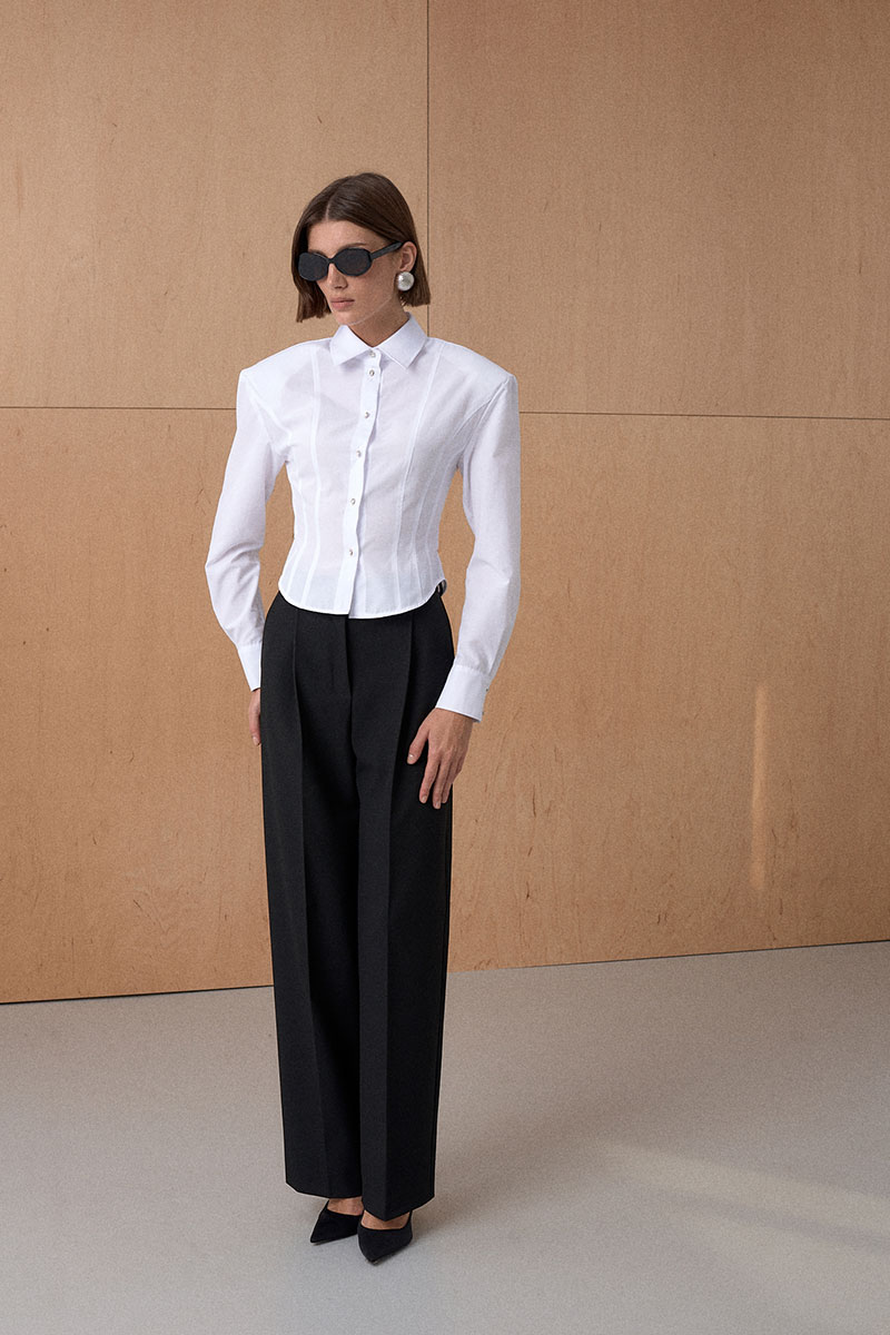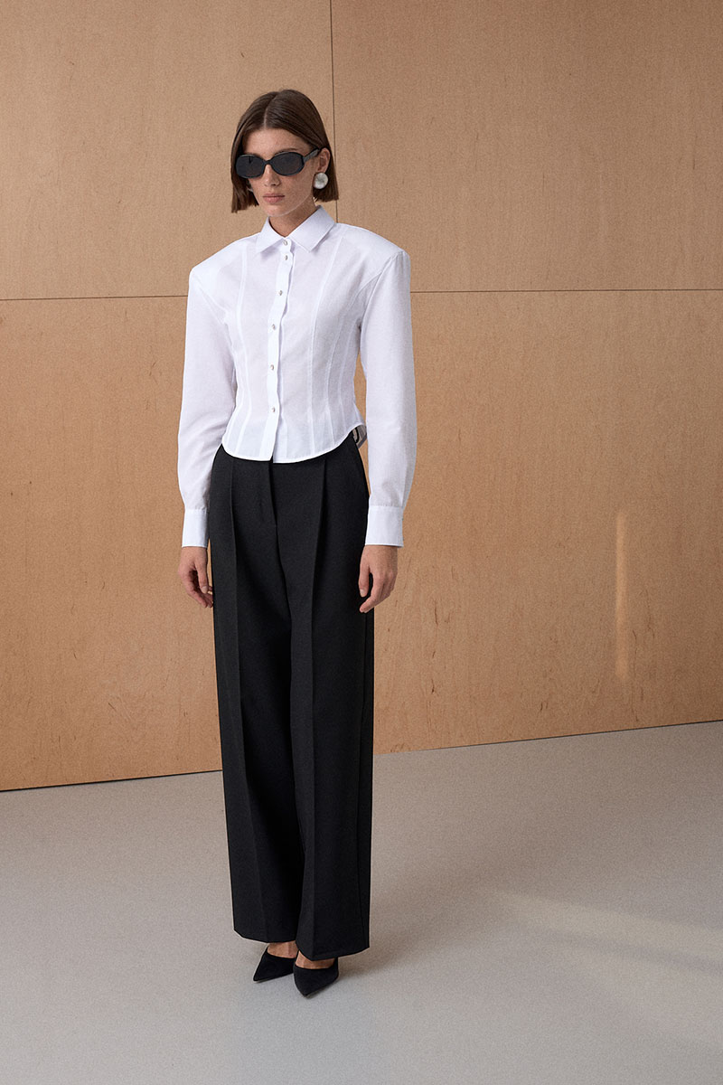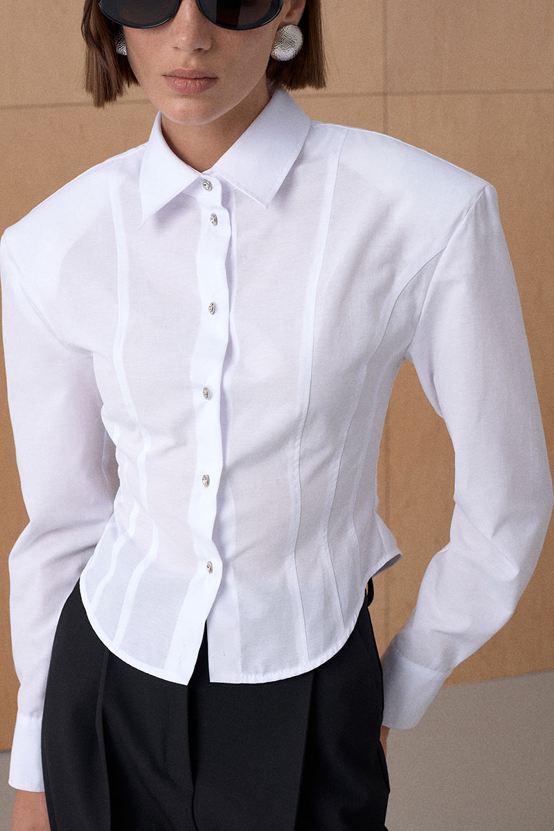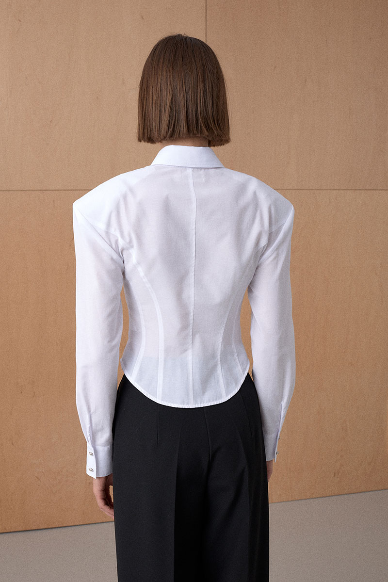 Блуза из хлопка с имитацией корсетной формы по талии. Усиленная и расширенная форма плеча.