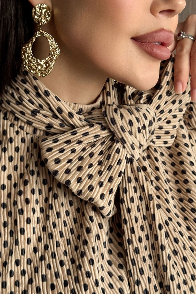 Блуза из трикотажного мягкого полотна с эффектом плиссе. Объёмные рукава, снизу на резинке. Воротник стойка с длинными лентами, которые можно завязать в виде банта.