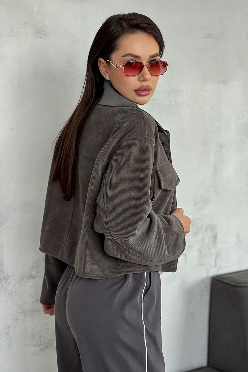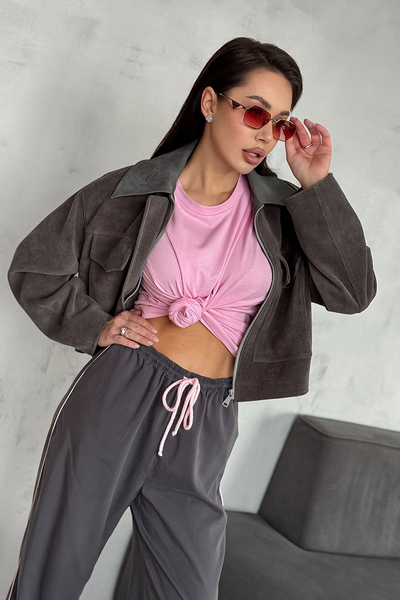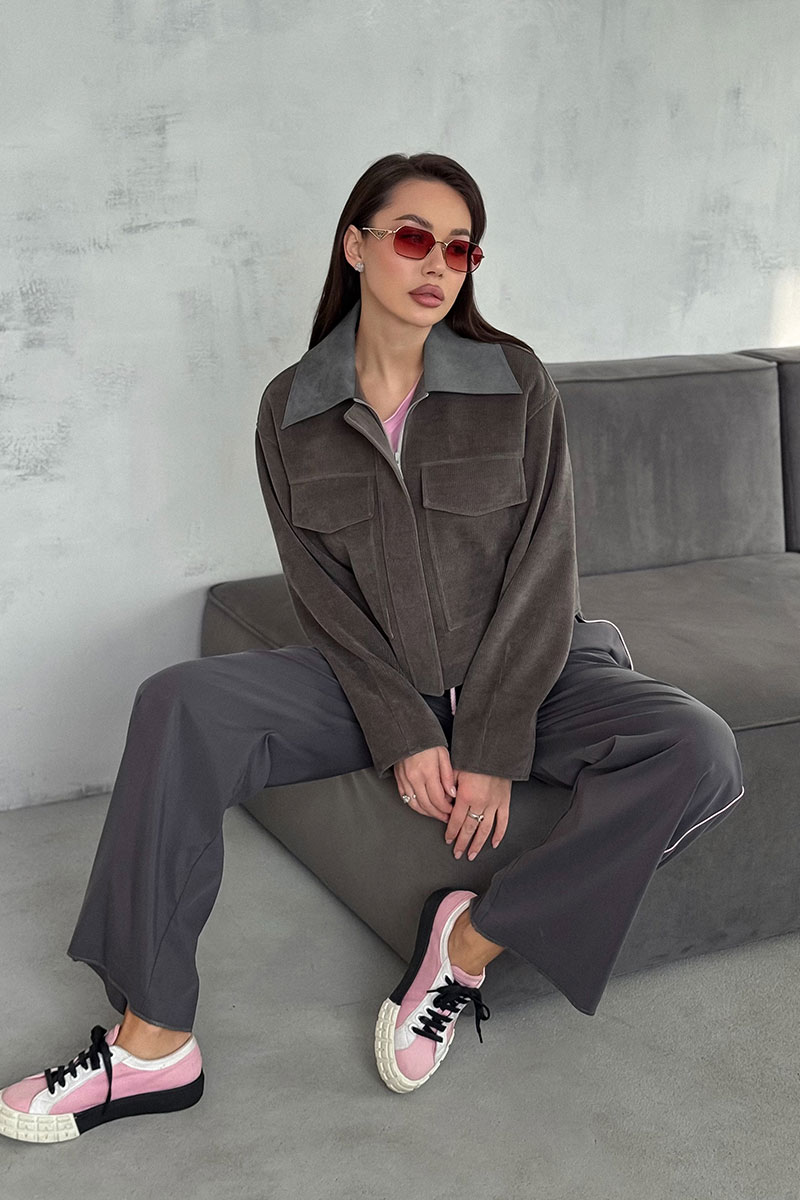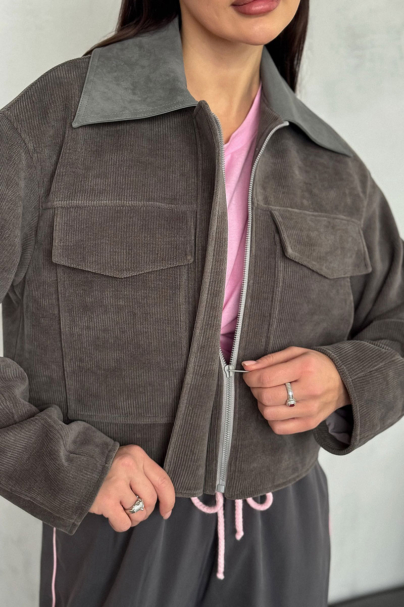 Жакет из вельвета. Вотник из премиальной экокожи с эффектом инзима. На полочке крупные карманы. Застежка на крупную молнию.