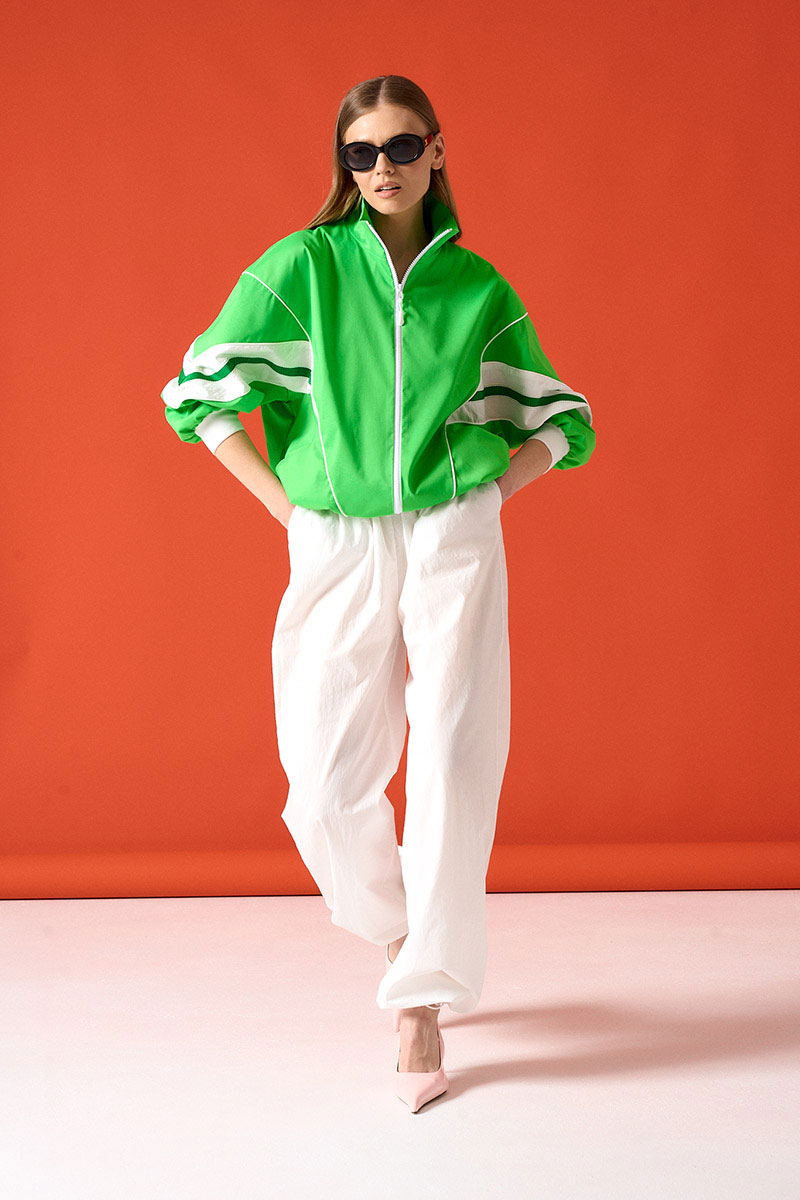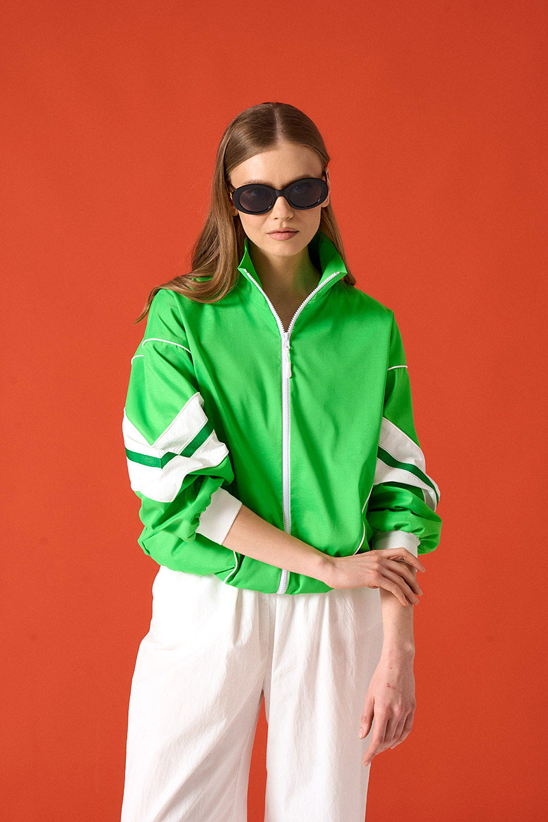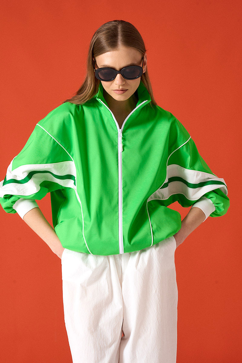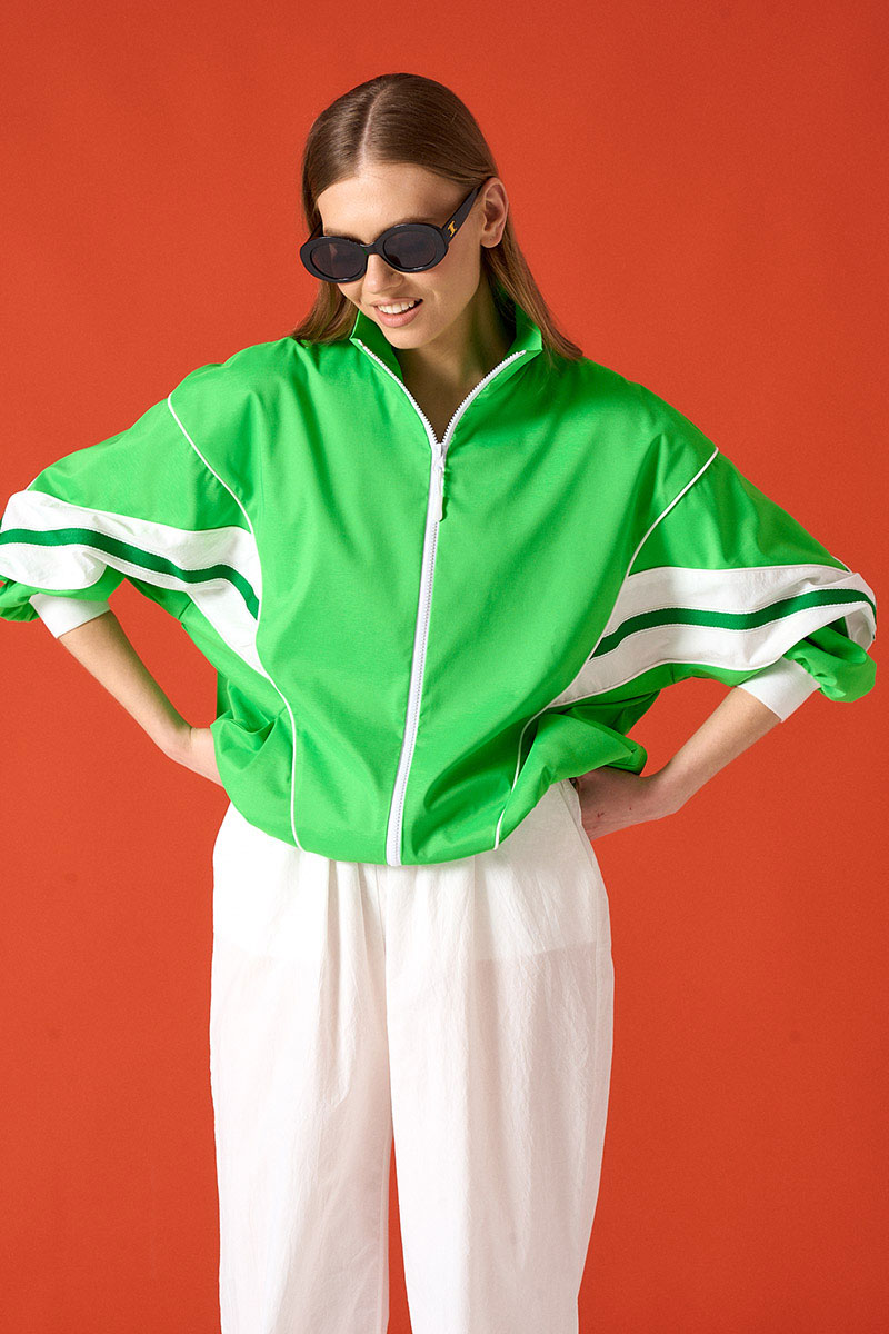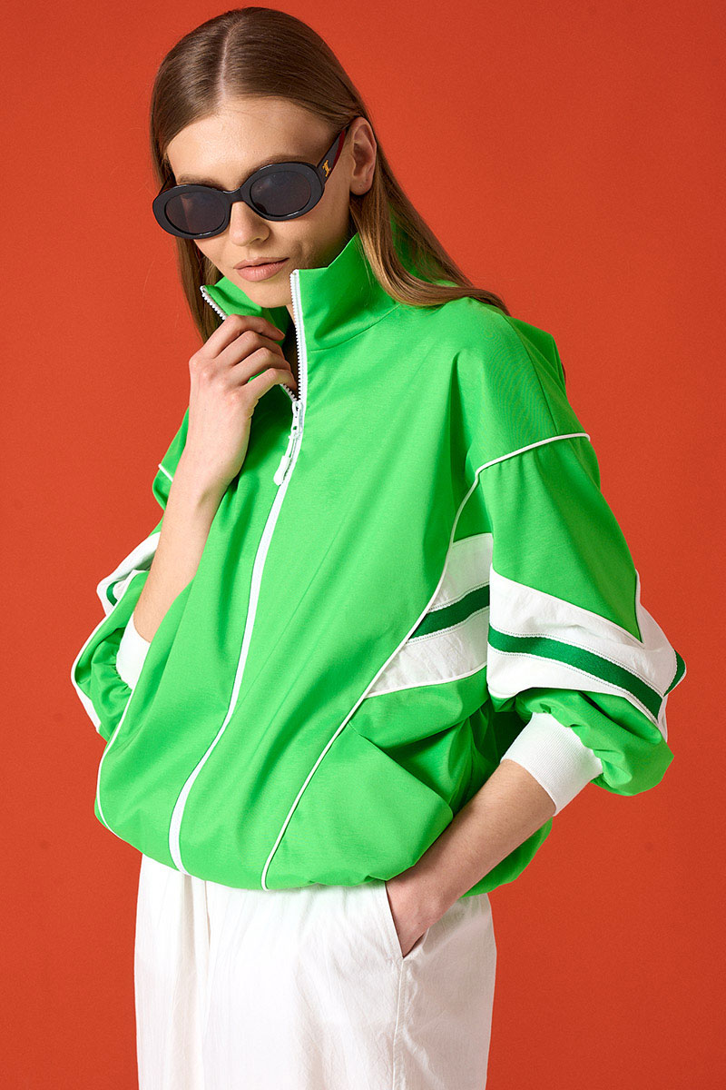 Олимпийка свободного силуэта с контрастными вставками из белого хлопка на рукавах. Застежка на молнию. Низ изделия и рукава на довязе.