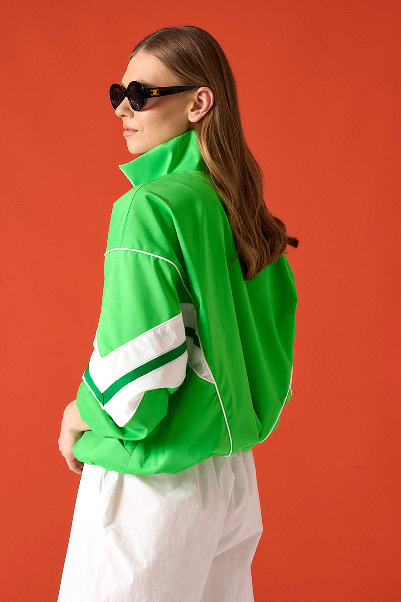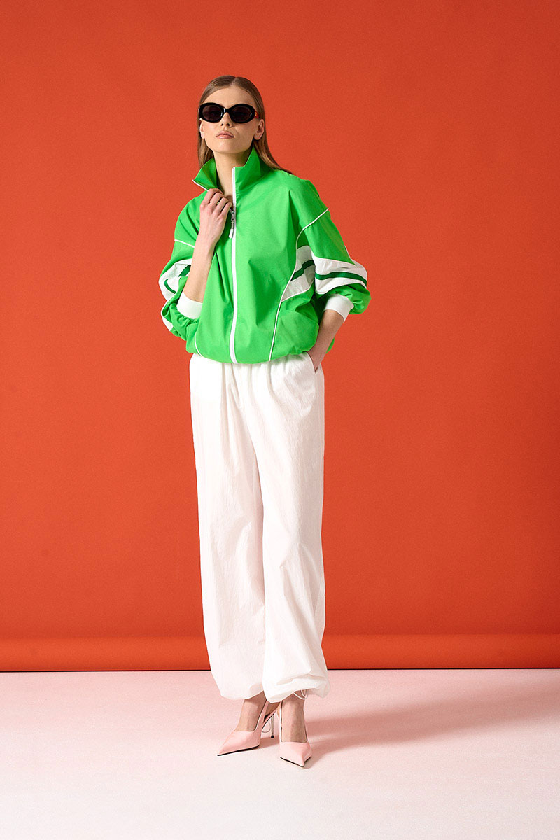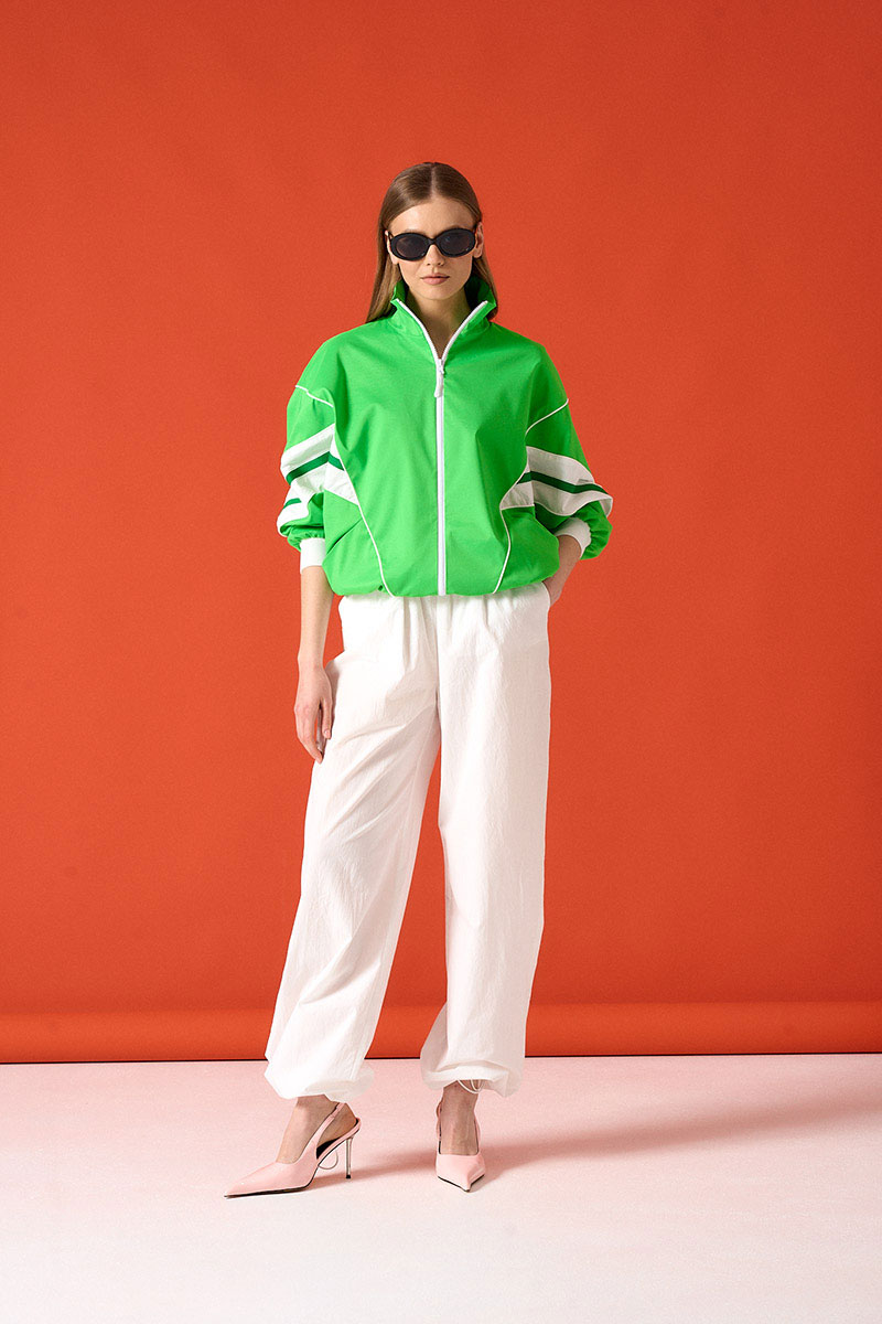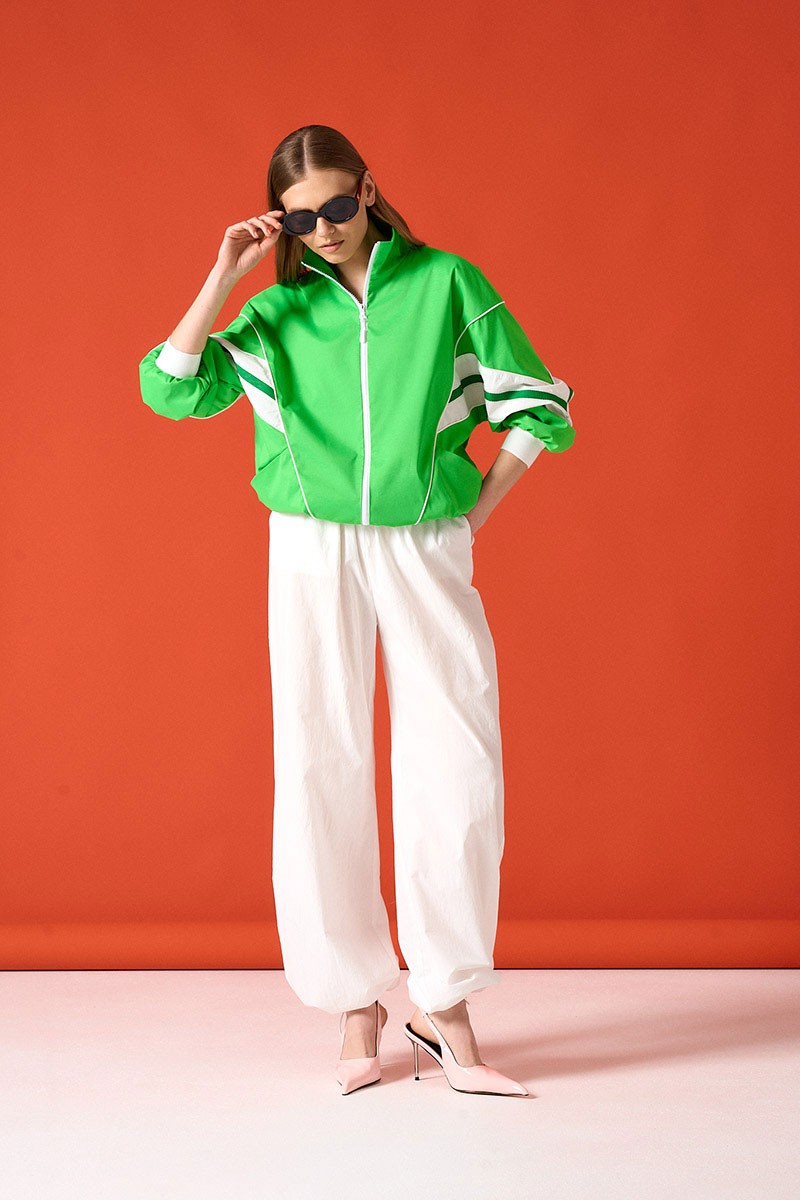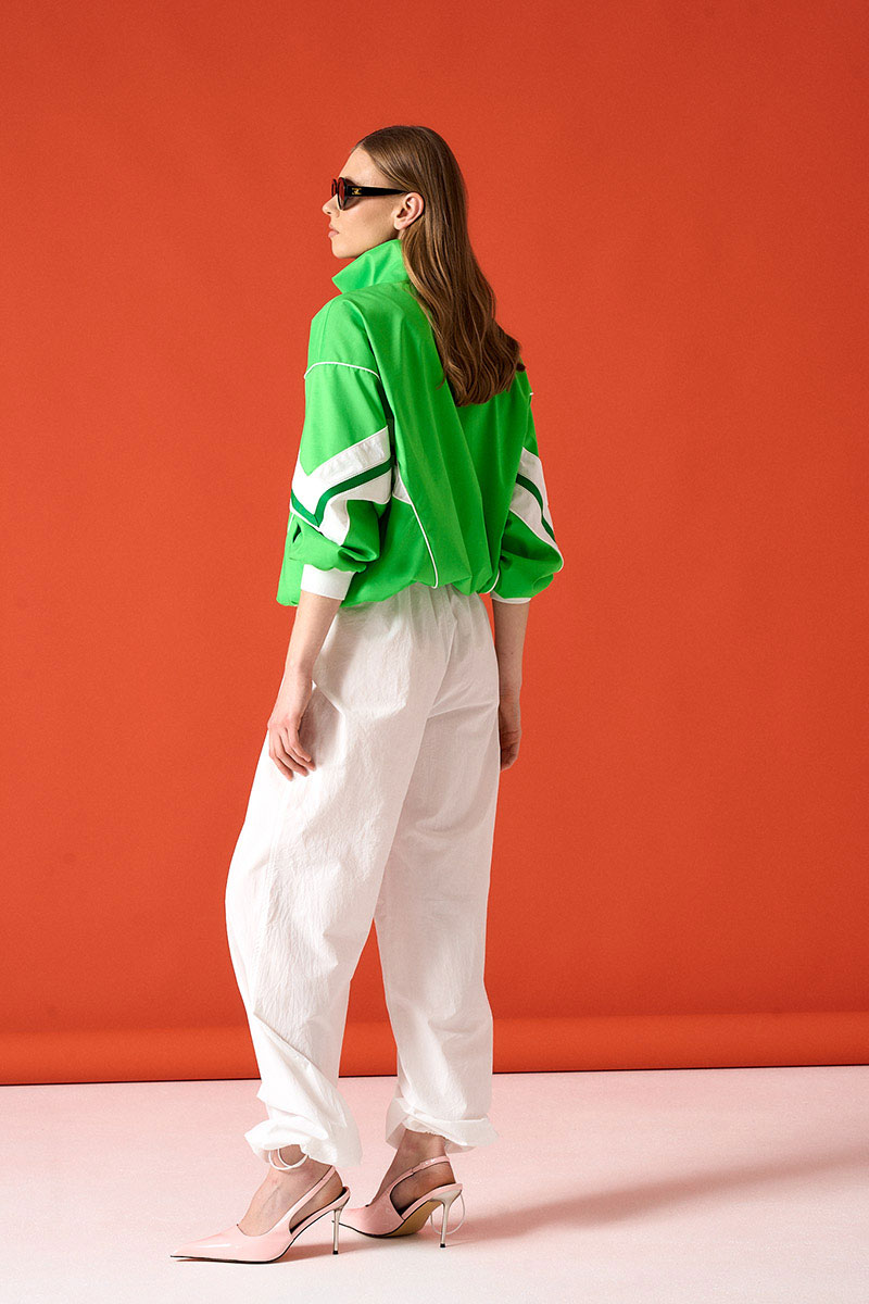 Олимпийка свободного силуэта с контрастными вставками из белого хлопка на рукавах. Застежка на молнию. Низ изделия и рукава на довязе.