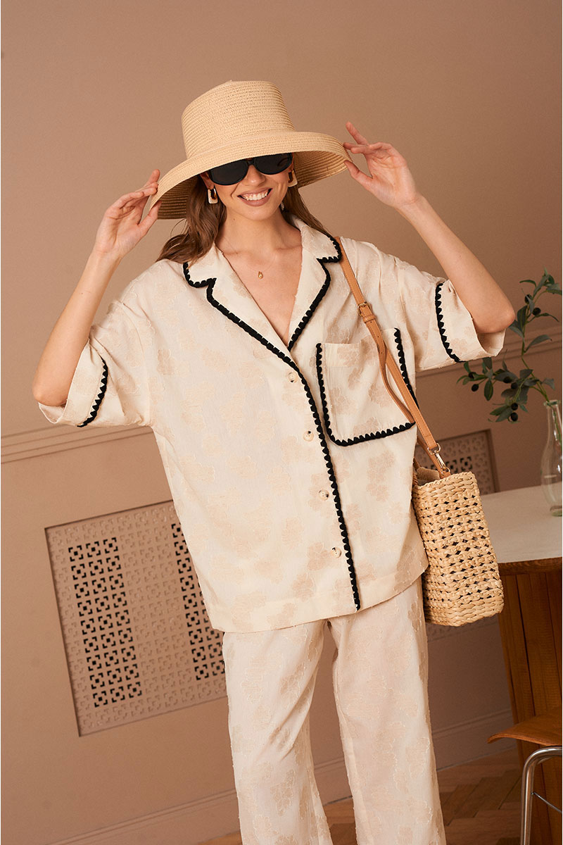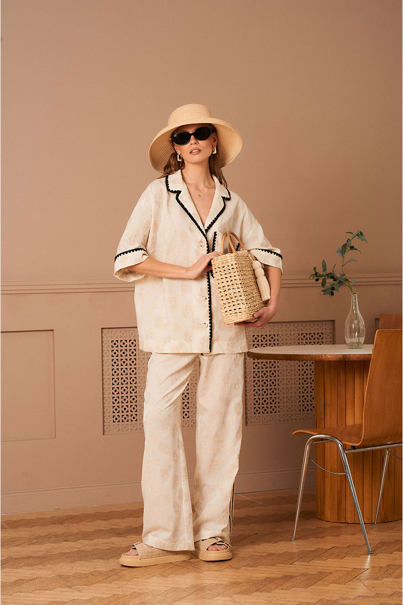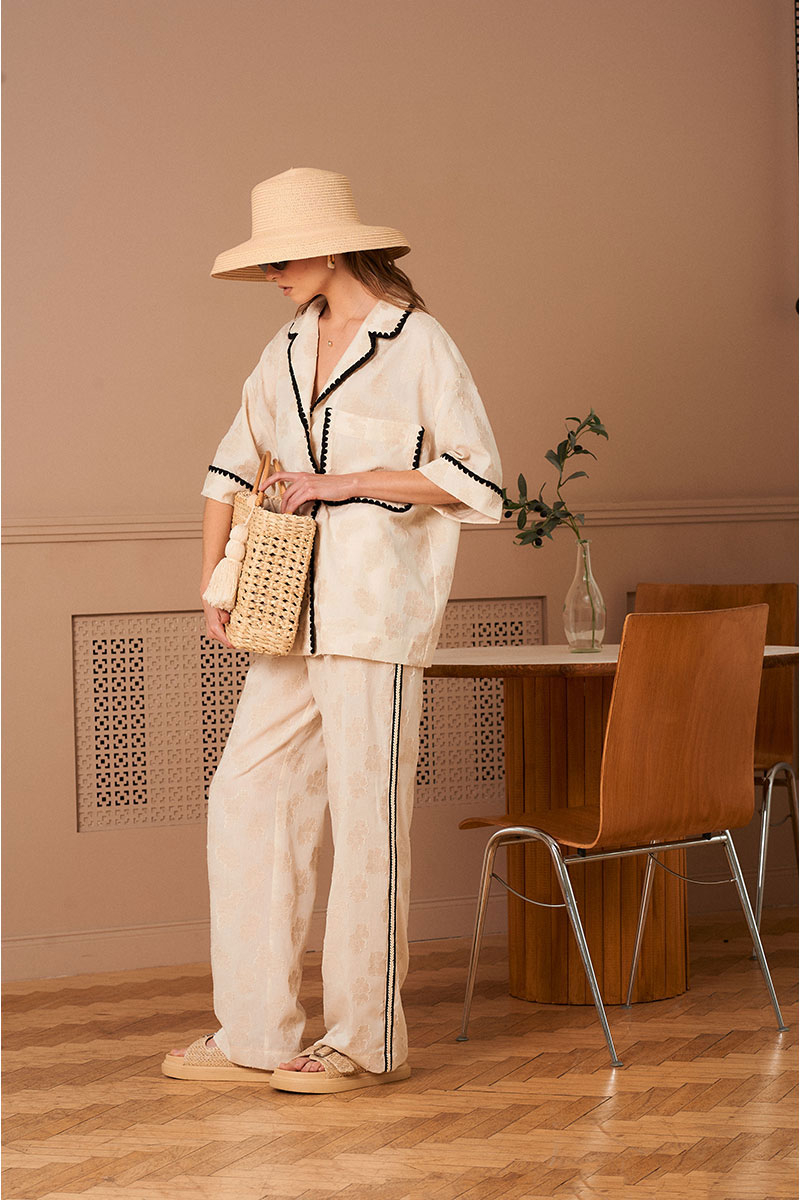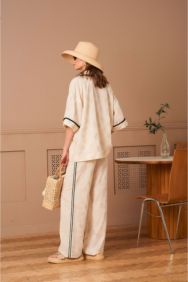 Брюки из премиальной фактурной ткани с дизайнерским переплетением нитей. Брюки декорированы тесьмой по боковым швам.