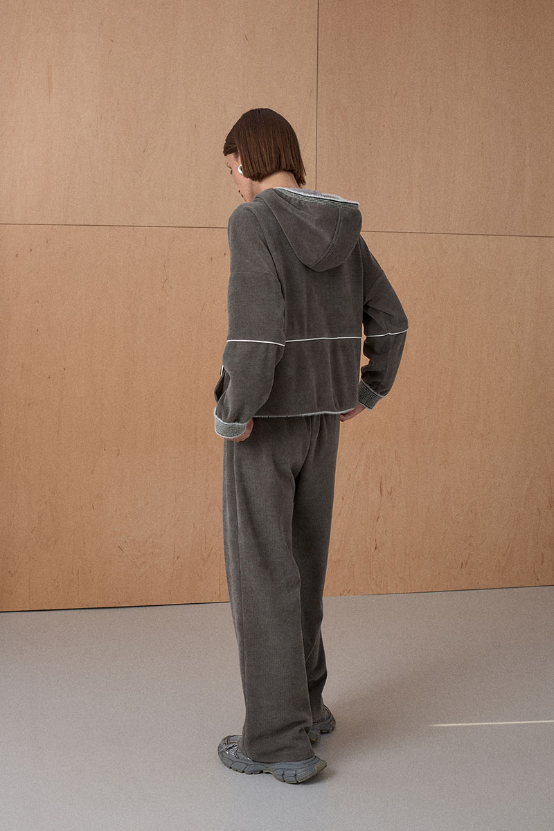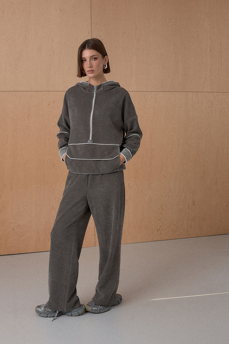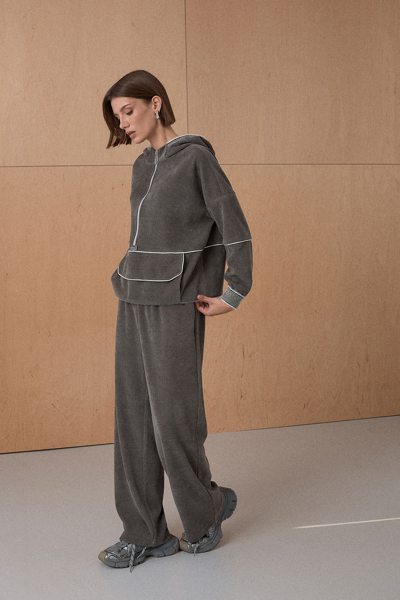 Брюки свободного силуэта из фактурной ткани. Пляс на резинке. В боковых швах карманы.