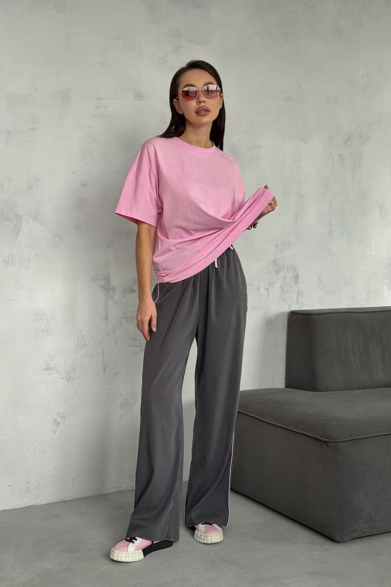 Брюки из вискозного ткани. Пояс на резинке дополнительно кулиса со шнуром. В боковых швах карманы и розовый кант.