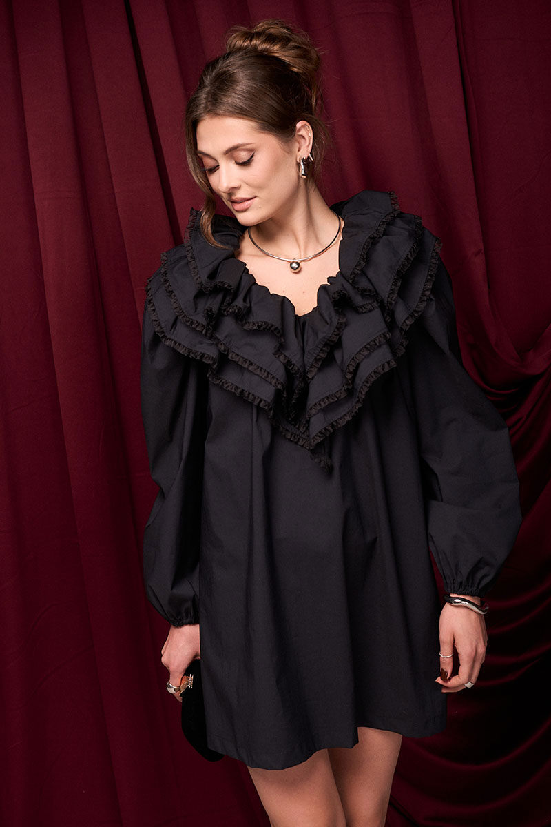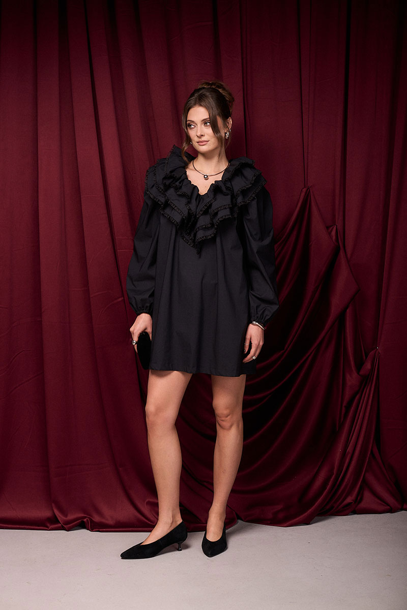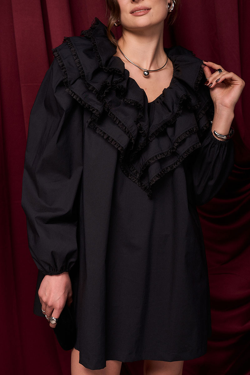 Платье из хлопка премиального качества. Изделие с пышным акцентным воротником. В боковых швах карманы. Платье на подкладке. Воланы декорированы тесьмой.