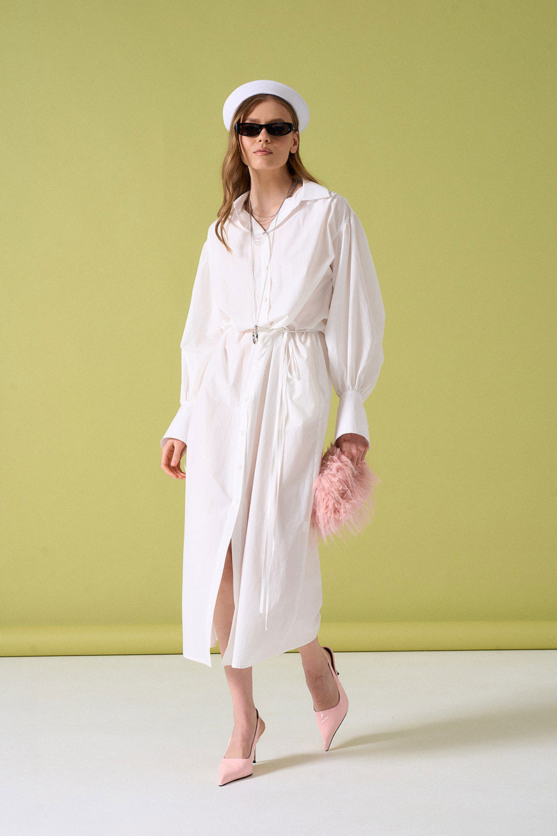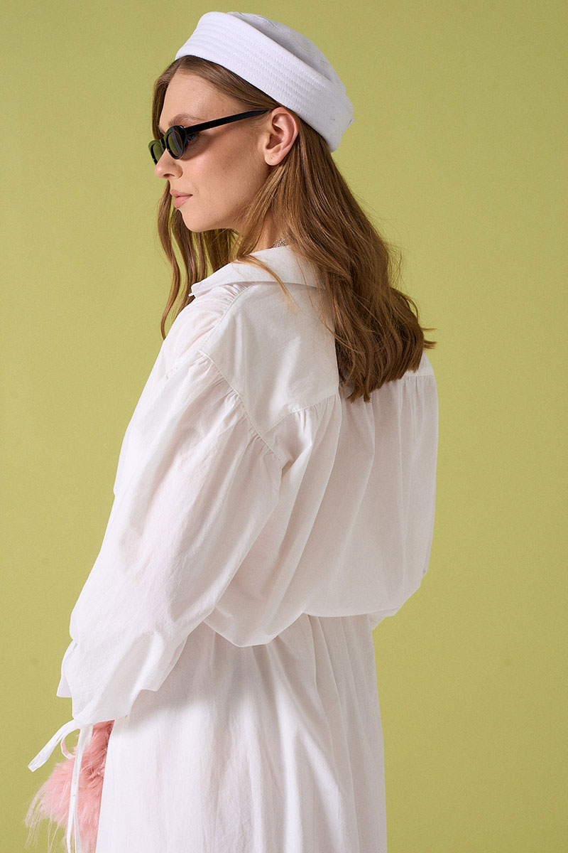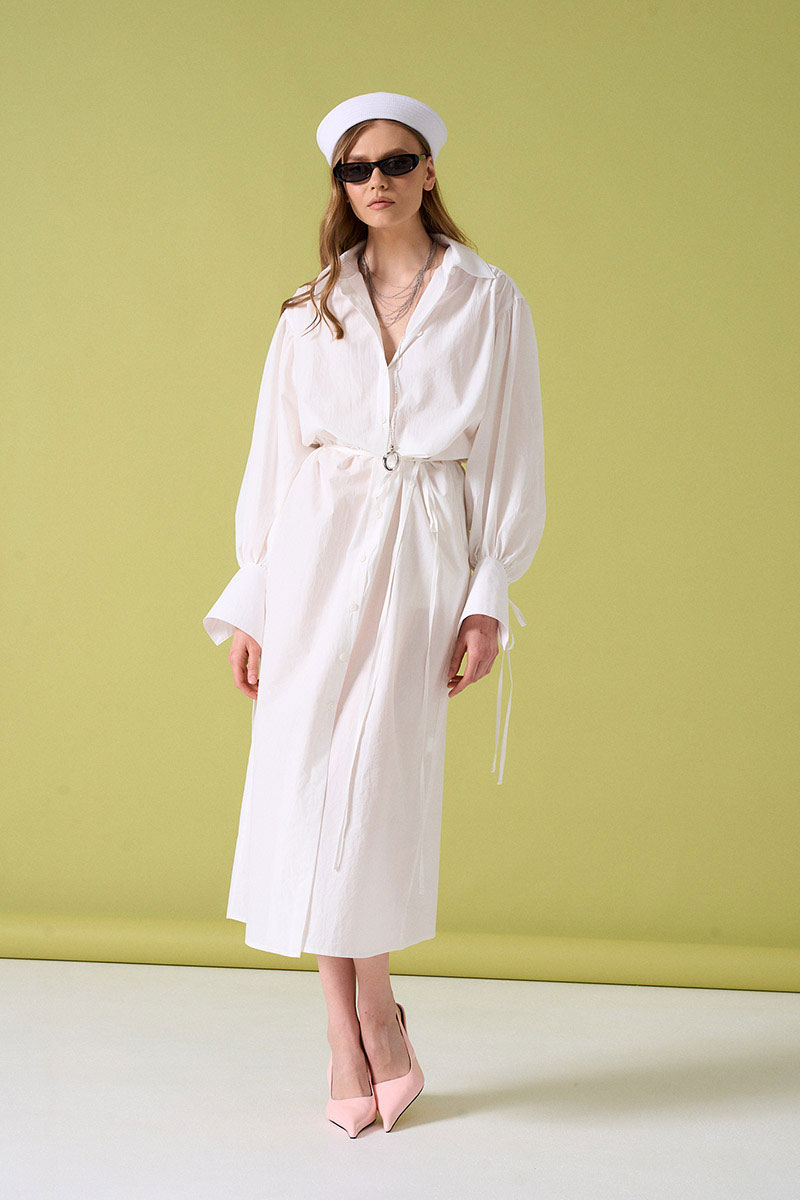 Платье - рубашка из хлопковой ткани. Объёмные рукава с акцентной манжетой на завязках (их можно подвернуть). Съёмный пояс.