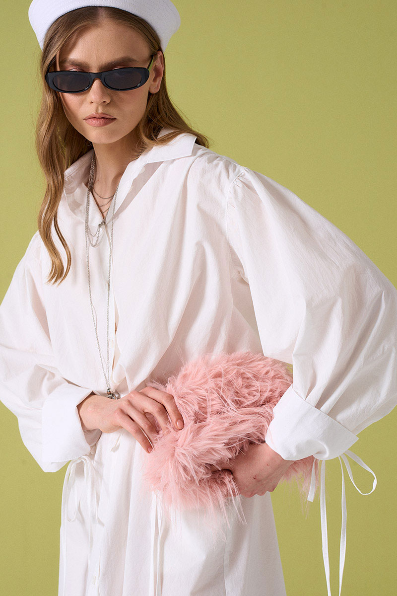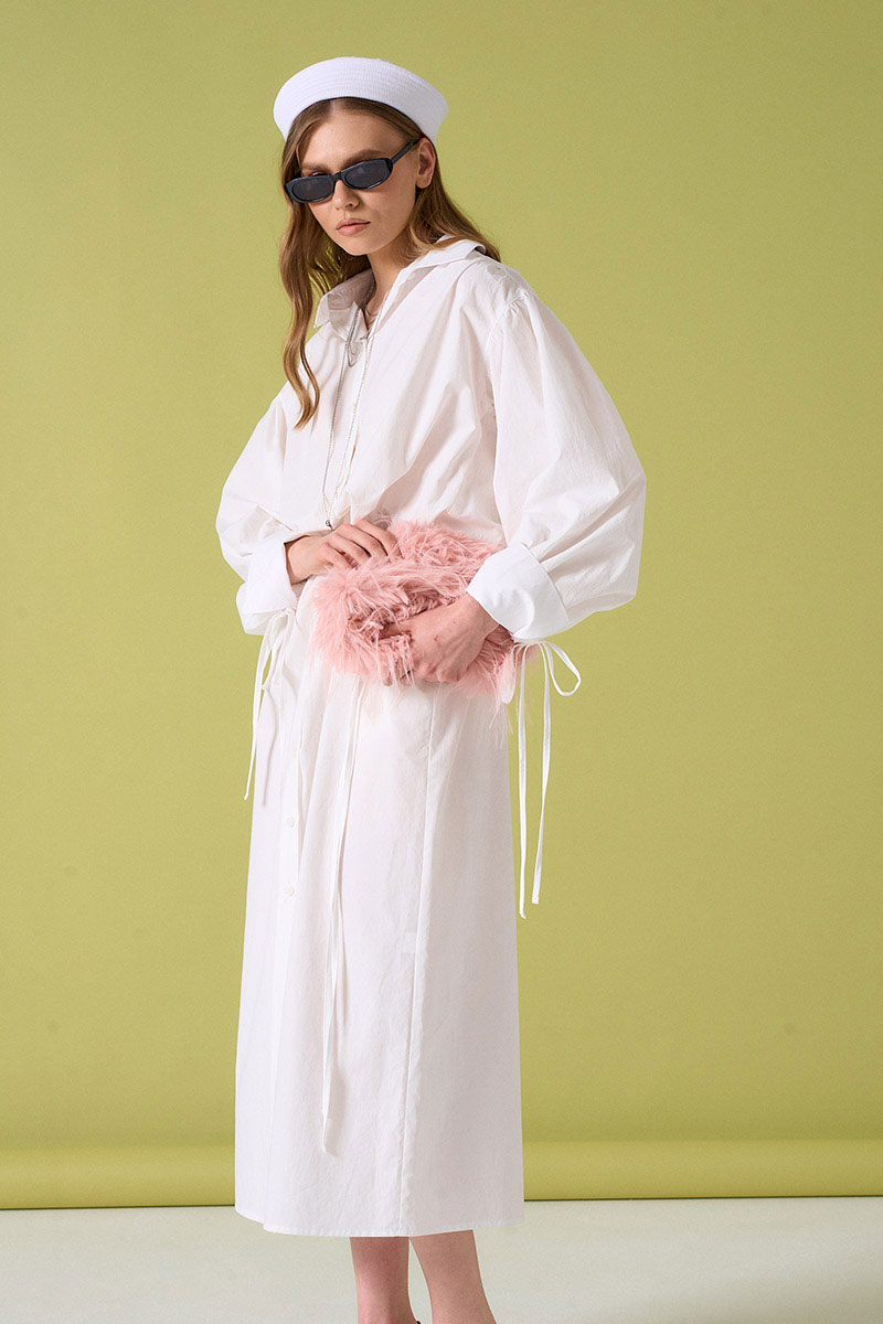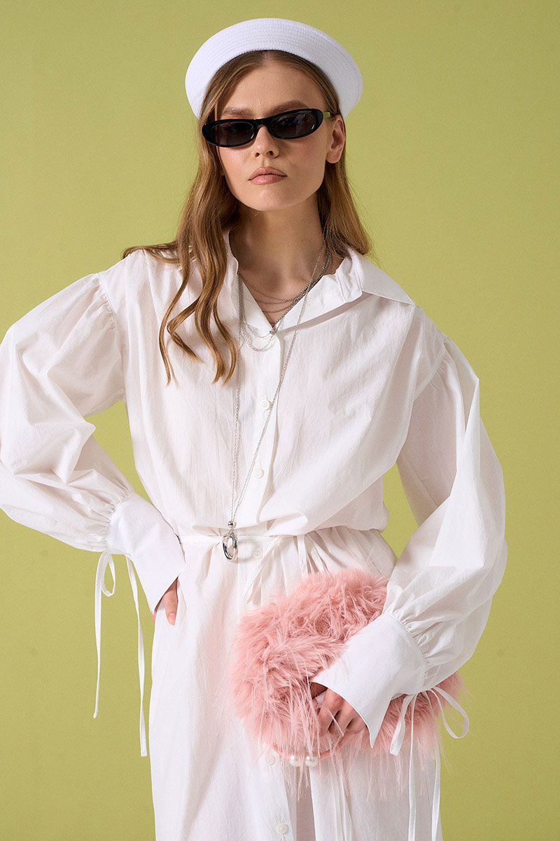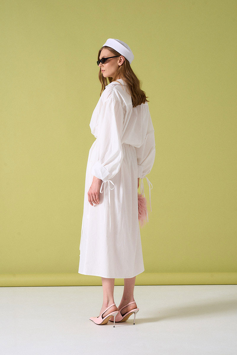 Платье - рубашка из хлопковой ткани. Объёмные рукава с акцентной манжетой на завязках (их можно подвернуть). Съёмный пояс.