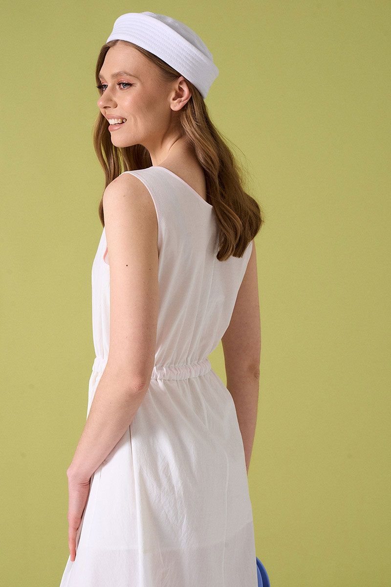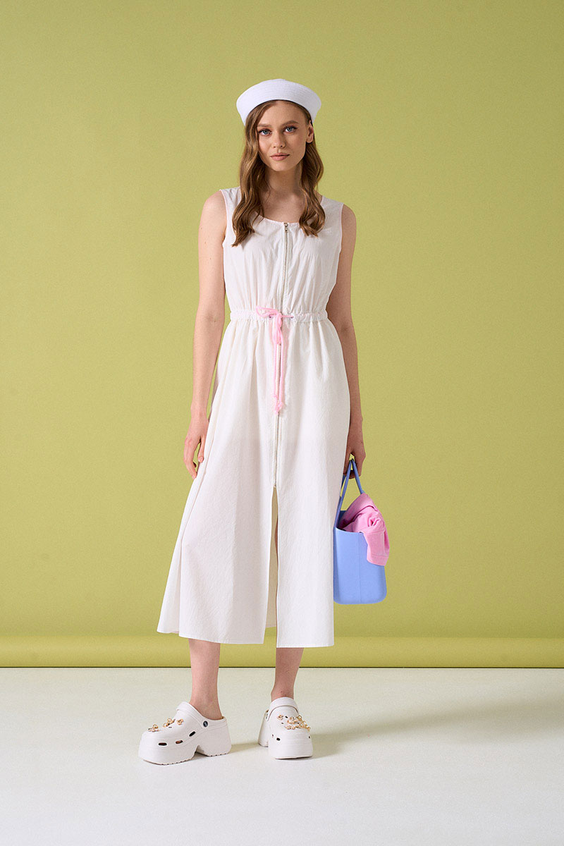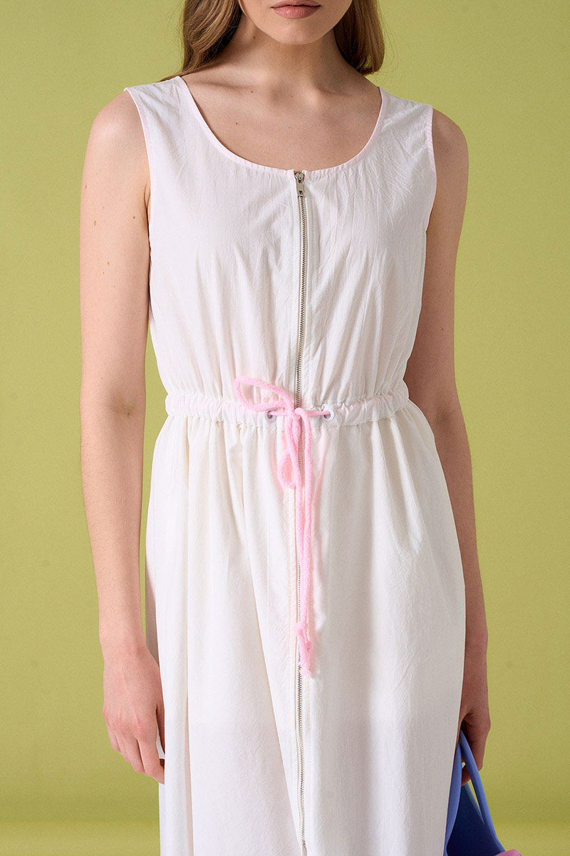Платье из хлопковой ткани на молнии. Пояс на кулисе с резинкой и крупным розовым шнуром. Внутренние швы обработаны контрастной розовой тканью. В боковых швах карманы.