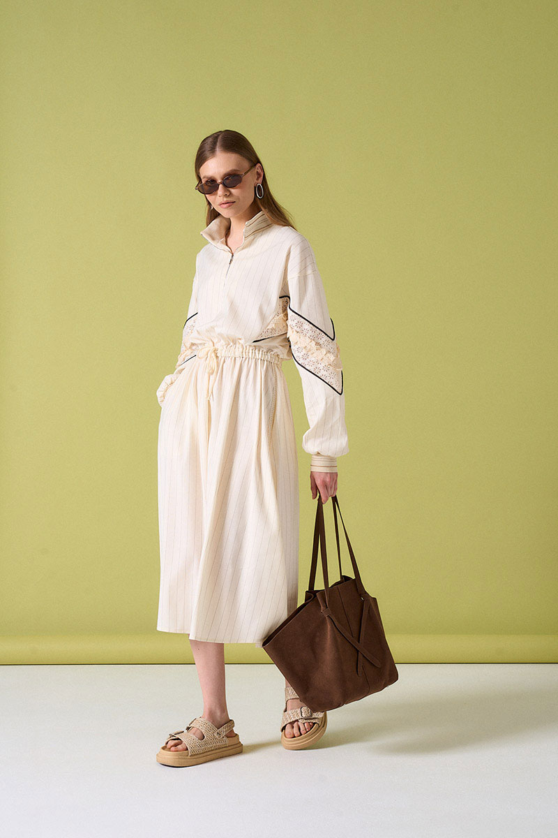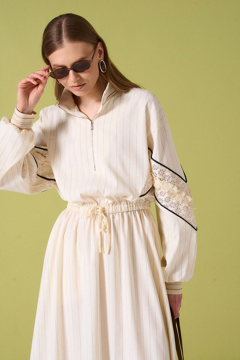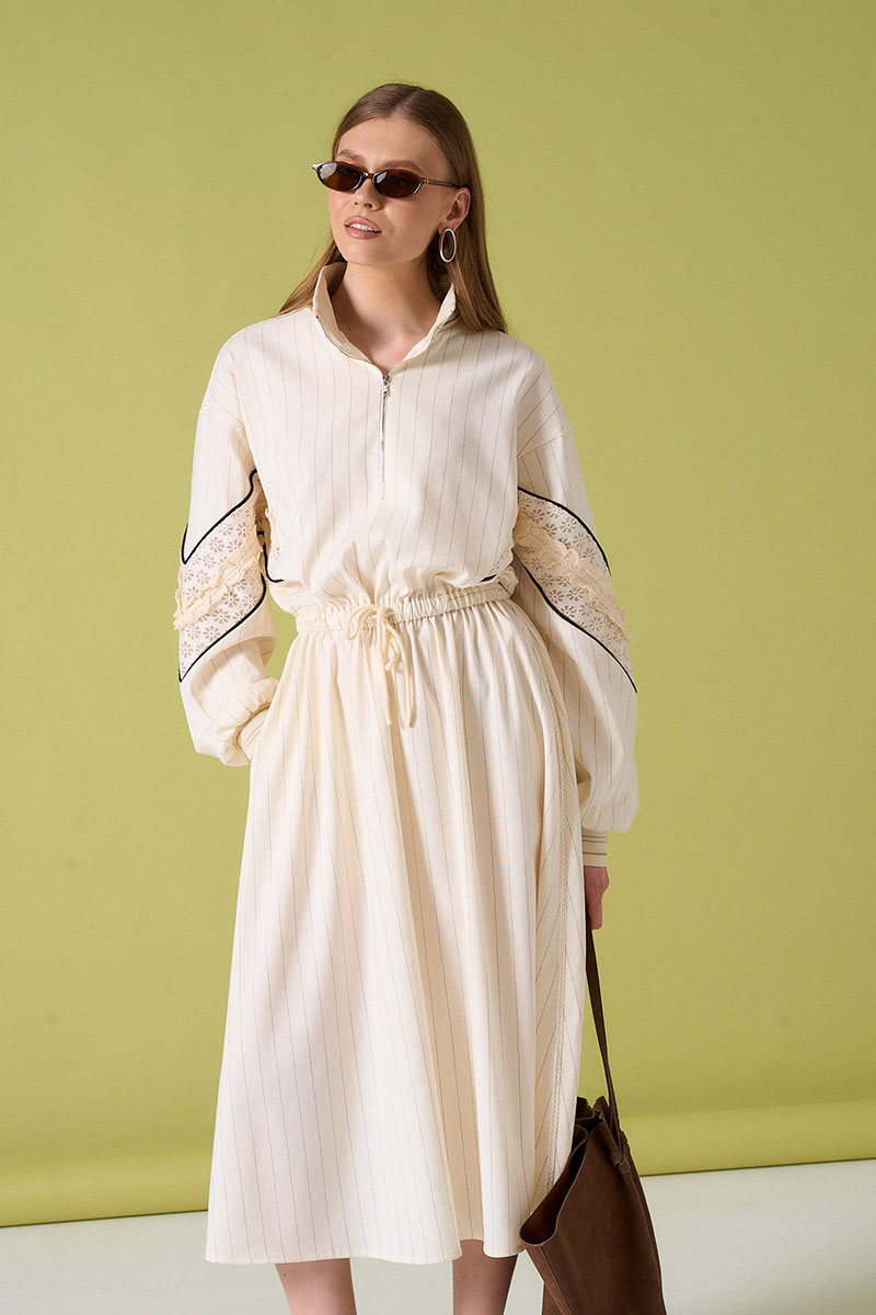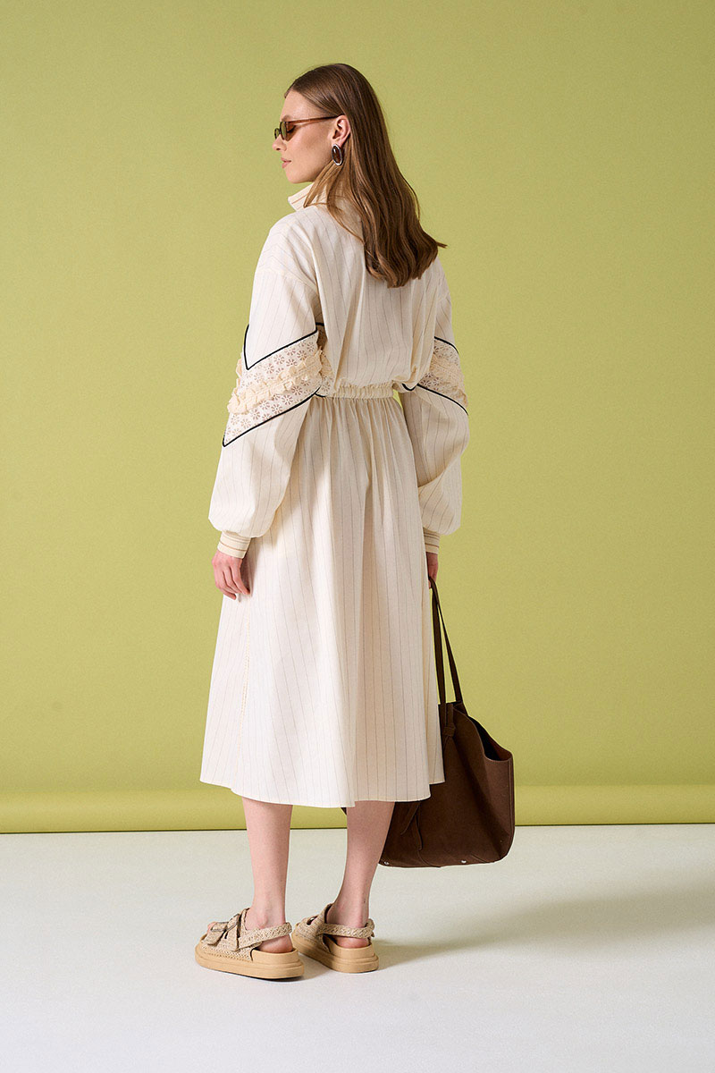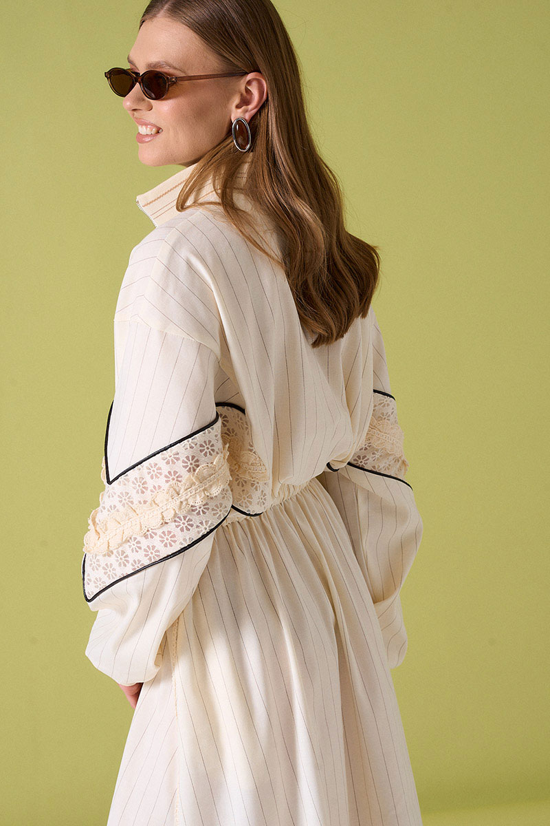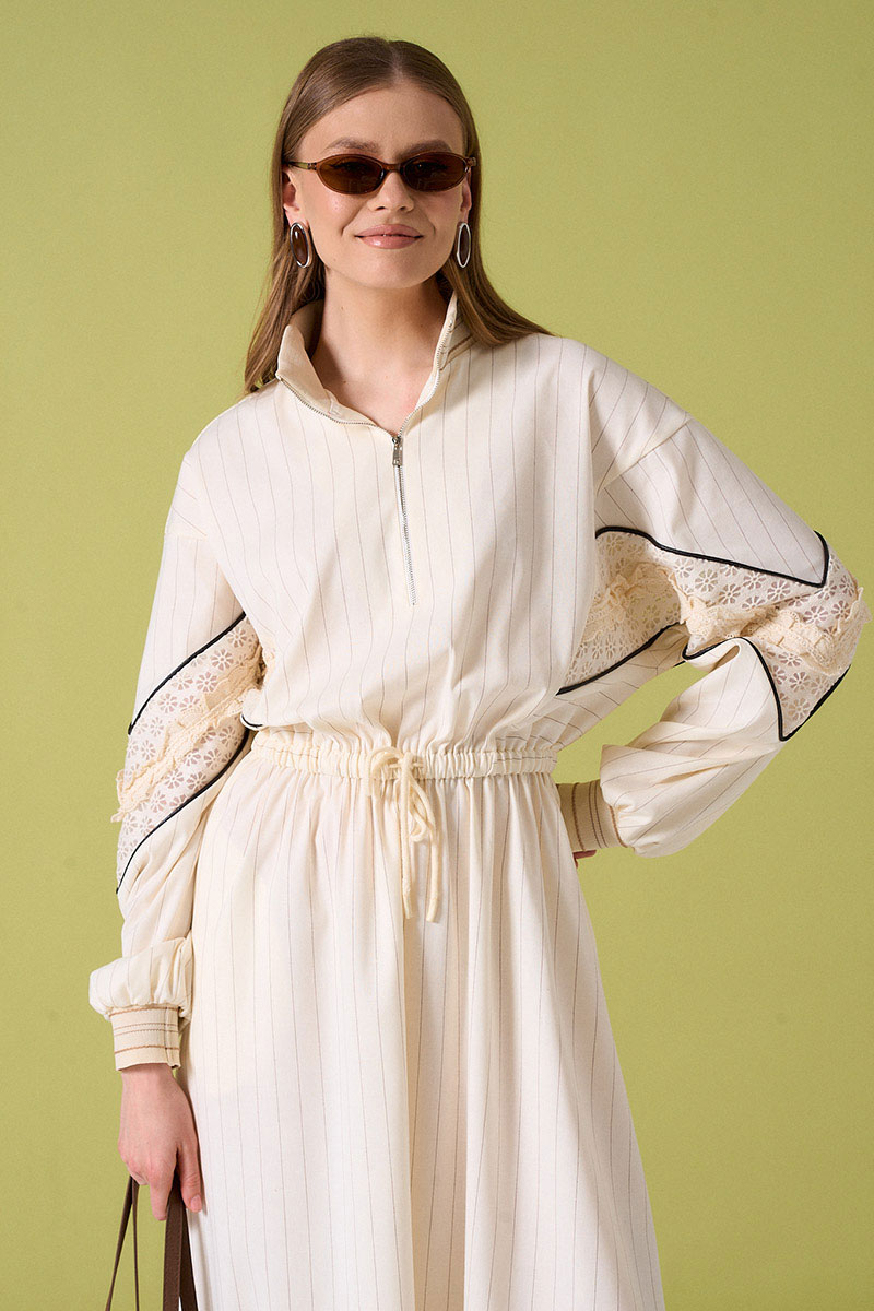 Платье из льняной ткани с кулисой по талии. Рукав с кружевной тканью и декоративными элементами. Воротник и низ рукава на довязе. Не колется.