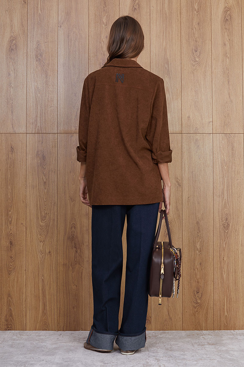 Рубашка прямого силуэта, в стиле 80-х, длиной ниже бедра, выполнена из вельвета. Центральная застежка доверху на петли и брендированные кнопки. Накладные фигурные карманы с клапанами на полочках изделия. Втачной длинный рукав. Рукав снизу на притачной манжете. Спинка с отрезной кокеткой. Рубашечный воротник на стойке.