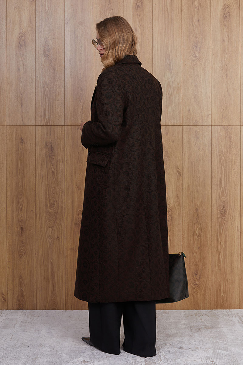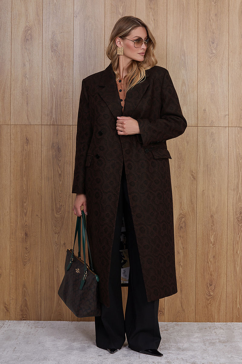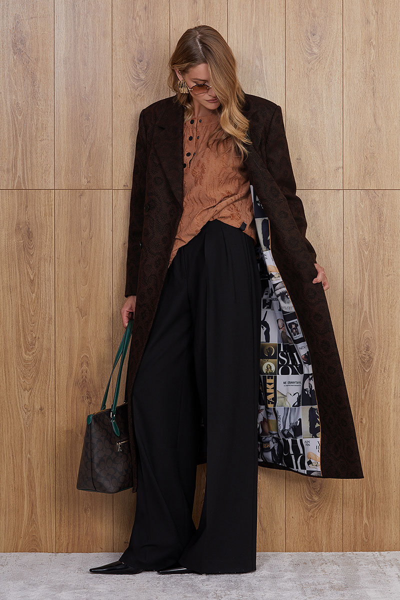 Fashion пальто oversize, выполнено из премиальной, шерстяной пальтовой ткани. Пальто теплое, подходит для очень холодной осени. Прямой силуэт, выполнен по типу “мужской пиджак”. Усиленная строгая линия плеча. Изделие с двубортной застежкой на 4 петли и пуговицы. Воротник пиджачного типа. На полочках нагрудные вытачки, прорезные карманы в рамку с клапанами. Борта прямые. По спинке средний шов и шлица. Длина до середины икры. Рукав втачной, двухшовный. Низ рукава со шлицей и декоративными пуговицами. Изделие на авторской подкладке.