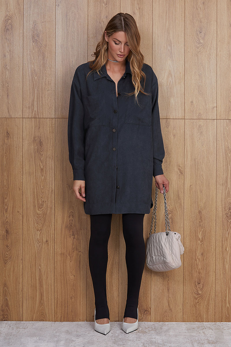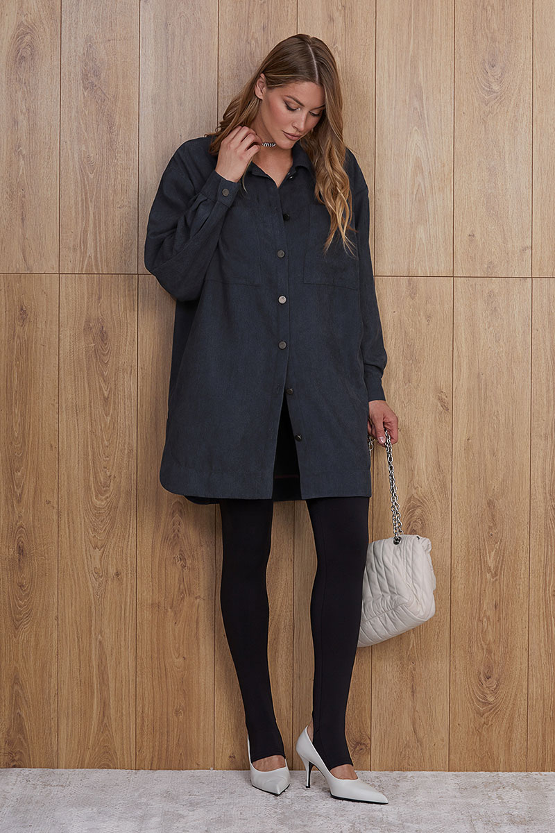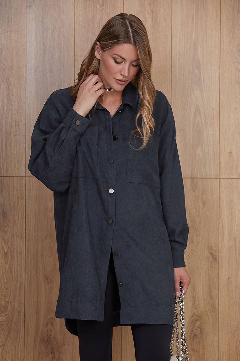 Рубашка прямого силуэта длиной ниже линии бедра, выполнена из вельвета. Центральная застежка доверху на пуговицы. Накладные карманы на передних половинках изделия. Отрезная кокетка по спинке. Спущенная линия плеча, свободный рубашечный рукав со складками внизу. Рукав на притачной манжете.