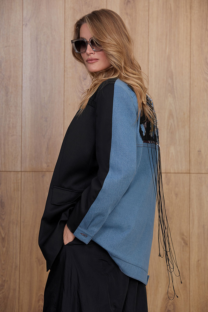 Стильный расслабленный жакет прямого силуэта на вискозной авторской подкладке. Изделие комбинированное. Спереди выполнен в виде жакета, сзади в виде джинсовой куртки. Изделие с центральной бортовой застежкой на петли и пуговицы. Длина до середины бедра. Воротник пиджачного типа. На полочках нагрудные вытачки, прорезные карманы в рамку и клапаны. Борта прямые. Спинка прямая с отрезной кокеткой и притачной планкой внизу. Втачной длинный комбинированный рукав со шлицей и декоративными петлями.