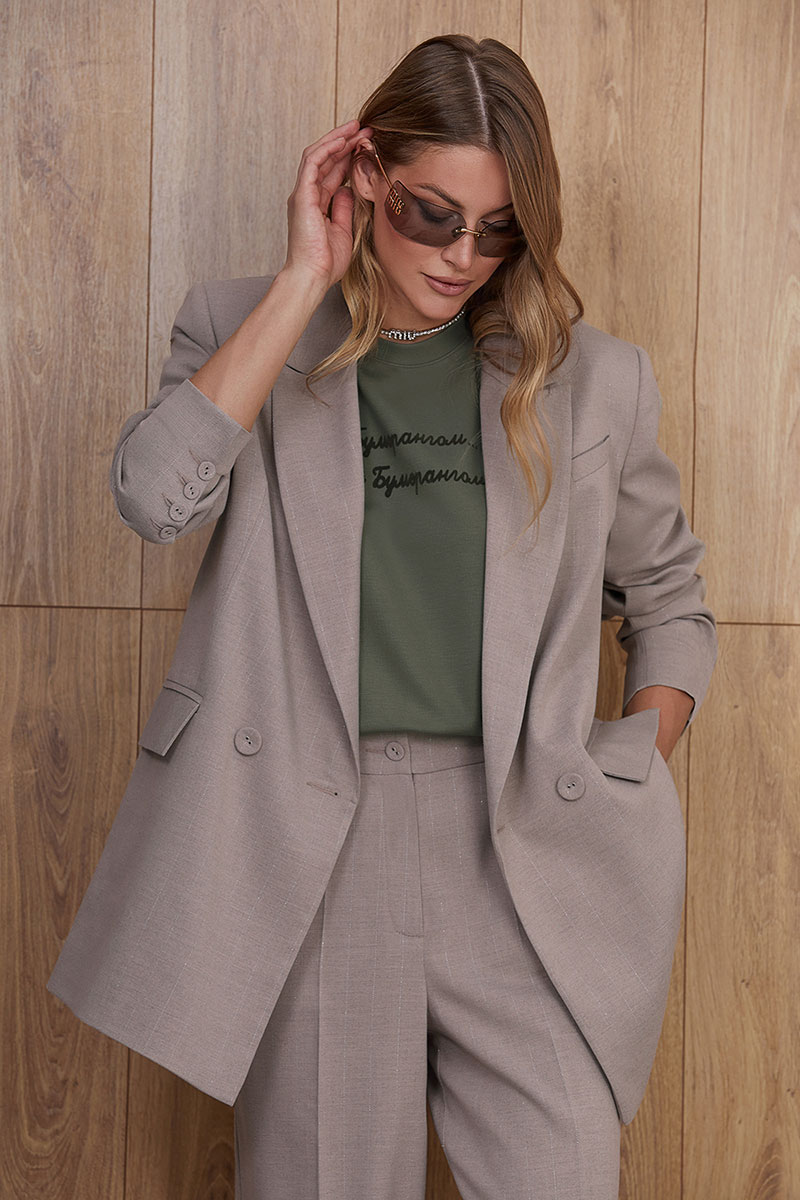 Жакет прямого силуэта, выполнен из смесовой ткани на авторской вискозной подкладке. Жакет прямой, выполнен по типу “мужской пиджак”. Усиленное удлиненное плечо. Изделие с двубортной застежкой на 2 петли и пуговицы. Воротник пиджачного типа. На полочках нагрудные вытачки, прорезные карманы в рамку и клапаны, декоративный прорезной карман с листочкой на верхней левой полке жакета. Борта прямые. Спинка прямая без среднего шва. По спине выполнены вертикальные рельефы, которые заканчиваются шлицами. Рукав втачной , двухшовный. Низ рукава со шлицей и декоративными пуговицами.