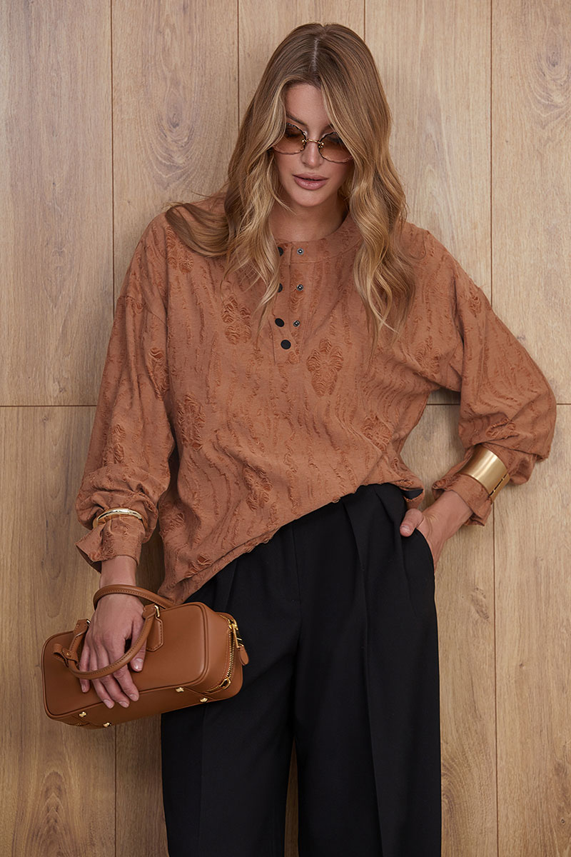 Прямые брюки-палаццо из смесовой ткани с добавлением вискозы. Брюки на поясе. Функциональные прорезные карманы в рамку в боковых швах. Сзади прорезные карманы в рамку – обманки. По переду по две глубокие односторонние складки.