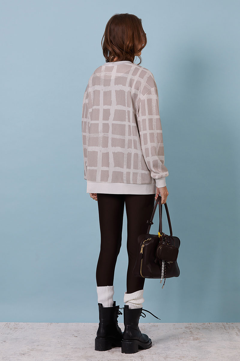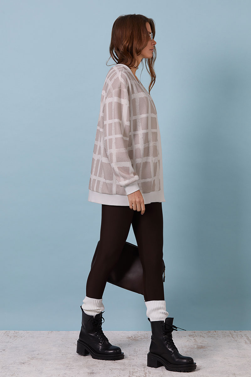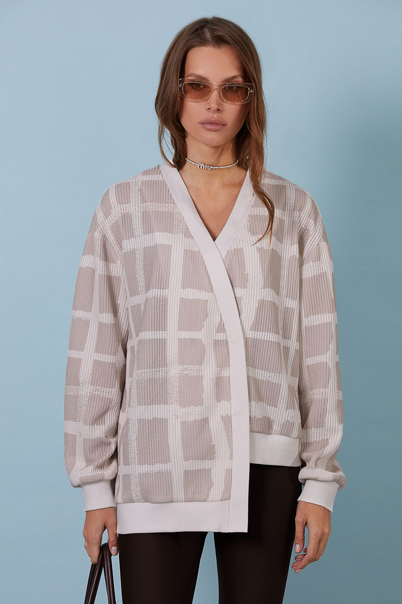 Кардиган прямого силуэта, ассиметричная двубортная застежка на потайные пришивные кнопки. V-образный вырез горловины. Спущенная линия плеча .Объемный длинный рукав на притачной манжете из отделочной ткани. Перед и спинка изделия прямые. По переду притачная планка из отделочной ткани. Низ также на притачной планке из отделочной ткани. Низ ассиметричный.