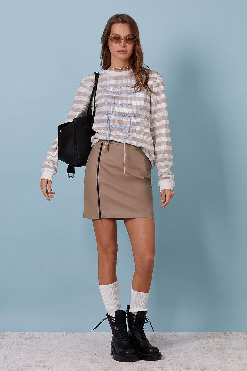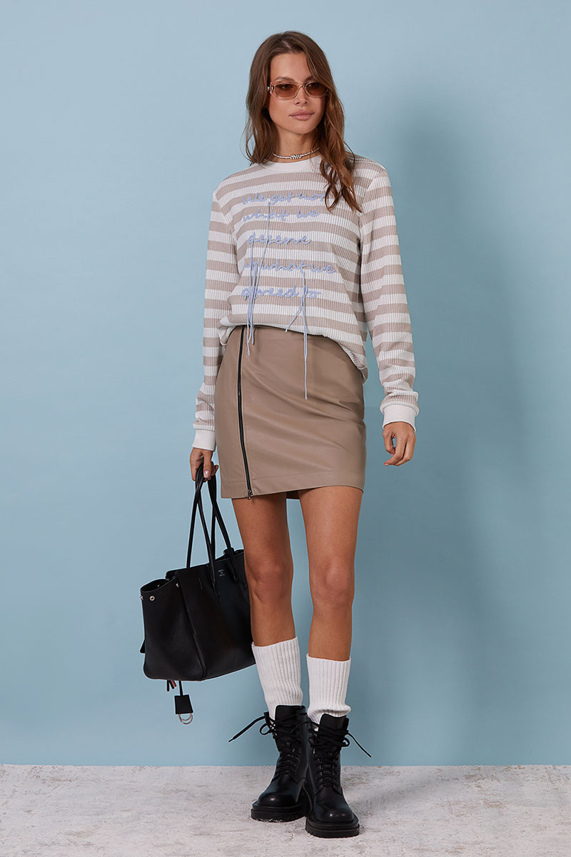Джемпер свободного силуэта - "Oversize", выполнен из трикотажного вискозного полотна полоску. Чуть спущенная линия плеча. Рукав длинный, низ рукава на притачной манжете из отделочной ткани. Перед и спина прямые. Горловина круглая, с притачной планкой, выполненной из отделочной ткани (довяз). По переду авторская вышивка.