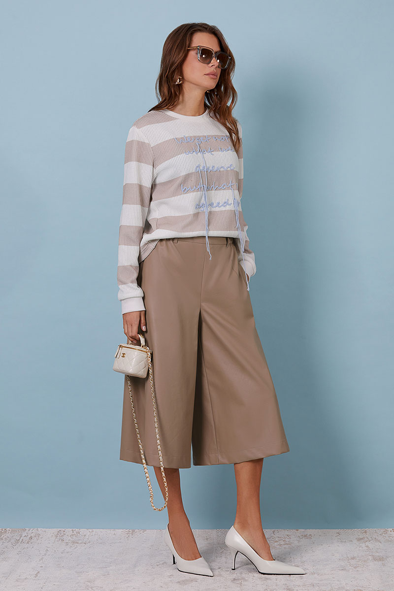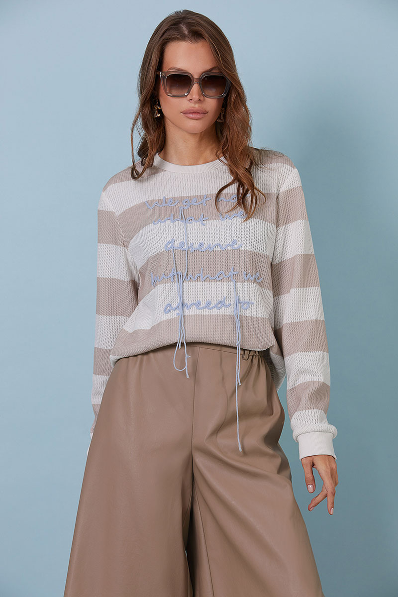 Джемпер свободного силуэта - "Oversize", выполнен из трикотажного вискозного полотна полоску. Чуть спущенная линия плеча. Рукав длинный, низ рукава на притачной манжете из отделочной ткани. Перед и спина прямые. Горловина круглая, с притачной планкой, выполненной из отделочной ткани (довяз). По переду авторская вышивка.