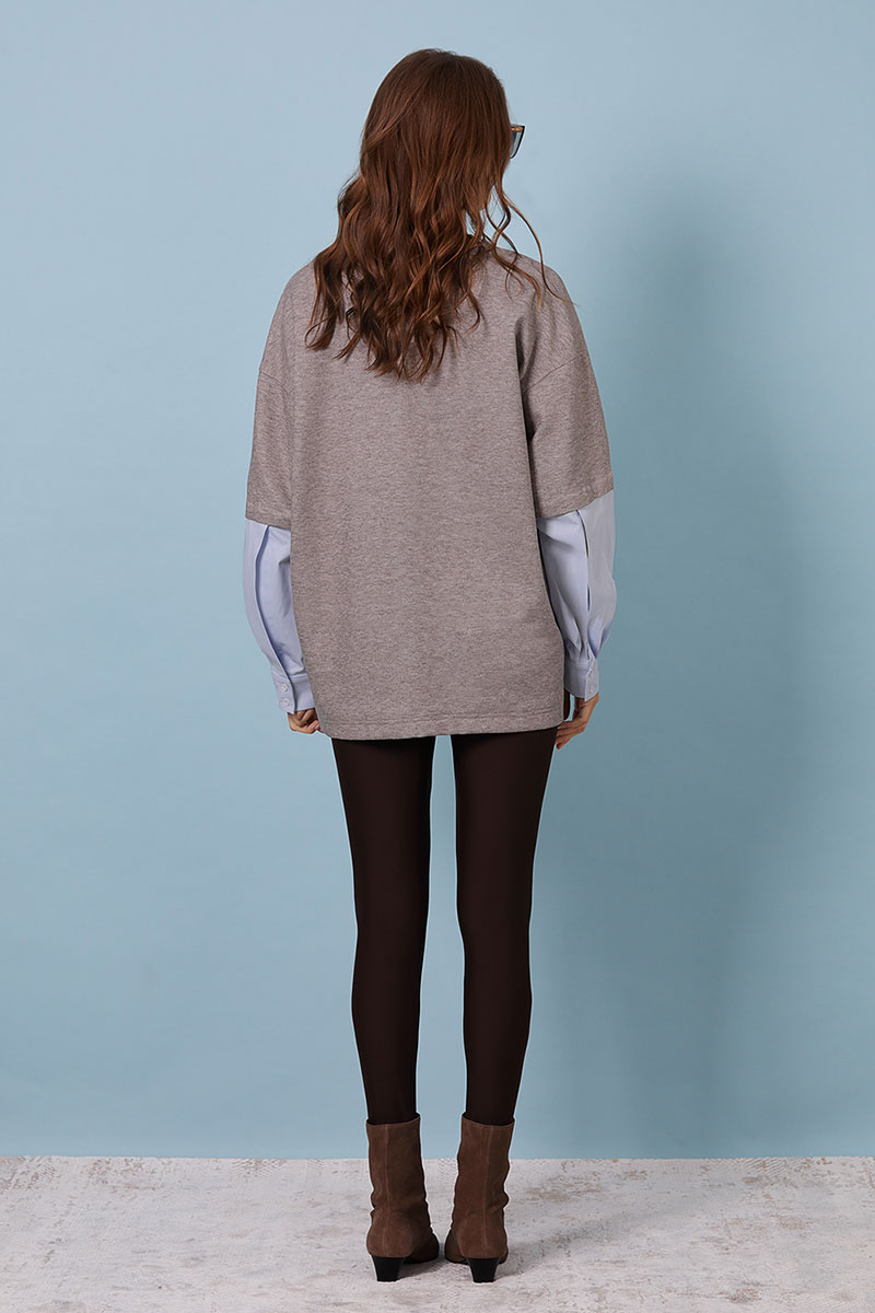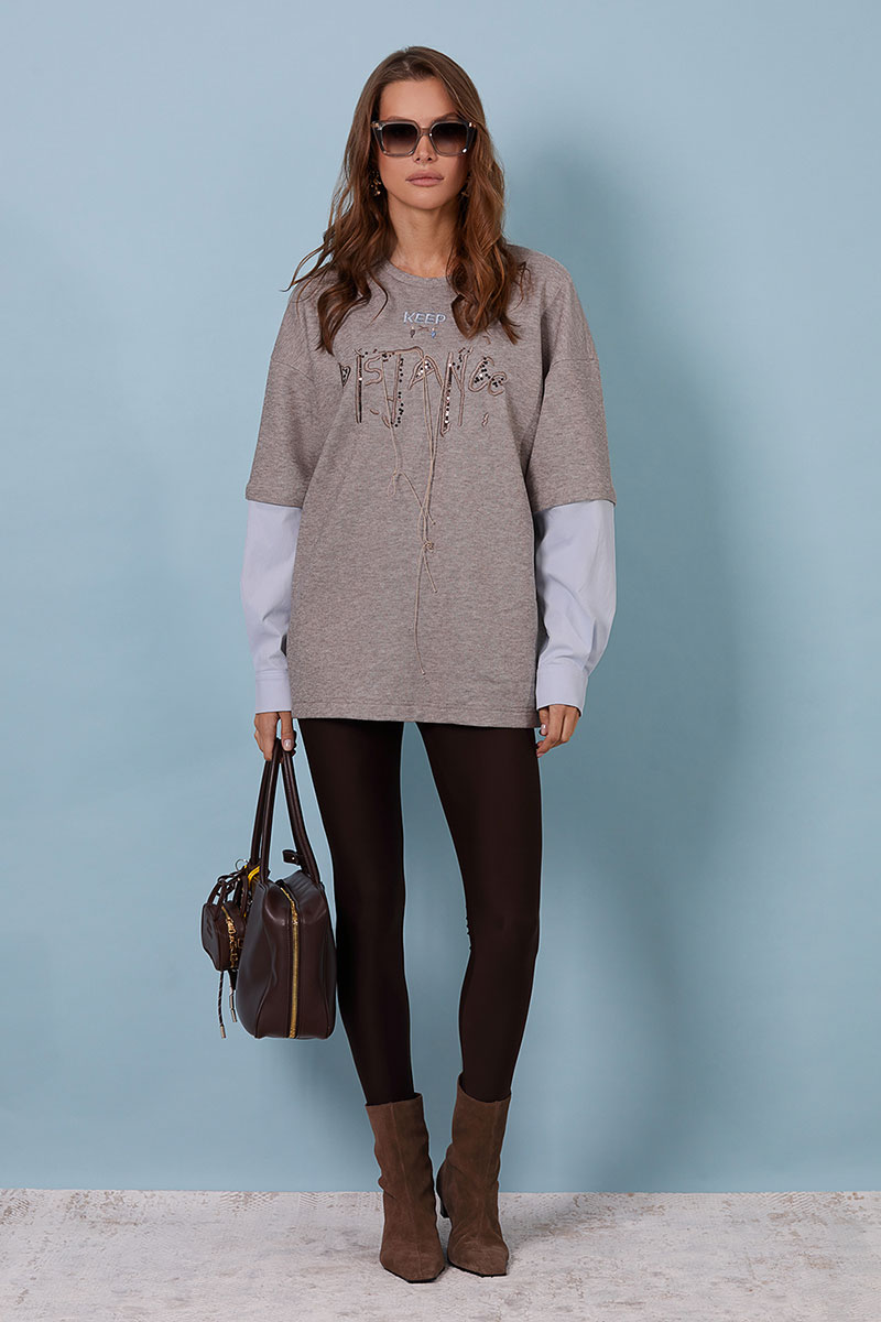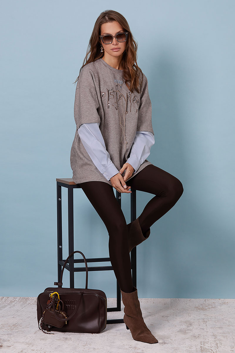 Удлиненная блуза, выполнена из плотного трикотажного вискозного полотна с напылением.