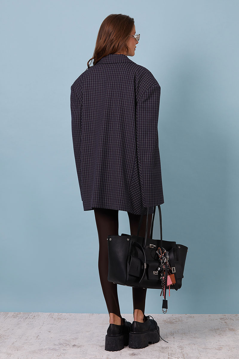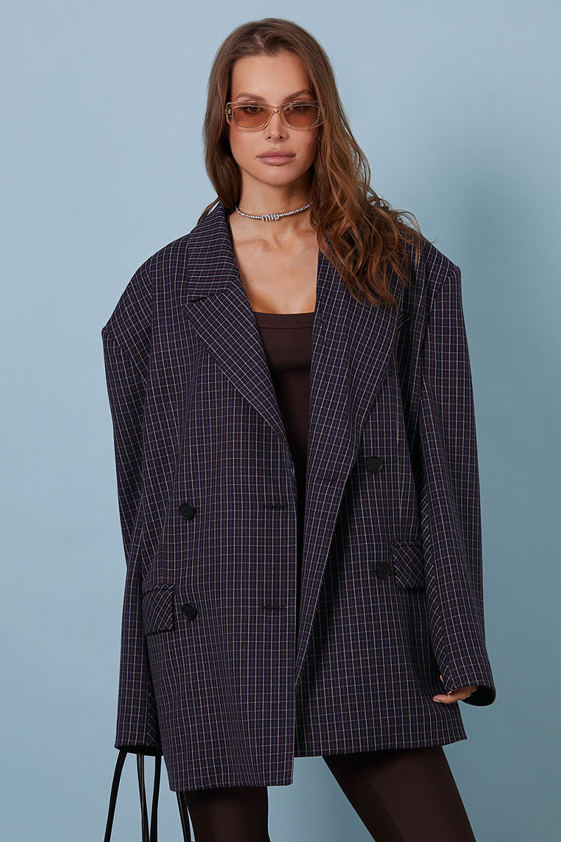 Жакет прямого силуэта, выполнен из костюмной ткани на авторской вискозной подкладке. Жакет прямой, выполнен по типу “мужской пиджак”. Усиленное удлиненное плечо. Изделие с двубортной застежкой на 4 петли и пуговицы. Воротник пиджачного типа. На полочках нагрудные вытачки, прорезные карманы в рамку и клапаны, декоративный прорезной карман с листачкой на верхней левой полке жакета. Борта прямые. Спинка прямая со средним швом. Рукав прямой, двухшовный.