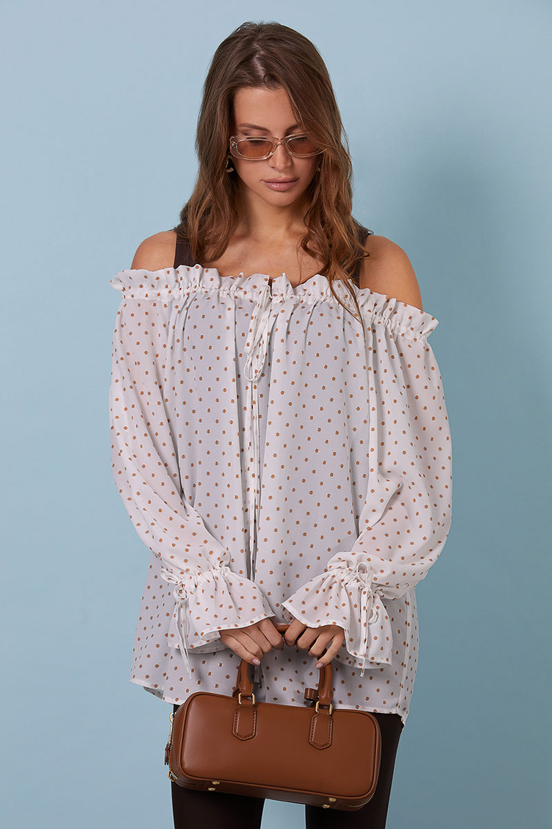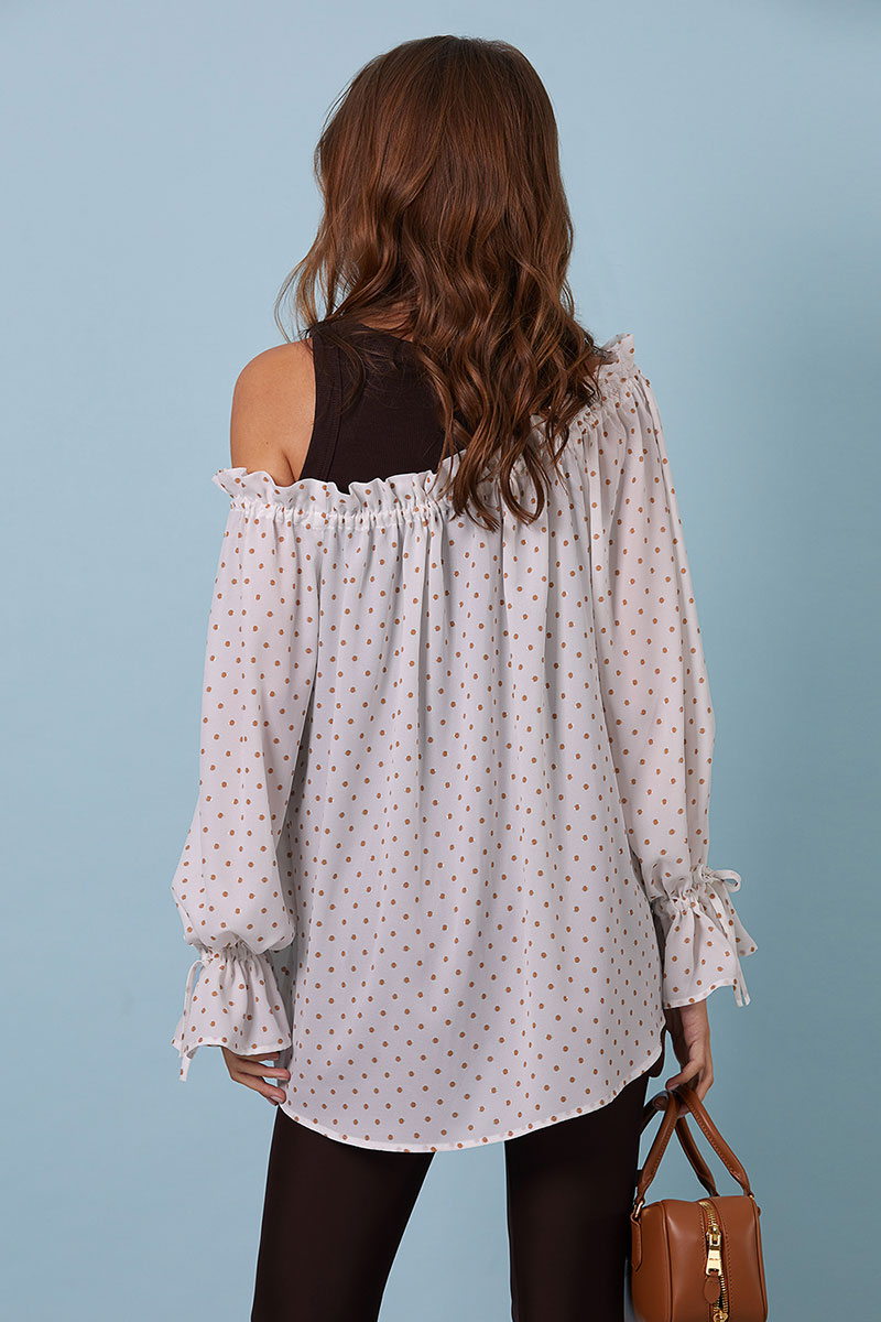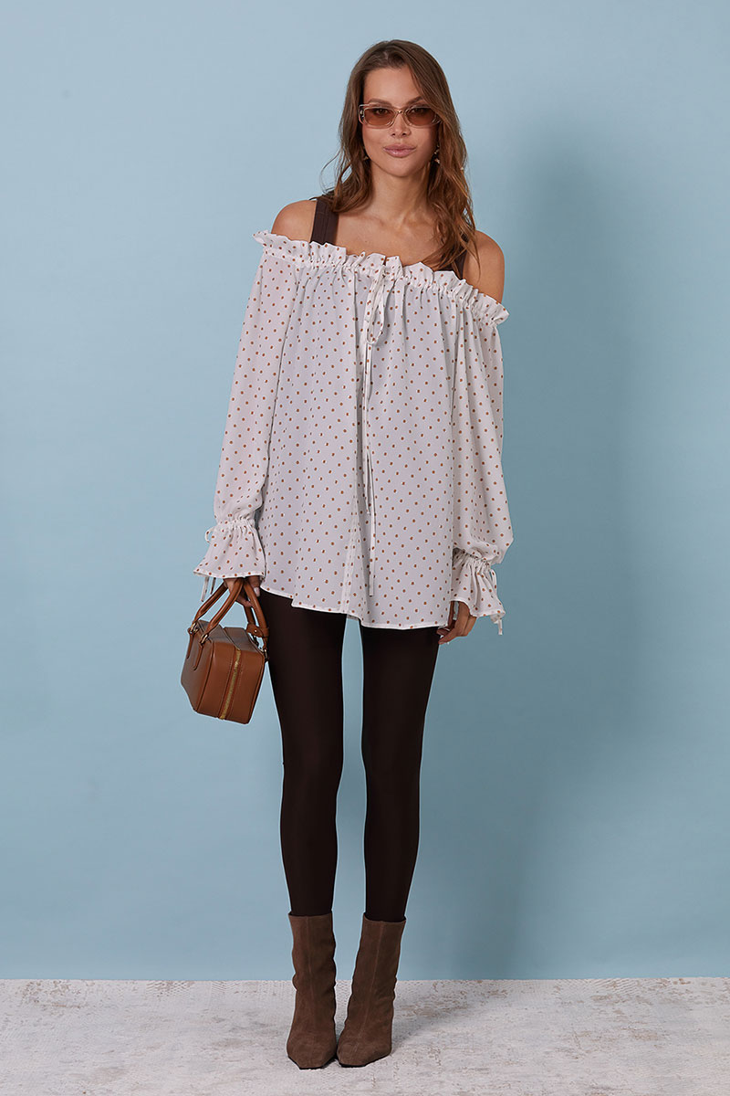 Блуза выполнена из крепа. Объемная изящная блуза. Длинный свободный рукав. Сверху изделие фиксируется на кулису, дополнительно сзади вставлена резинка.