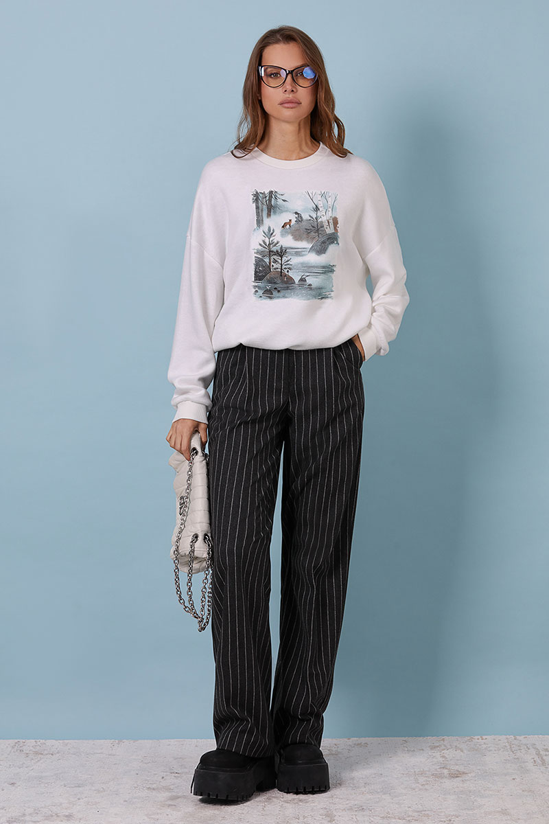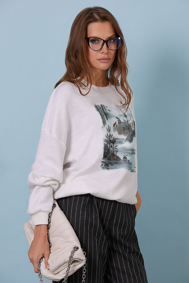 Объемный свитшот из мягкого вискозного трикотажного полотна. Изделие прямое. Горловина круглая с притачной планкой из отделочной ткани. Спущенная линия плеча. Рукав ,длинный. Низ рукава на манжете из отделочной ткани. Низ изделия прямой. Перед и спинка изделия прямые. На передней половинке свитшота авторский принт.