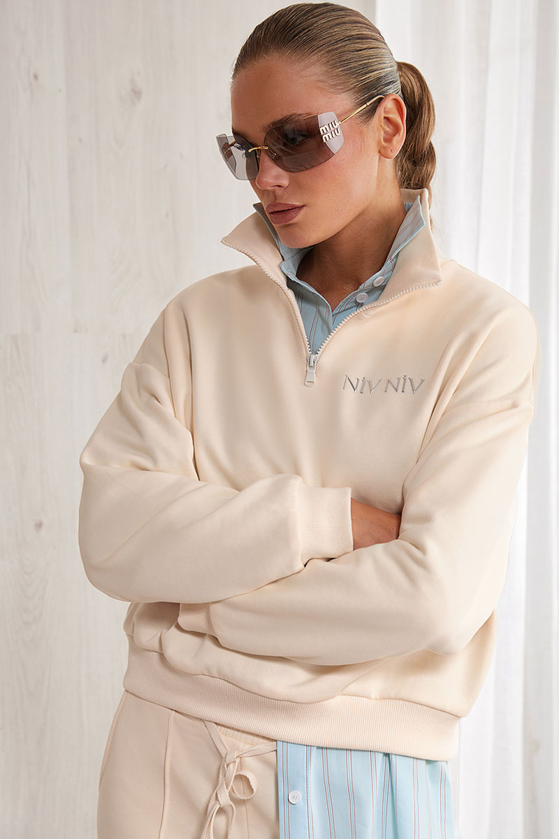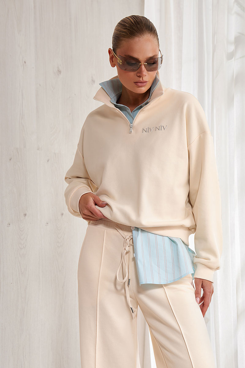 Свитшот прямого силуэта, перед и спинка изделия прямые, спущенная линия плеча. Горловина - высокая стойка на молнии. Низ рукава и низ изделия на притачной манжете. Лого на полочке изделия.