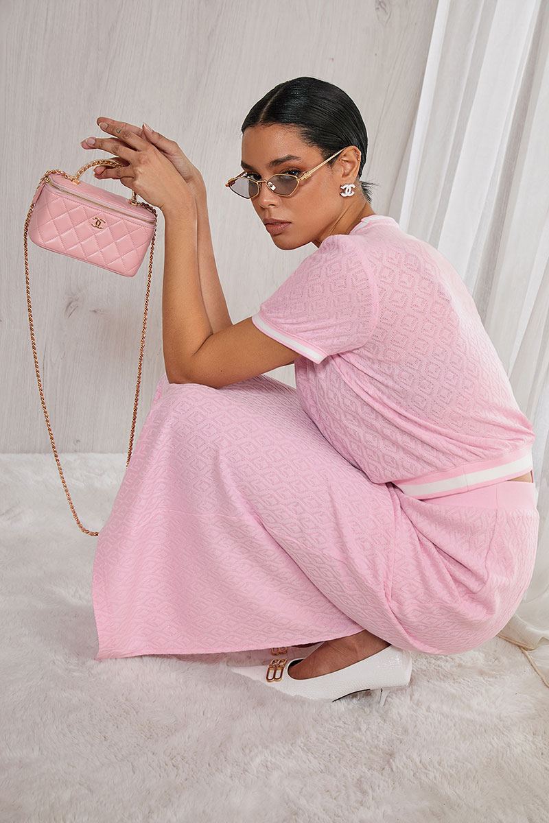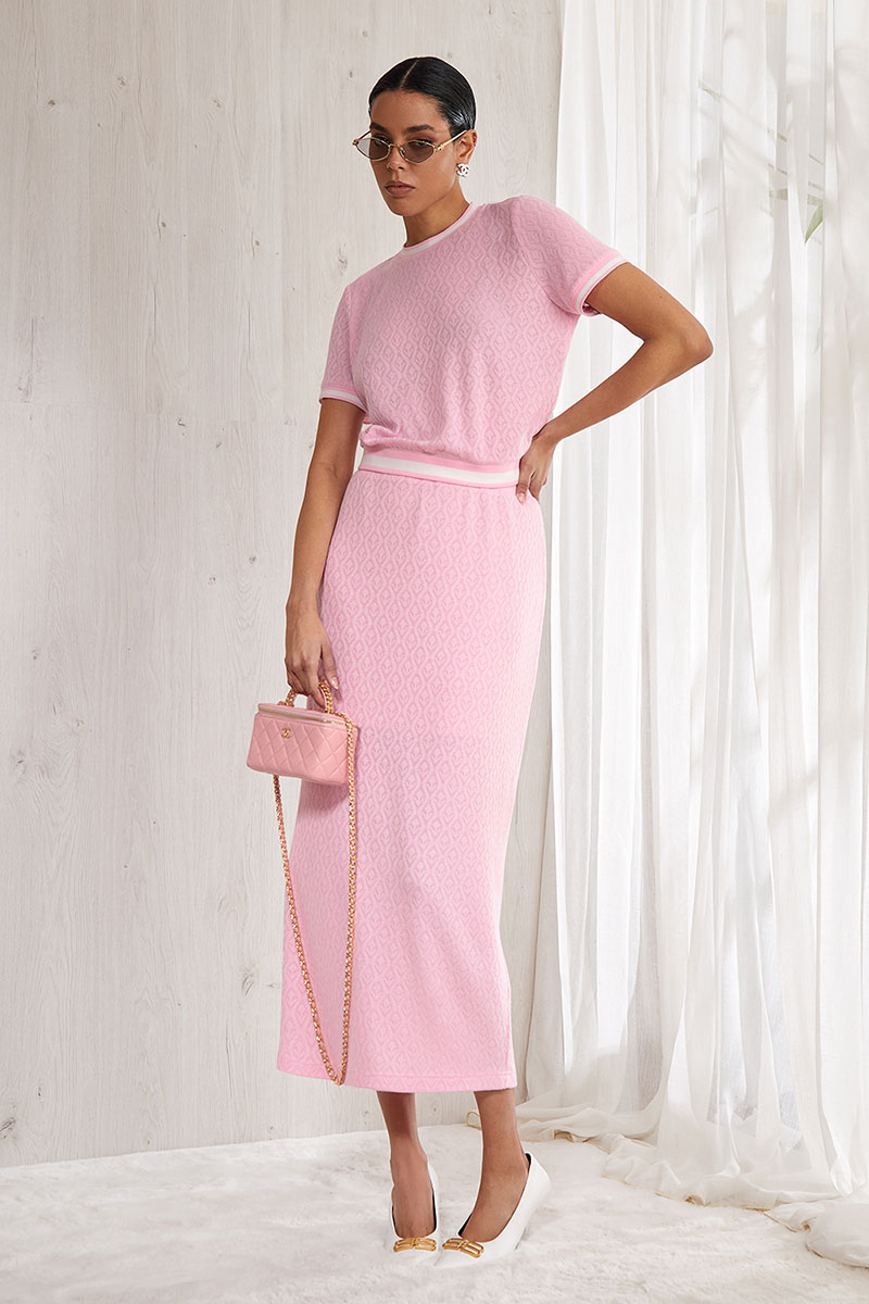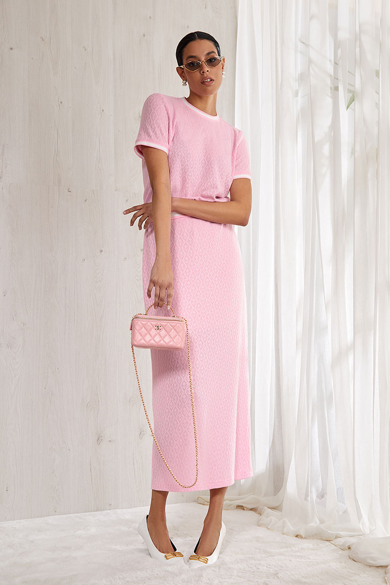 Стильный костюм, состоящий из юбки и джемпера, выполнен из тонкого кружевного вискозного полотна.