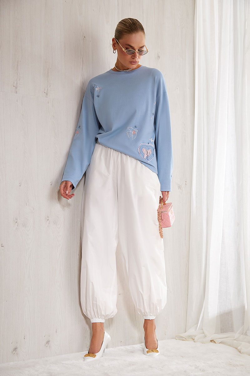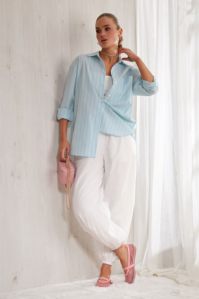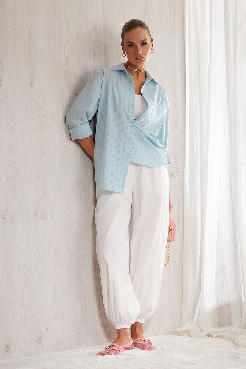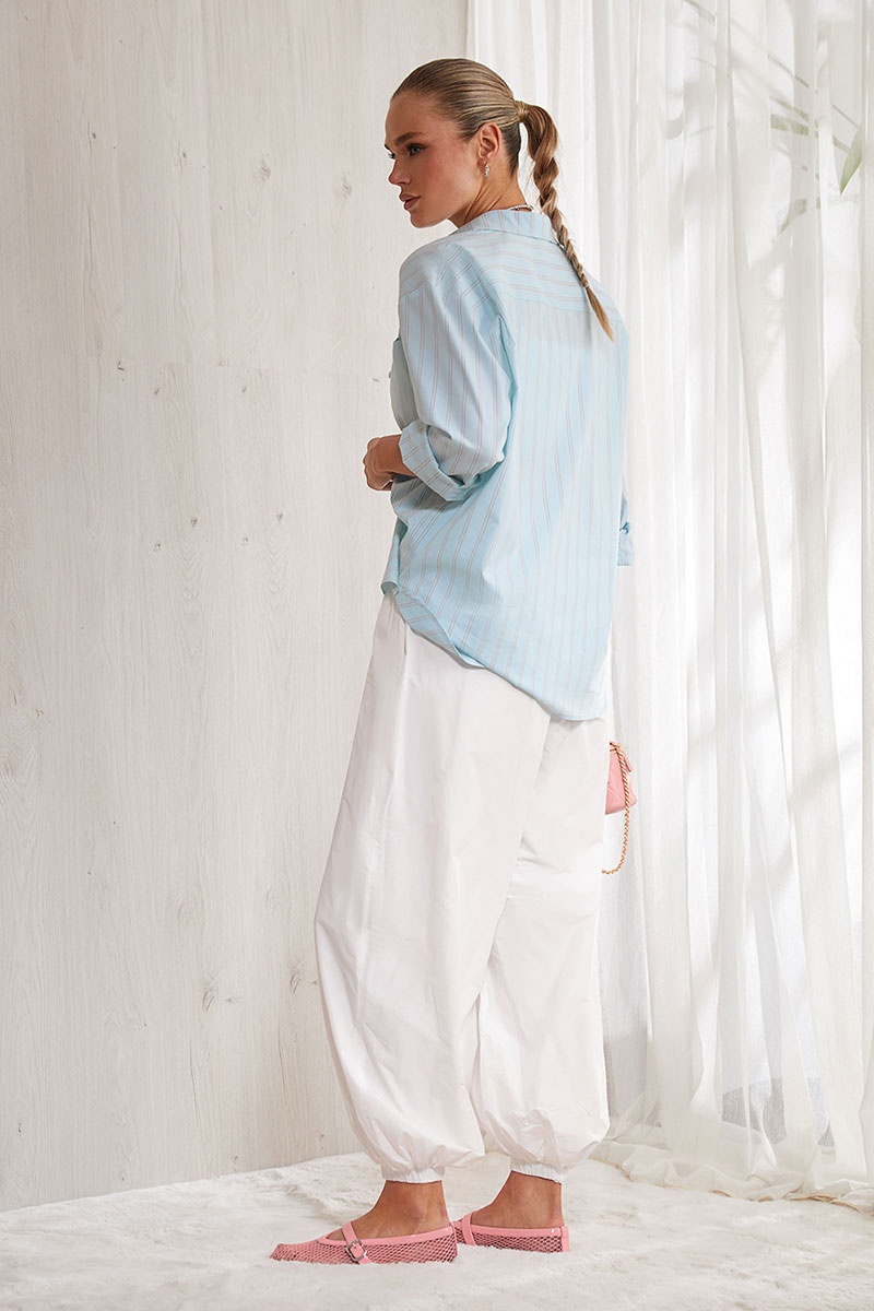 Брюки-алладины выполнены из шуршащего хлопка. Главный тренд сезона 2026.