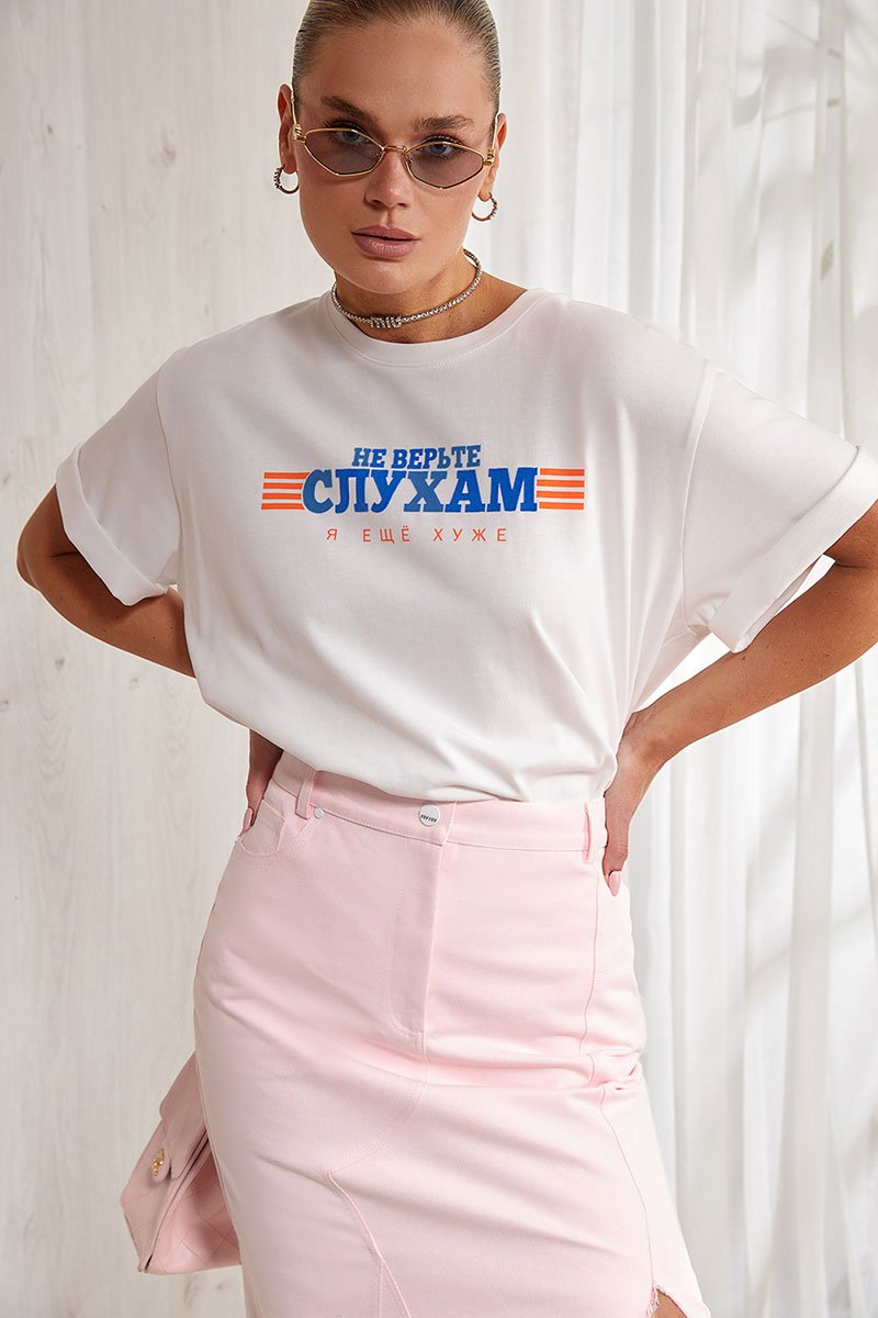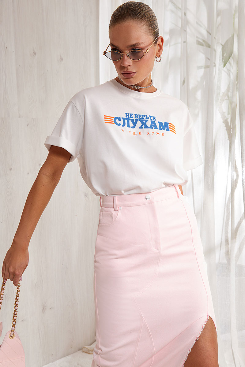 Джинсовая юбка длина midi. Юбка на поясе со шлевками, немного зауженная книзу. Застежка спереди. Карманы и фигурные вертикальные подрезы на передних половинках, в одном из которых выполнен разрез с необработанным краем. Сзади в юбке средний шов, фигурная кокетка и накладные карманы. Низ изделия не обработан.
